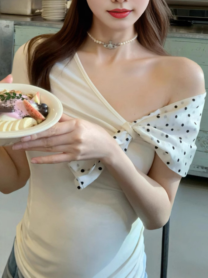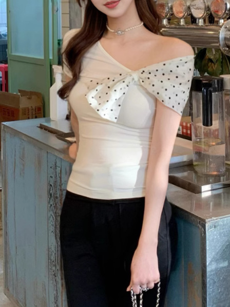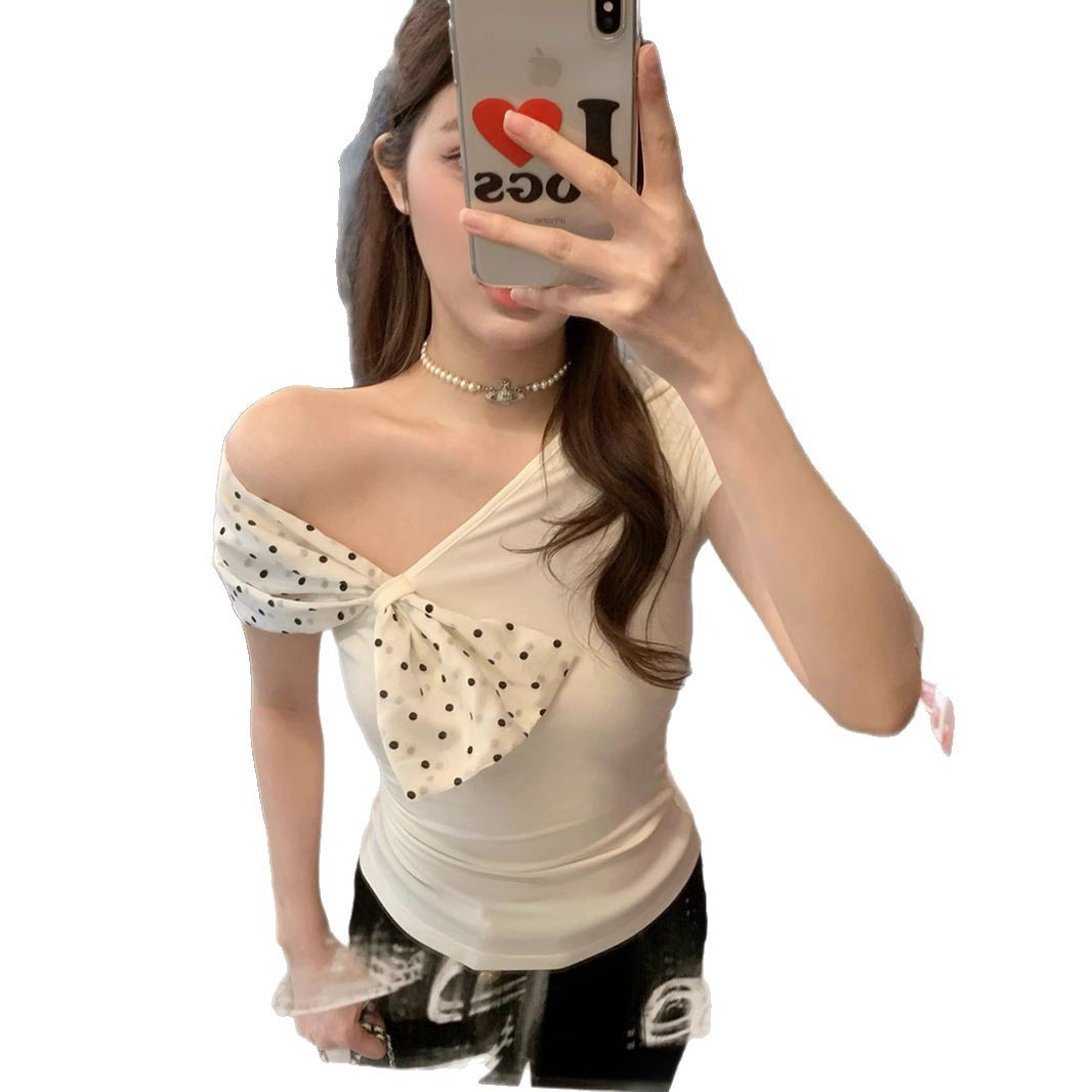 화이트 프랑스 패션 폴로 도트 오브리크 칼라 오프 숄더 반팔 티셔츠 여성용 작은 독특한 불규칙한 짧은 탑 트렌디