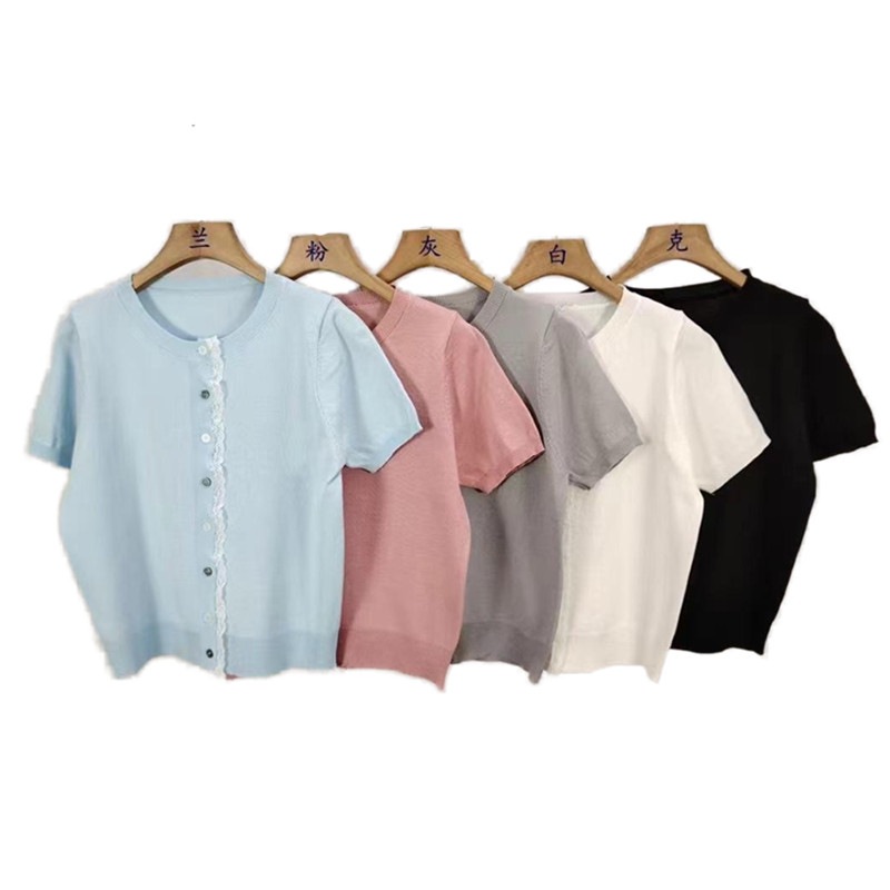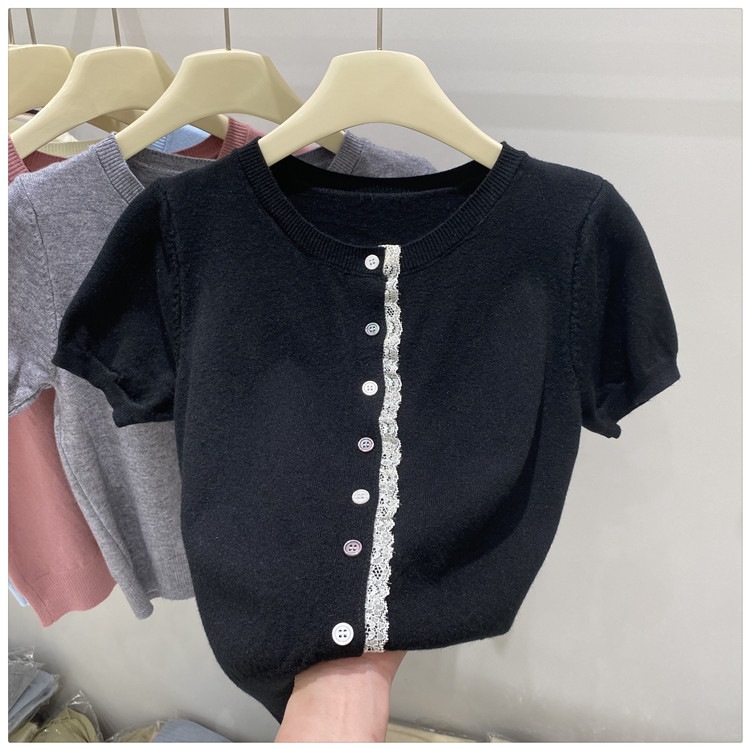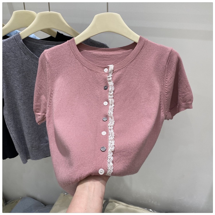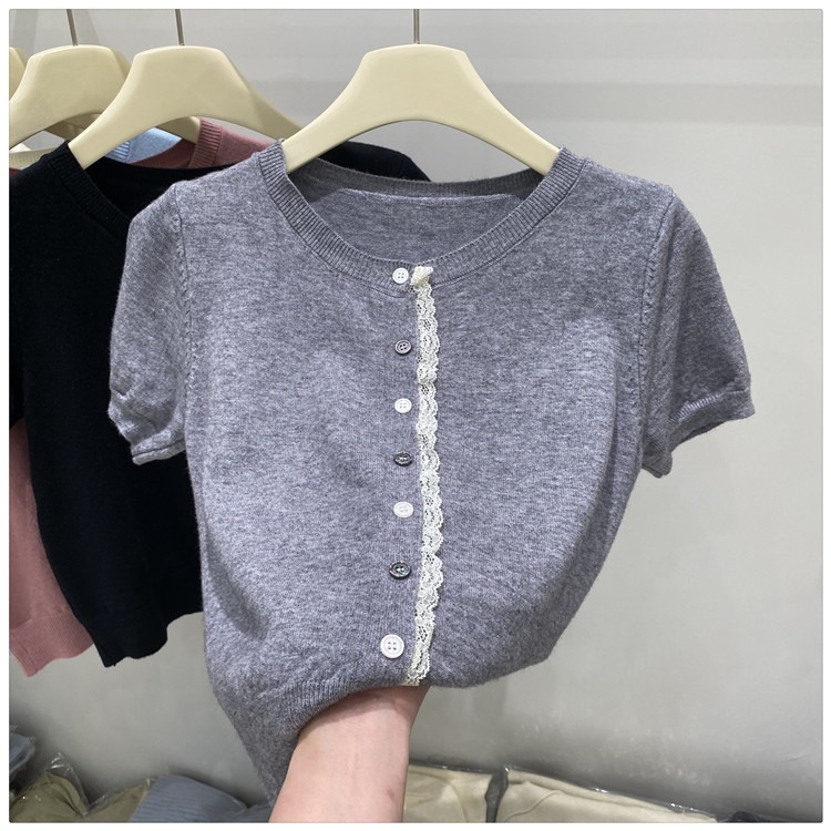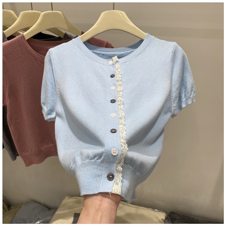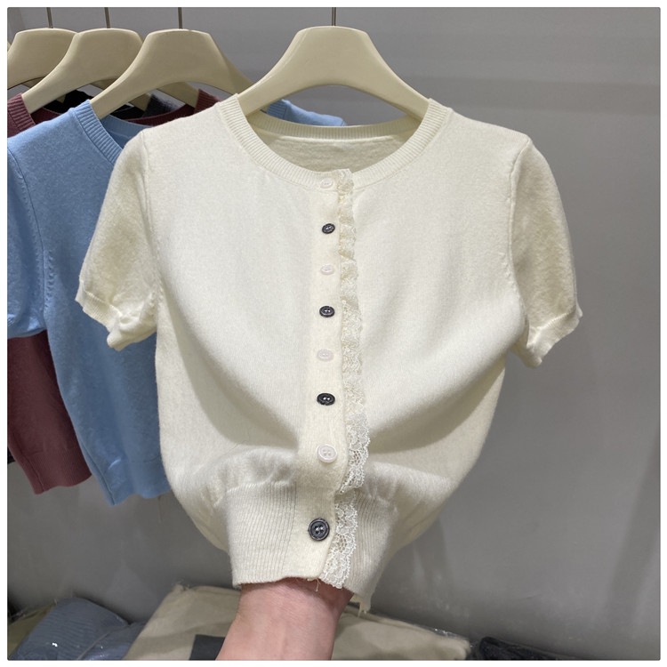 여성을위한 레이스 트림 스플 라이스 반팔 니트 카디건 2025 새로운 여름 스타일 작은 슬림 피트 짧은 바닥 탑스토어 가기