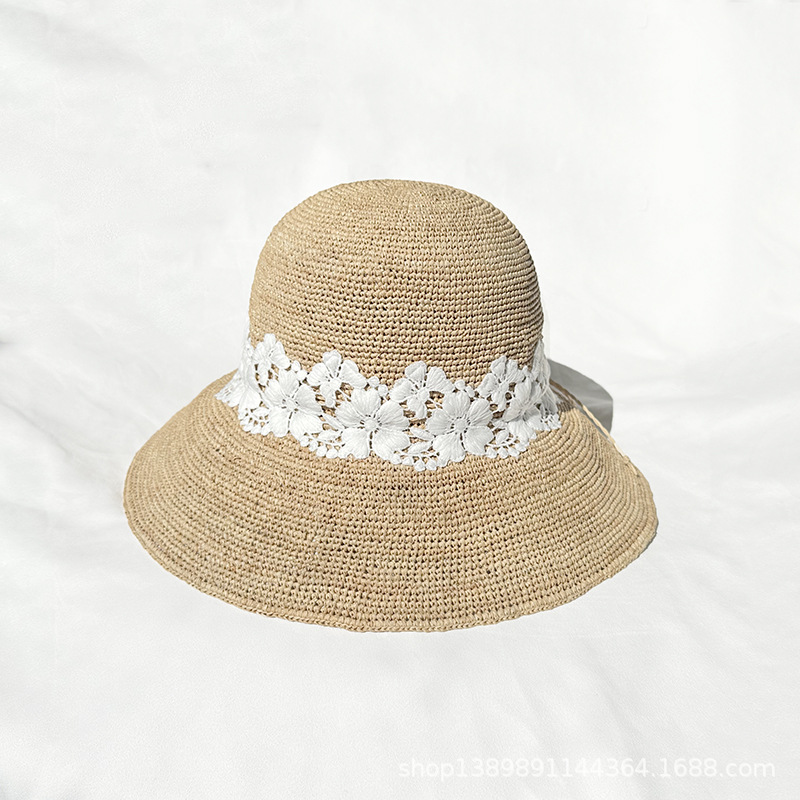 새로운 우아한 레이스 꽃 라피 잔디 후크 모자 모든 경기 간단한 프랑스 홀리데이 스타일 비치 어부 모자 밀짚 모자