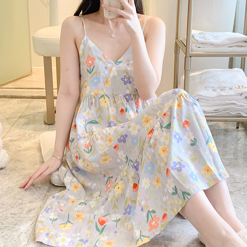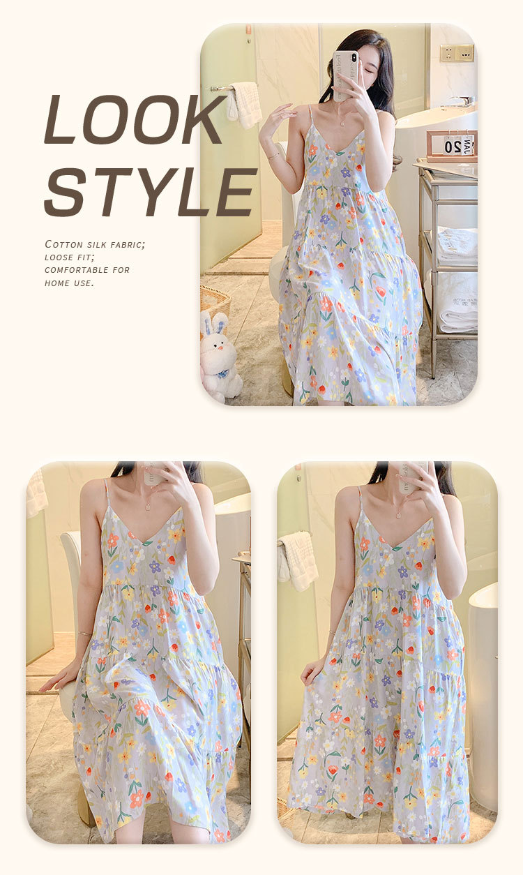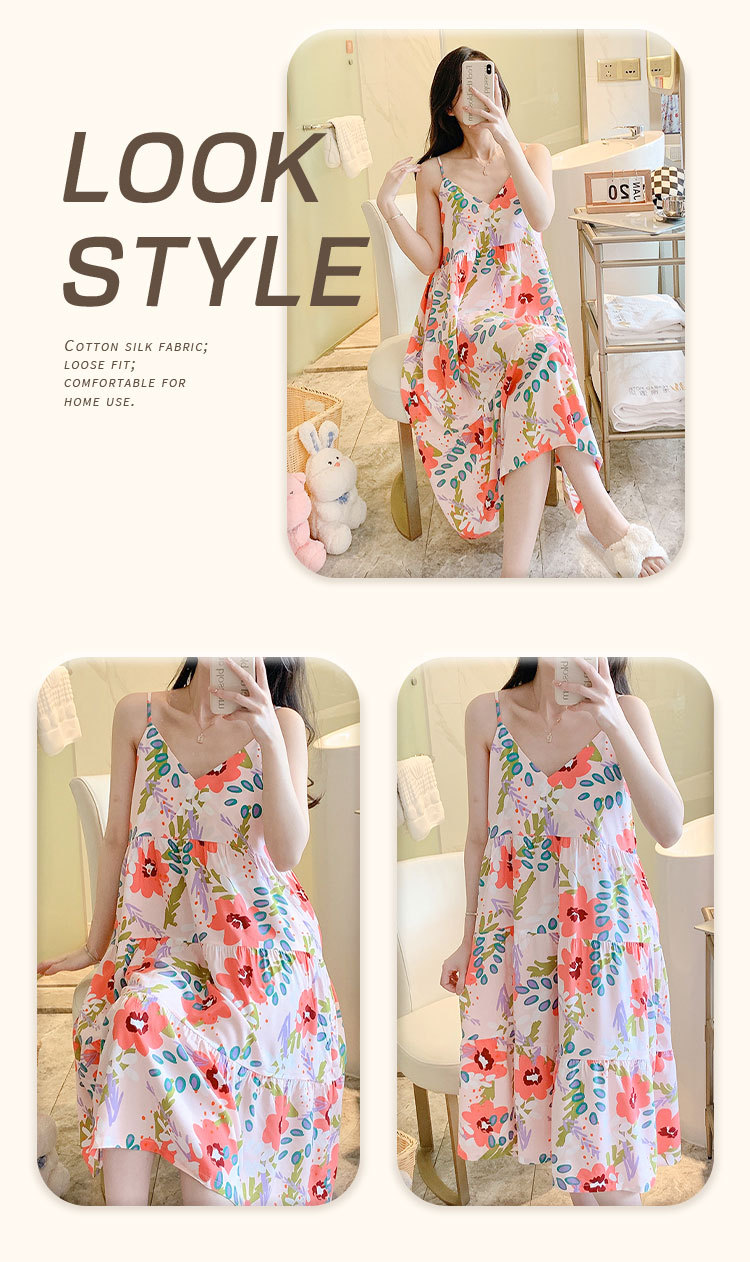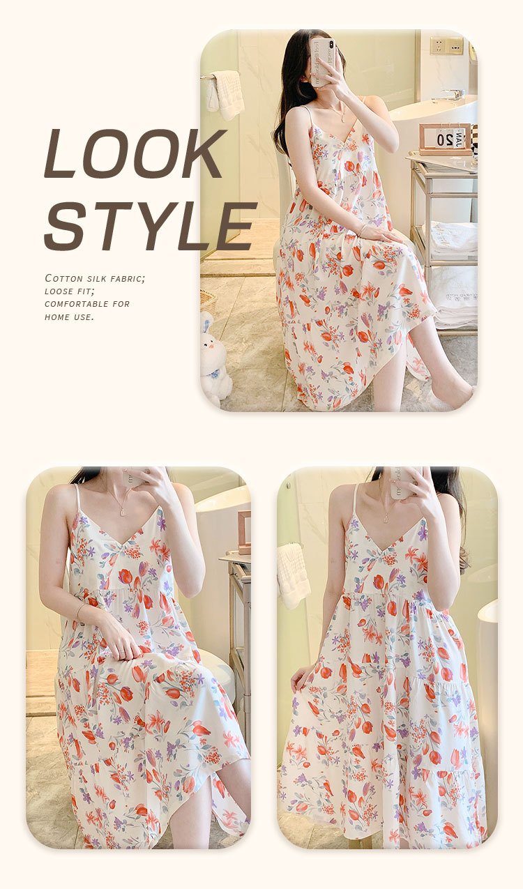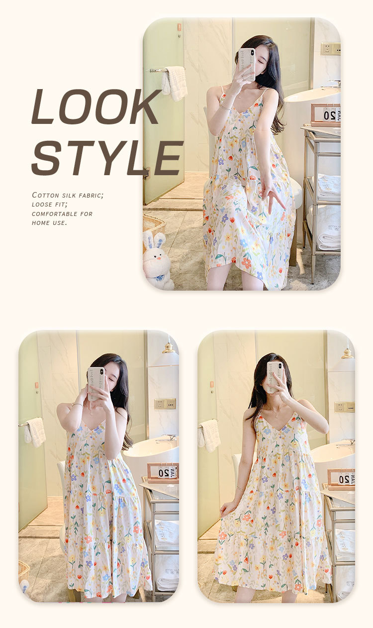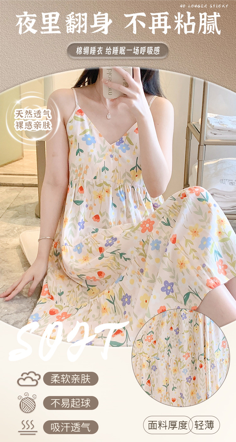 여름 서스펜더 잠옷, 여성스러운 얇은 인공 면 실크 홈웨어, 한국식 대형 고급 면 실크 잠옷 드레스스토어 가기