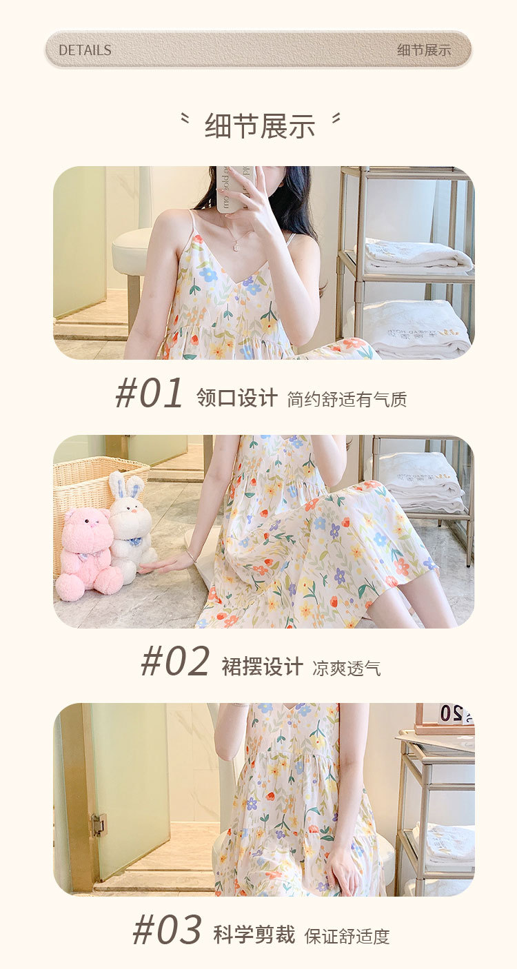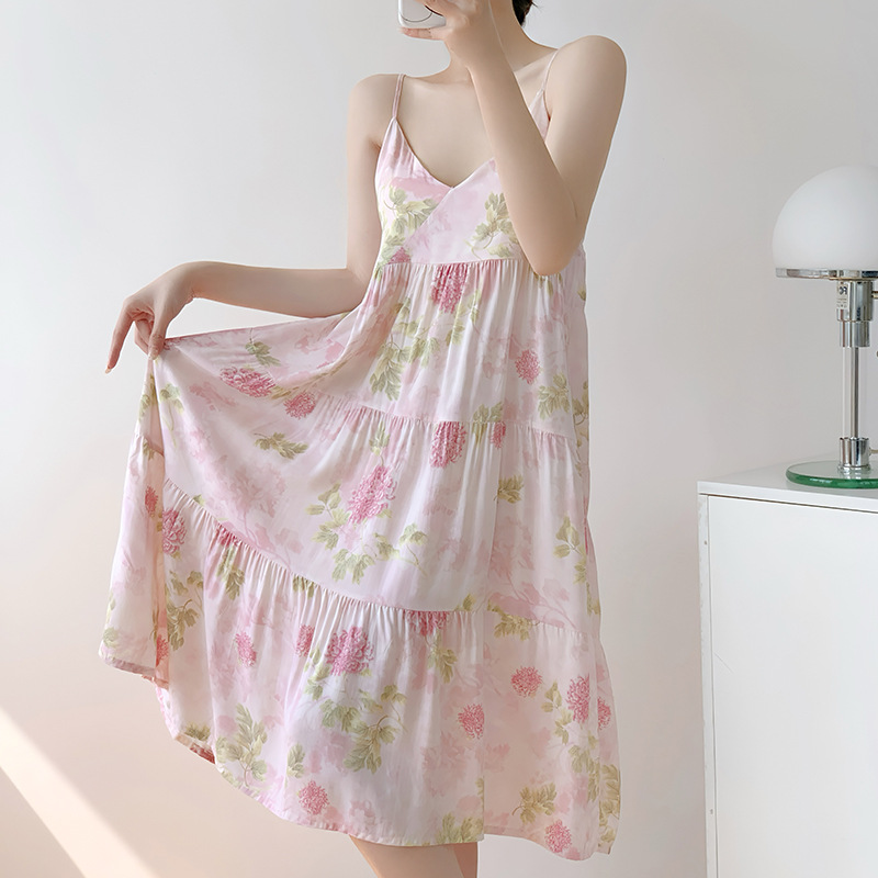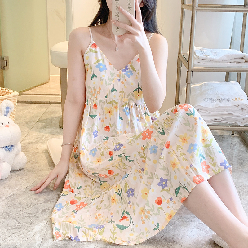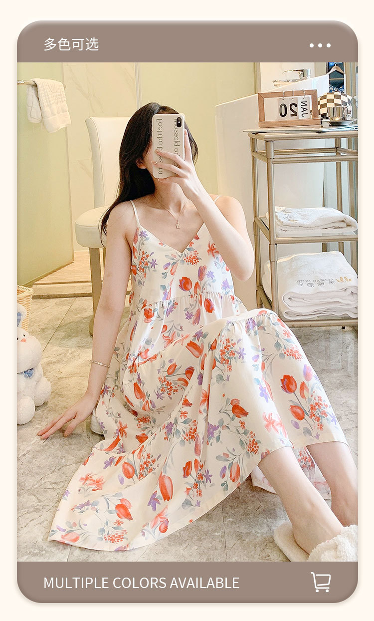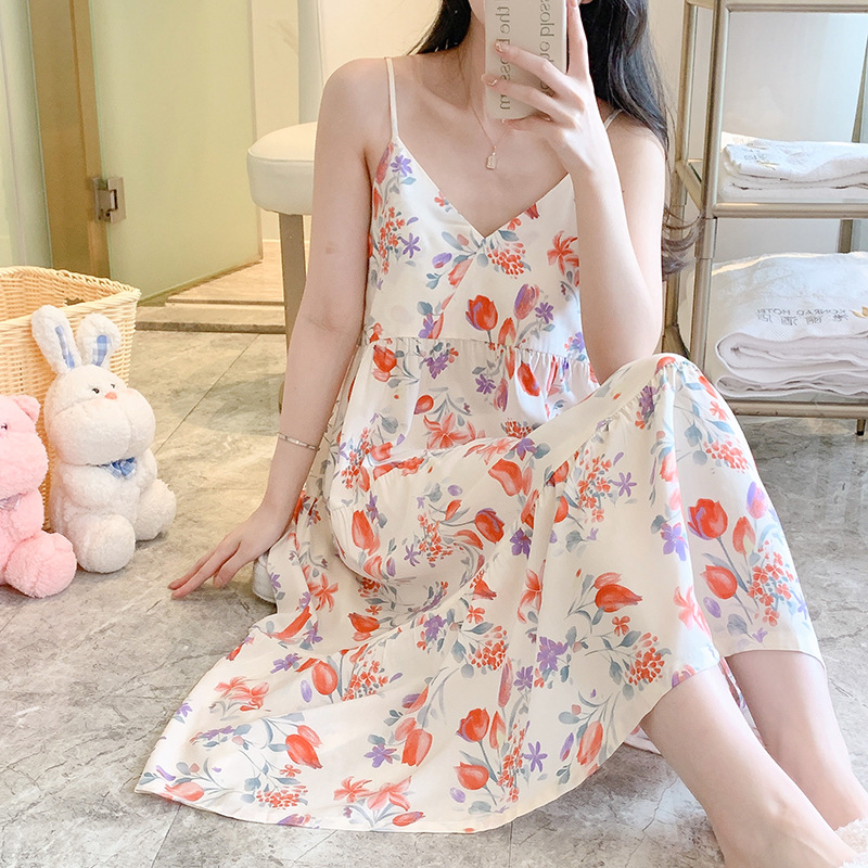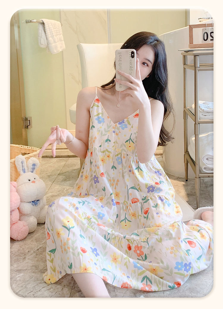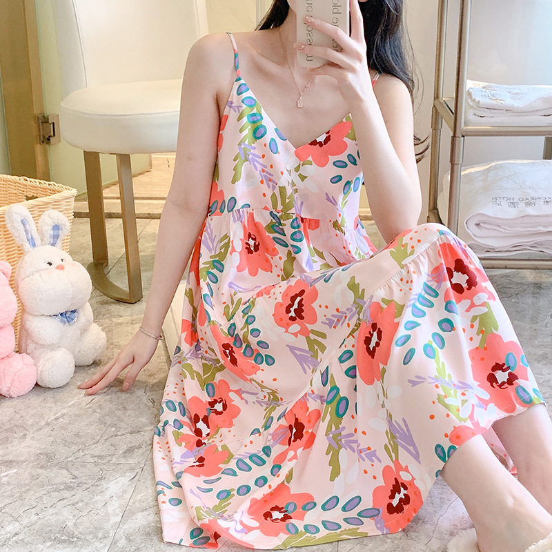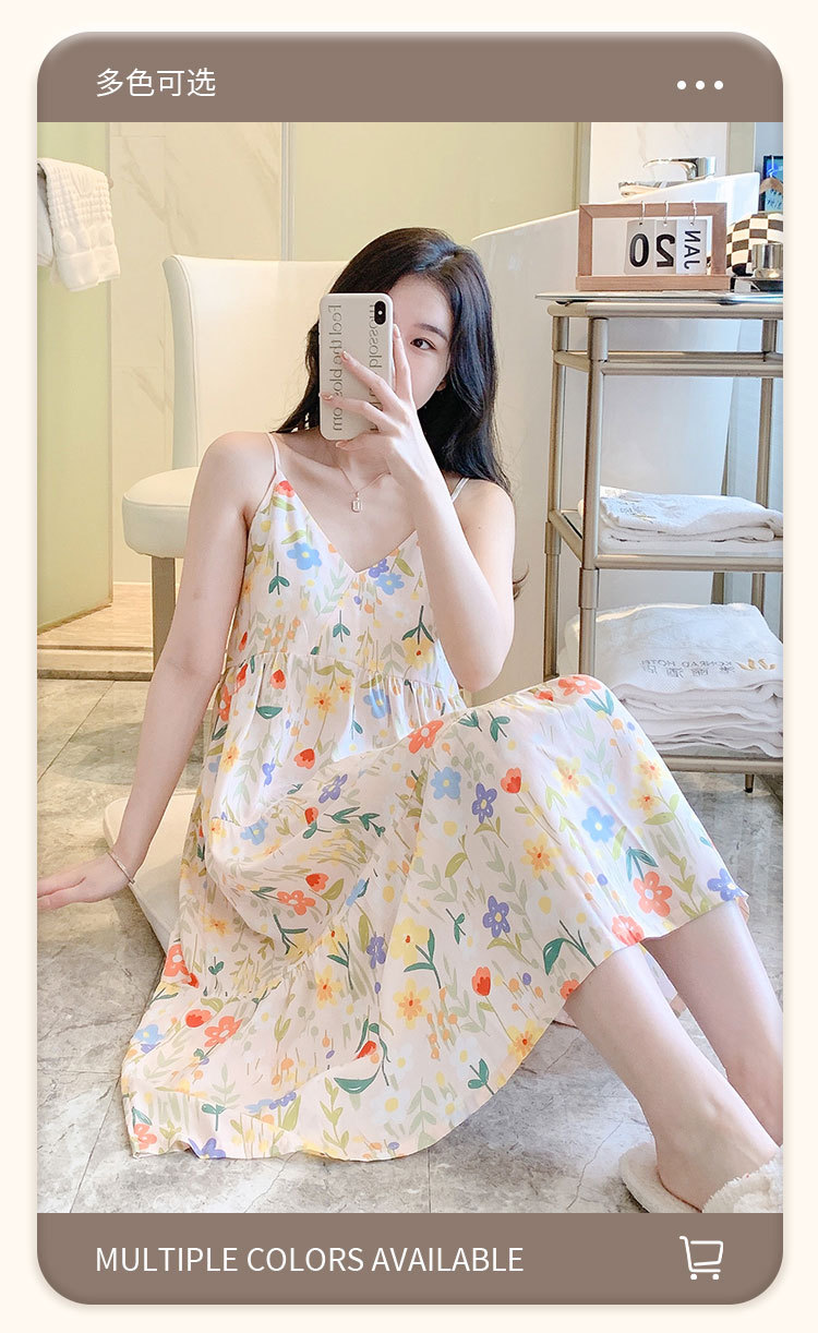 여름 서스펜더 잠옷, 여성스러운 얇은 인공 면 실크 홈웨어, 한국식 대형 고급 면 실크 잠옷 드레스스토어 가기