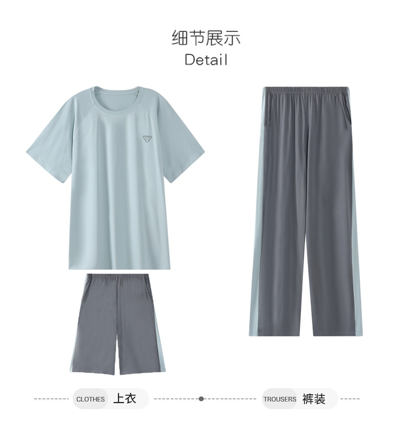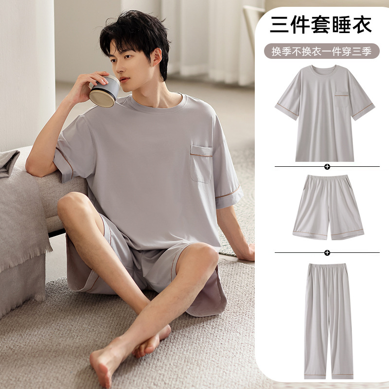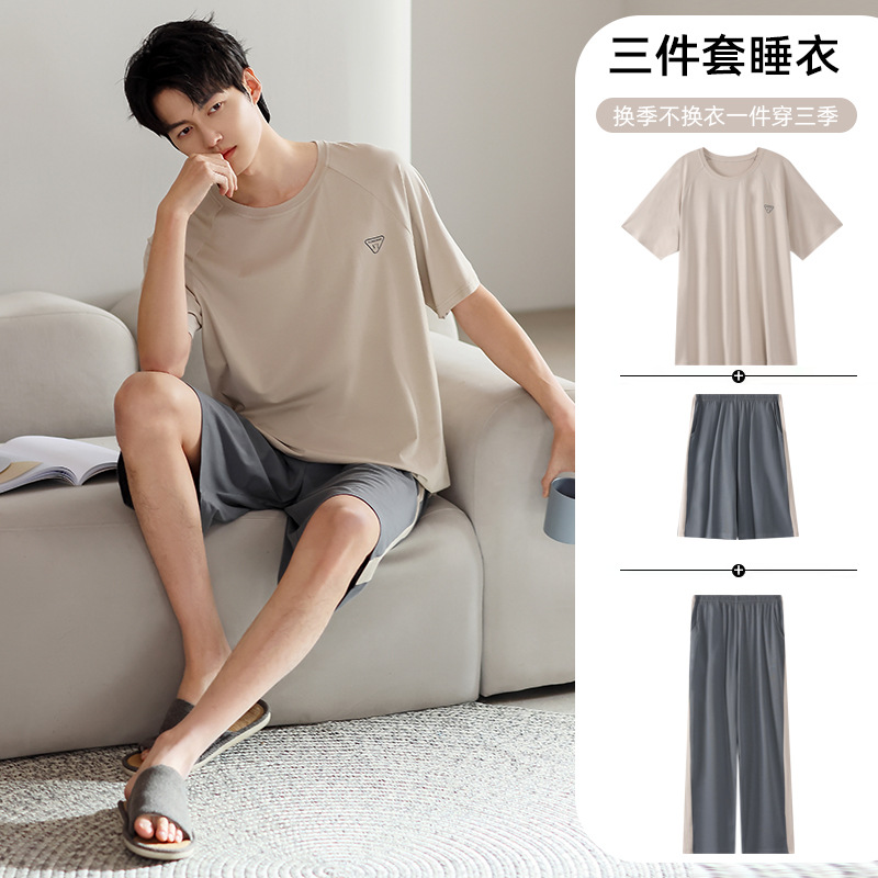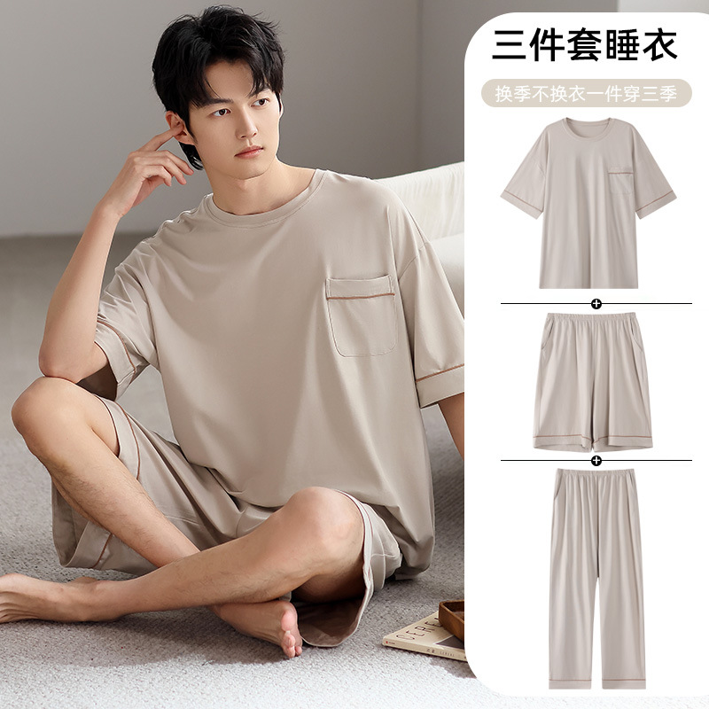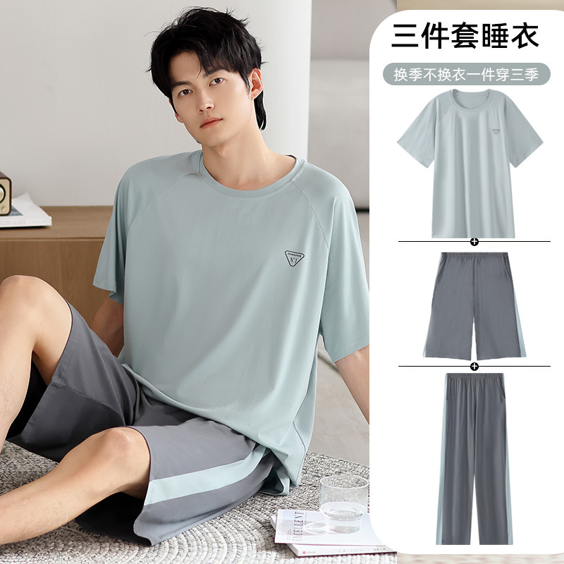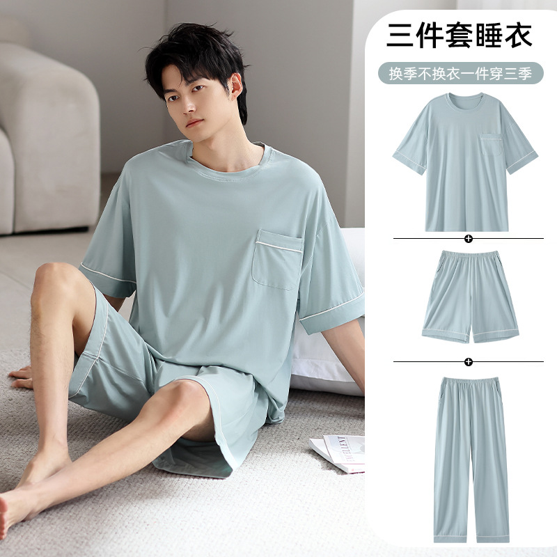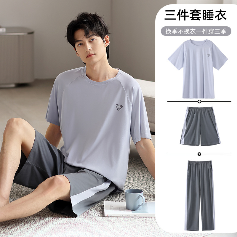 모달 파자마 남자 여름 반팔 바지 3 피스 세트 2025 새로운 라운드 넥 아우터 홈 의류 세트스토어 가기