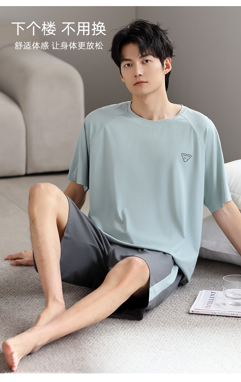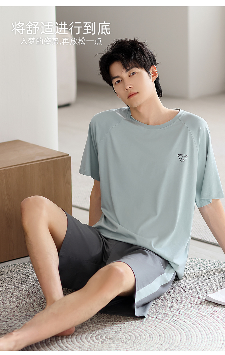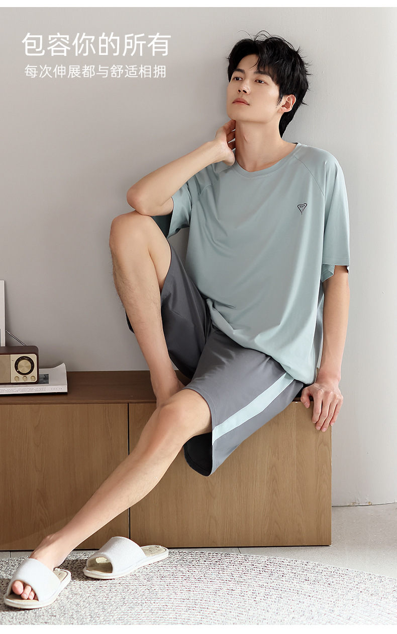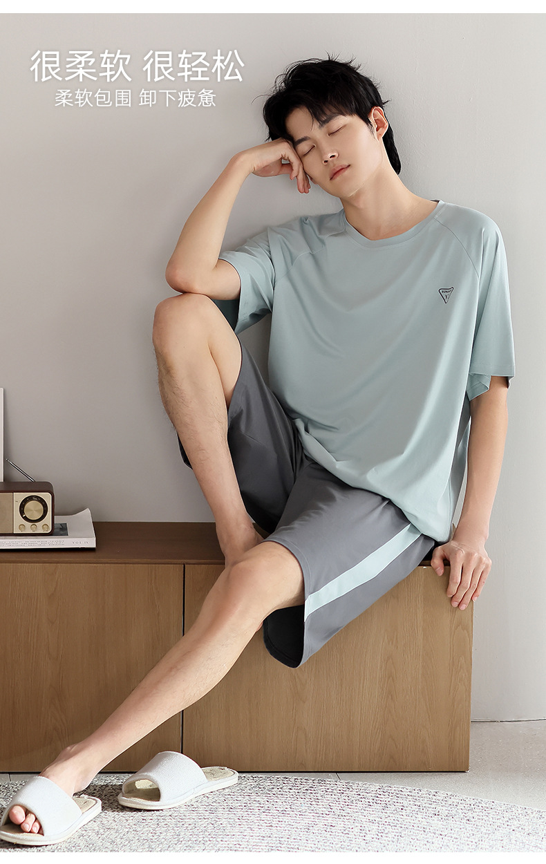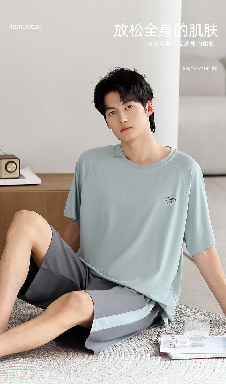 모달 파자마 남자 여름 반팔 바지 3 피스 세트 2025 새로운 라운드 넥 아우터 홈 의류 세트스토어 가기