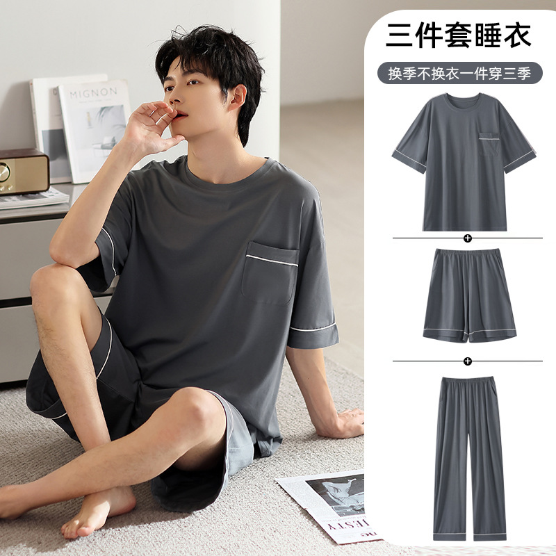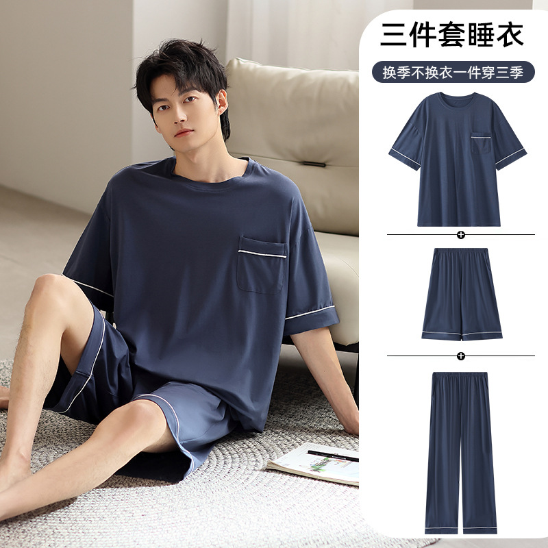 모달 파자마 남자 여름 반팔 바지 3 피스 세트 2025 새로운 라운드 넥 아우터 홈 의류 세트
