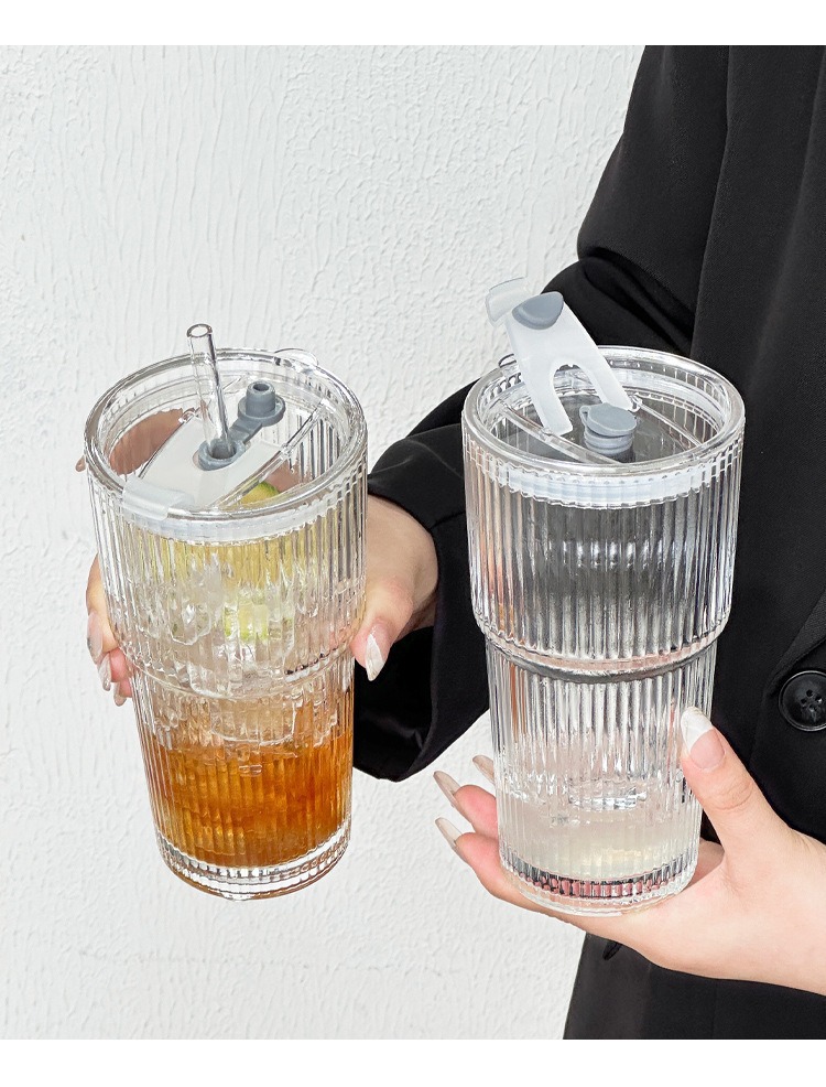 인스 스타일 냉음료 컵, 고급스러운 디자인의 주스/커피 컵, 뚜껑과 빨대 포함, 세로 줄무늬, 대용량 유리컵/물컵