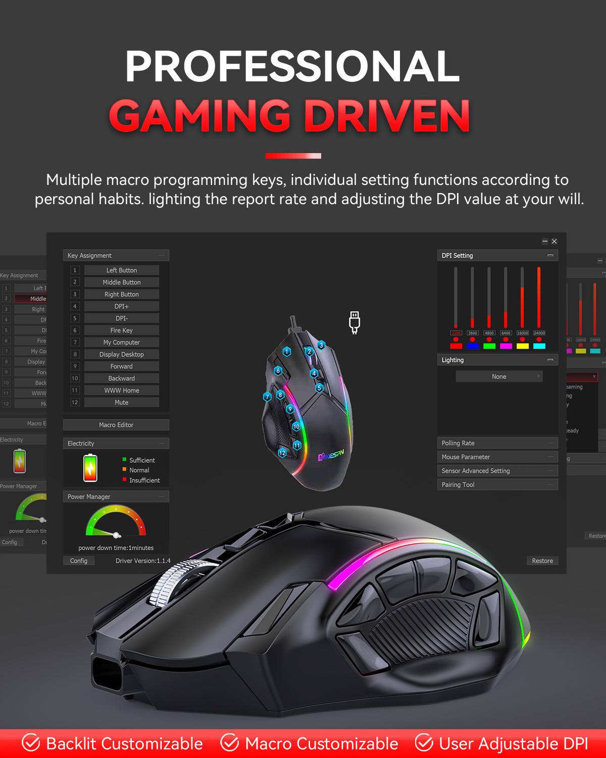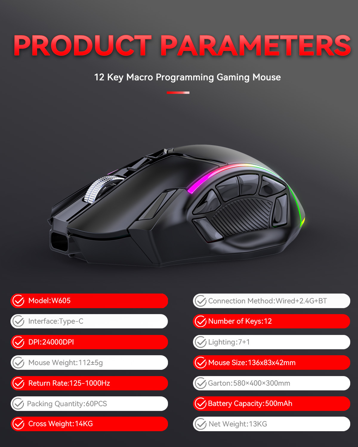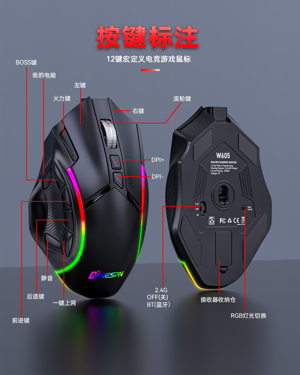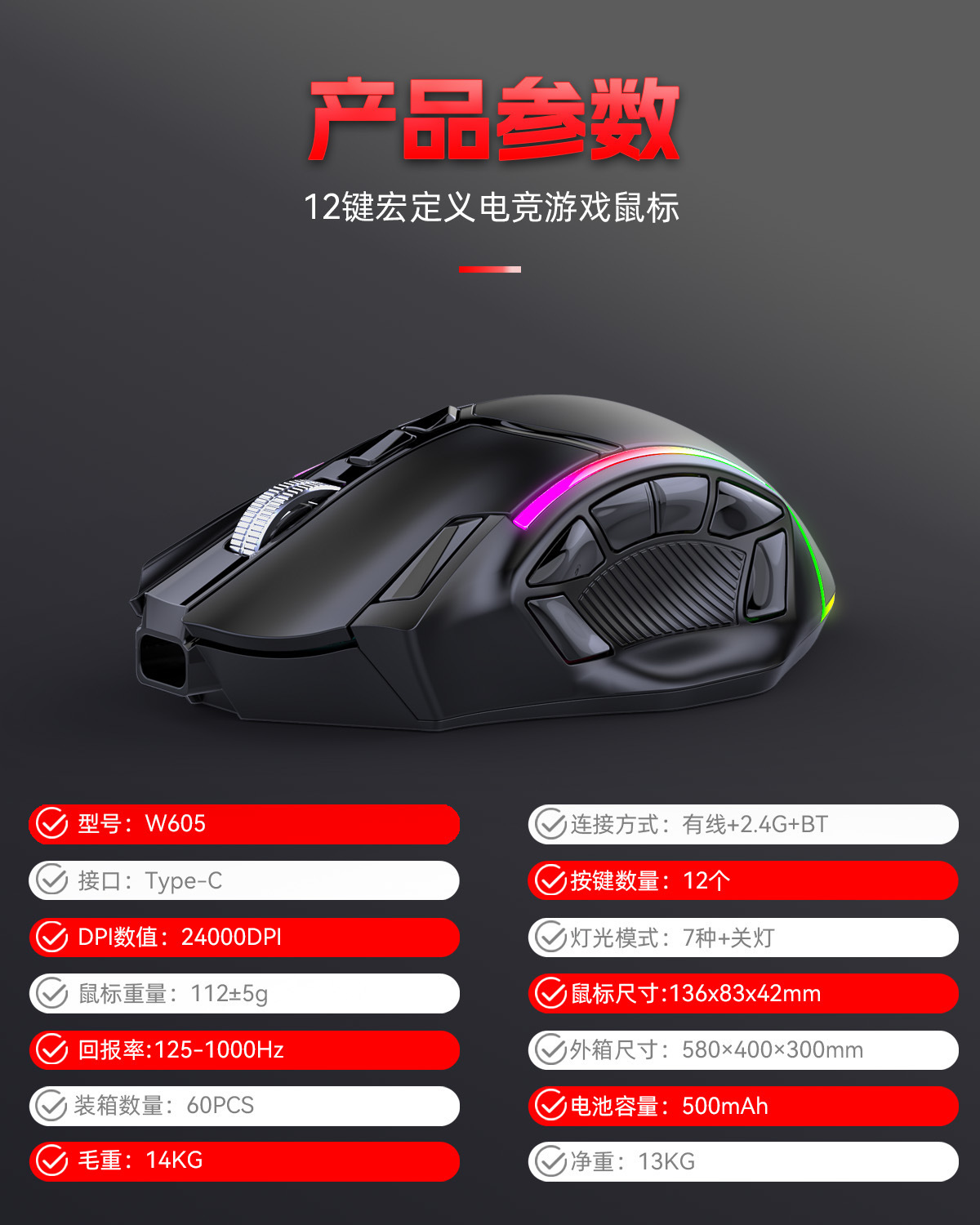 전체 속도 12 키 24000DPI 무선 3 모드 매크로 정의 게임 마우스 컴퓨터 액세서리의 일괄 배송
