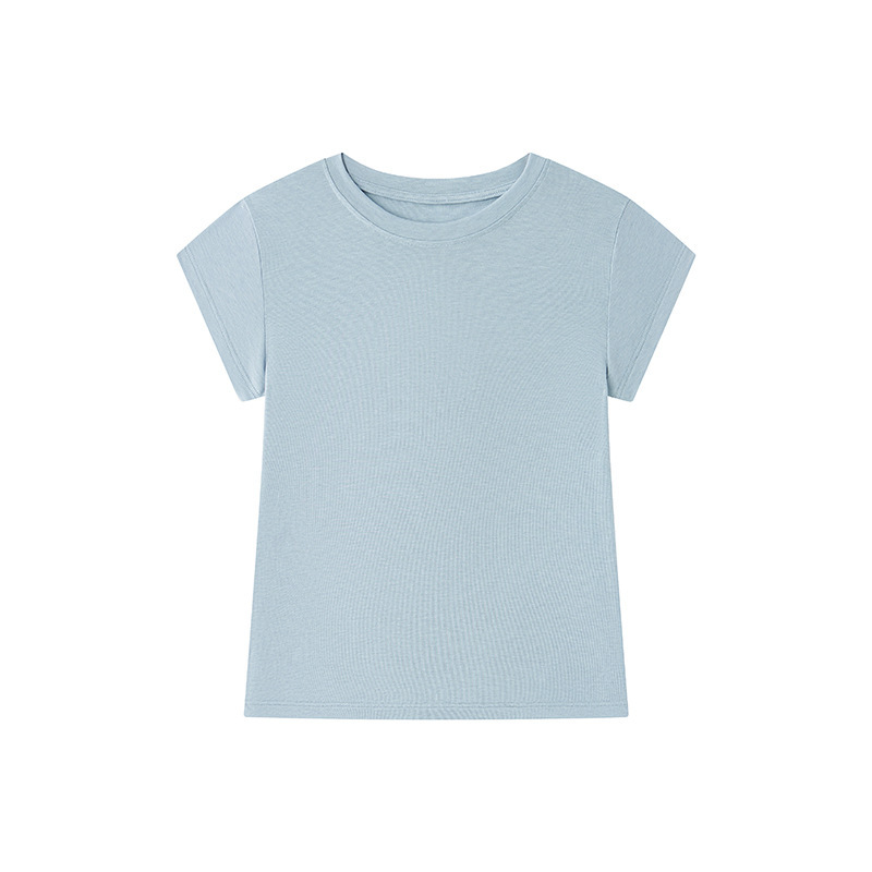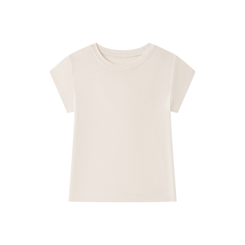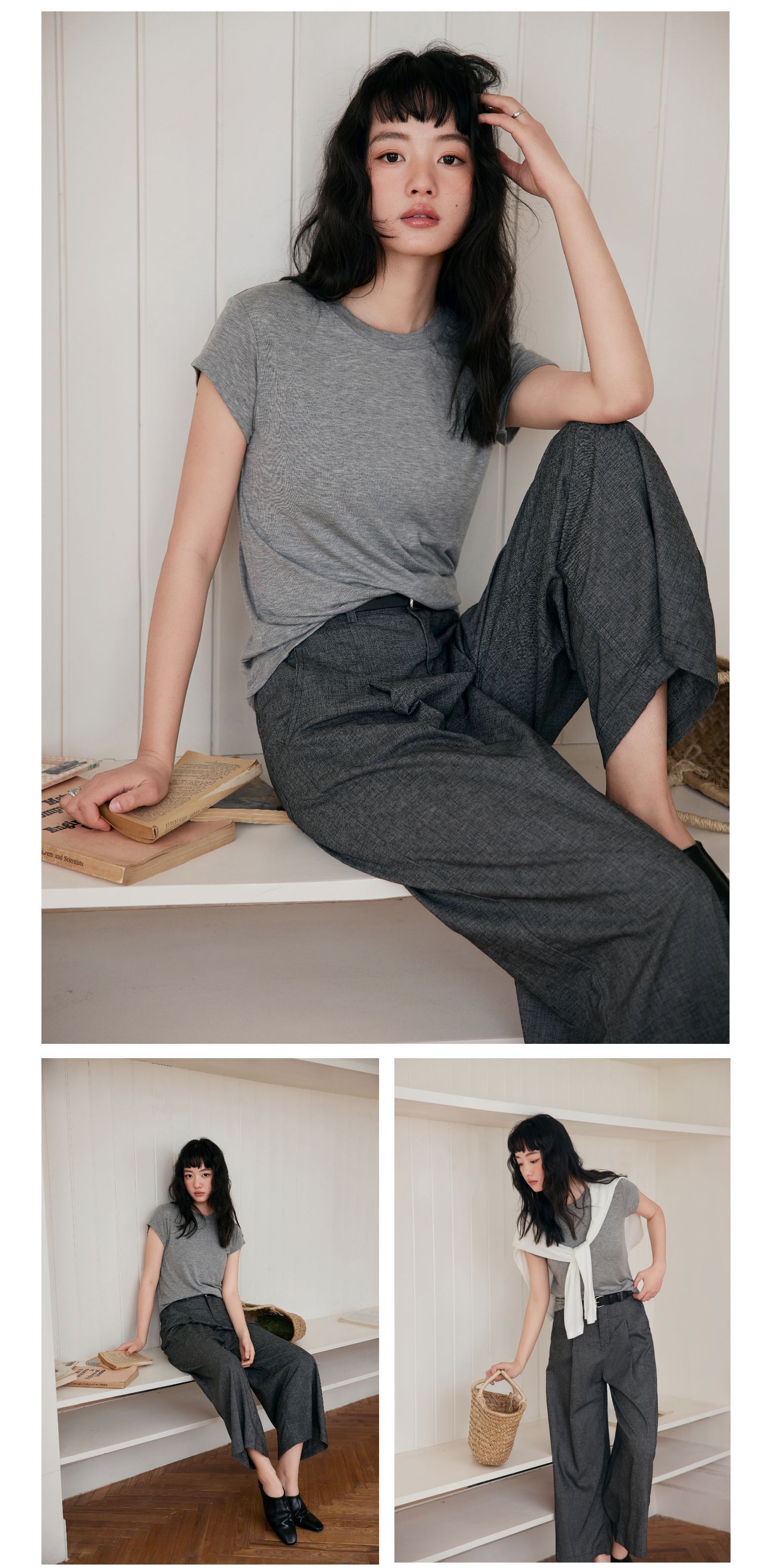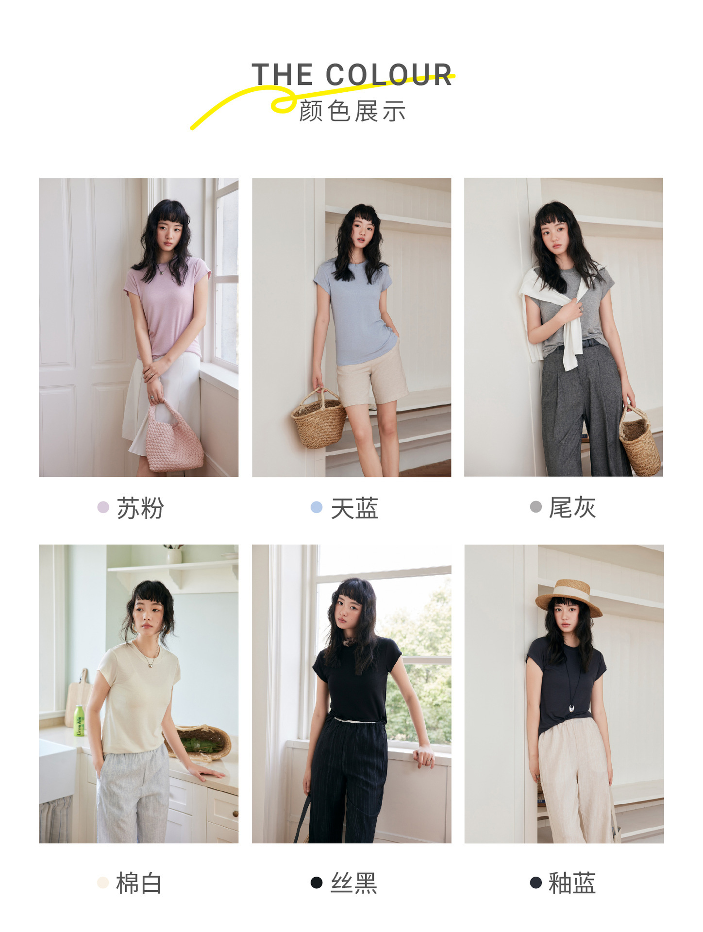 텐셀 울 반팔 티셔츠 여성용 슬림핏 라운드넥 어깨가 드러나는 작은 날개 소매 얇은 탑 예술적인 스타일 반팔 티셔츠
