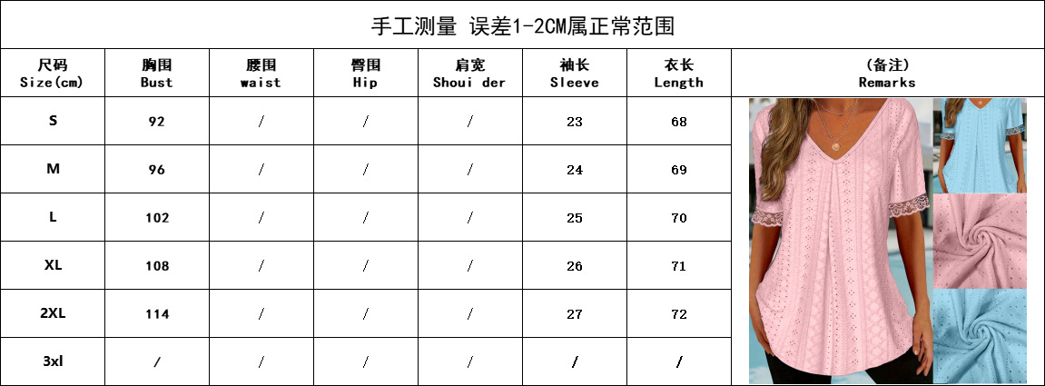 2025 유럽과 미국의 대외 무역 여성 v 넥 중공 니트 탑 레이스 스플 라이스 반팔 티셔츠 여성스토어 가기