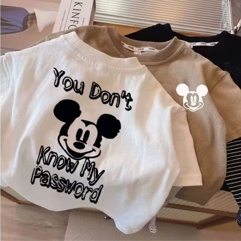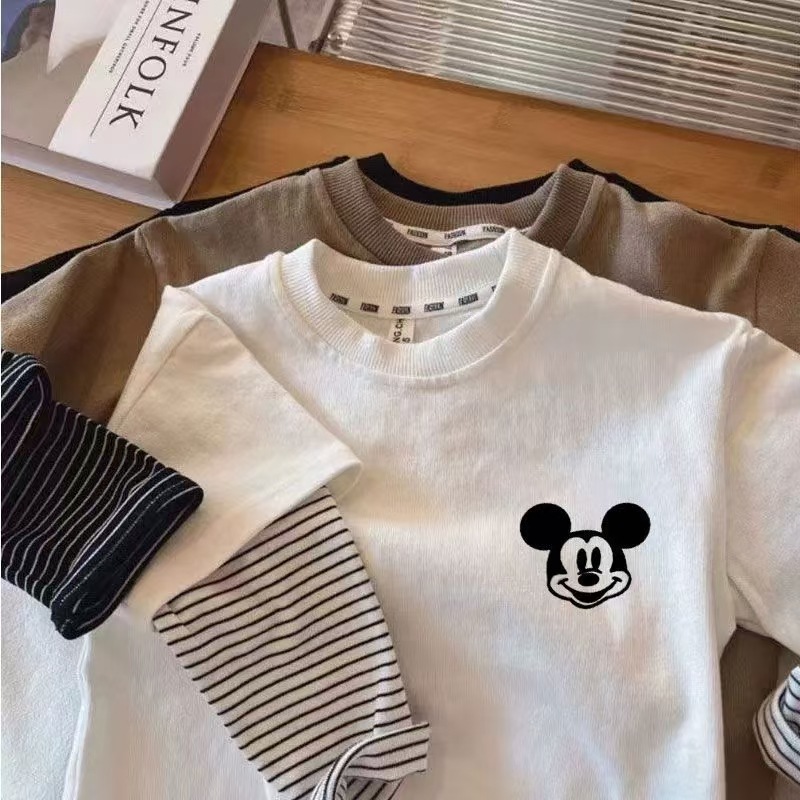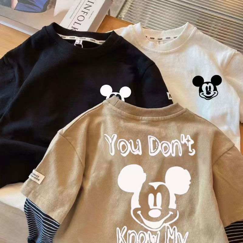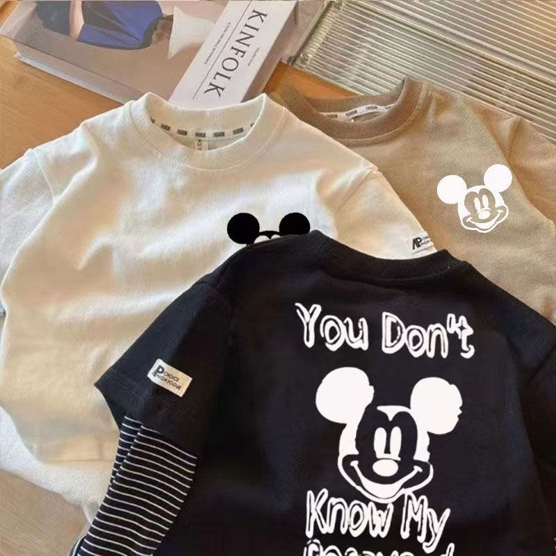 새로운 어린이 패션 긴팔 티셔츠, 세련된 봄, 가을 남성과 여성의 아기 만화 미키 라운드 넥 바닥 셔츠 가짜 투피스스토어 가기
