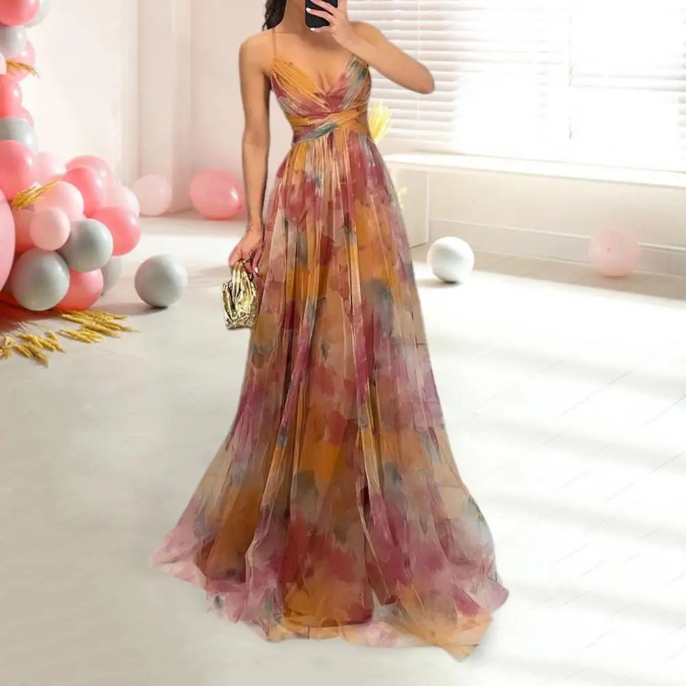 2025 국경 유럽 및 미국 봄과 여름 새로운 메쉬 인쇄 슬링 원피스 INS 휴가 레저 파티 원피스