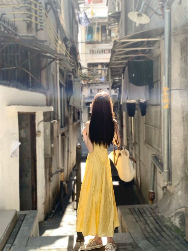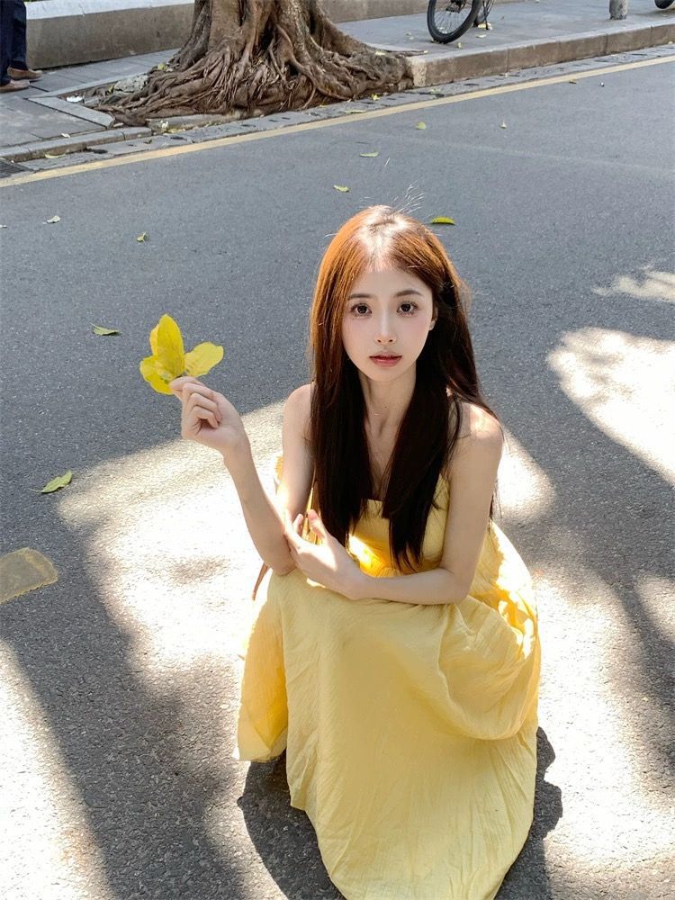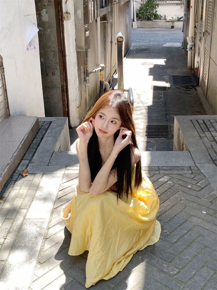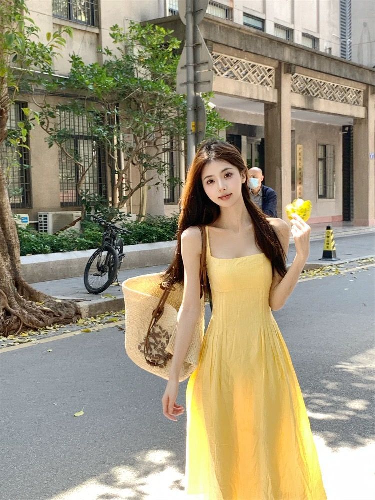 프랑스 스타일 작은 노란색 슬링 원피스 여성 의류 여름 새로운 허리 우아한 긴 원피스 해변 휴일 스커트스토어 가기