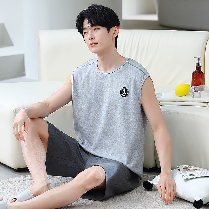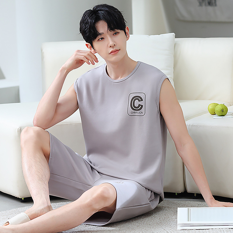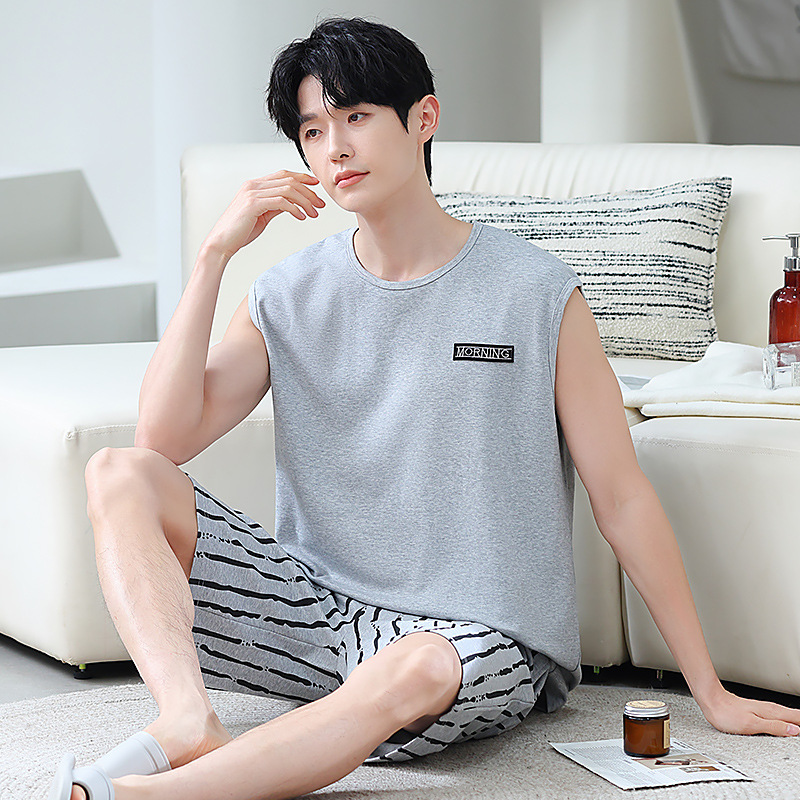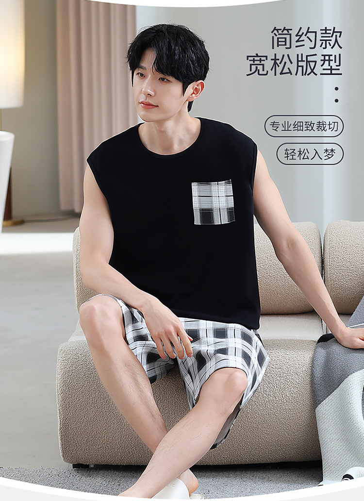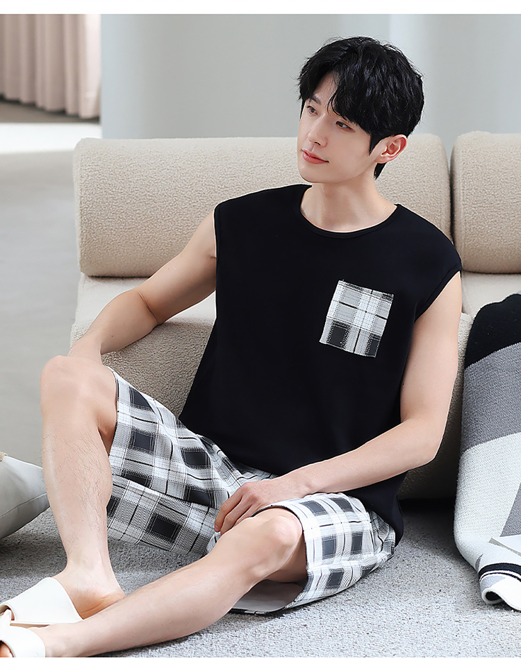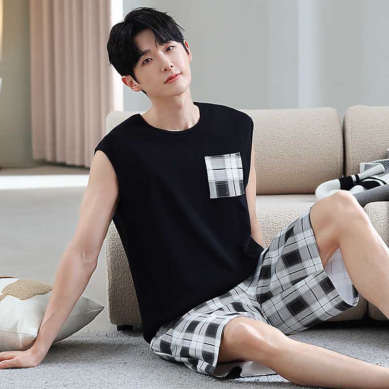 100% 면 잠옷 남성 여름 얇은 조끼 플러스 사이즈 청소년 격자 무늬 반바지 정장 홈웨어 겉옷