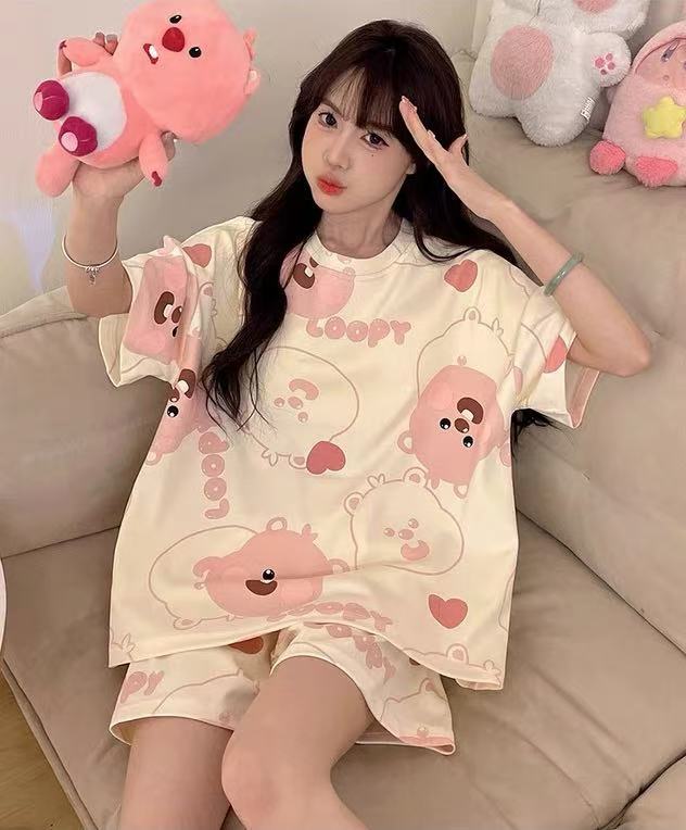 [전체 네트워크 최저 가격] 여름 밀크 실크 캐주얼 심플 잠옷 여성 반팔 반바지 만화 홈웨어 투피스 세트