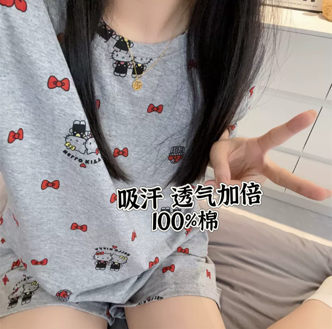 [전체 네트워크 최저 가격] 여름 밀크 실크 캐주얼 심플 잠옷 여성 반팔 반바지 만화 홈웨어 투피스 세트스토어 가기