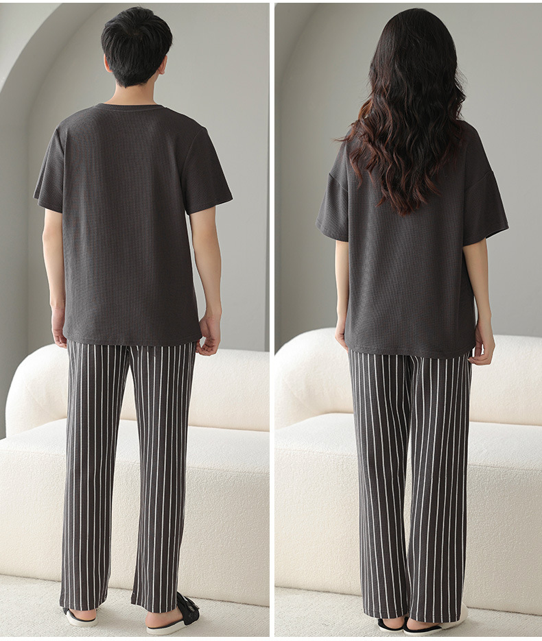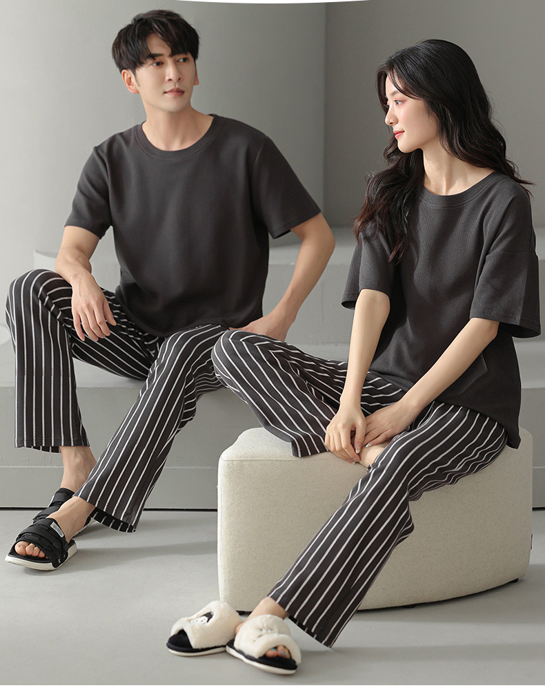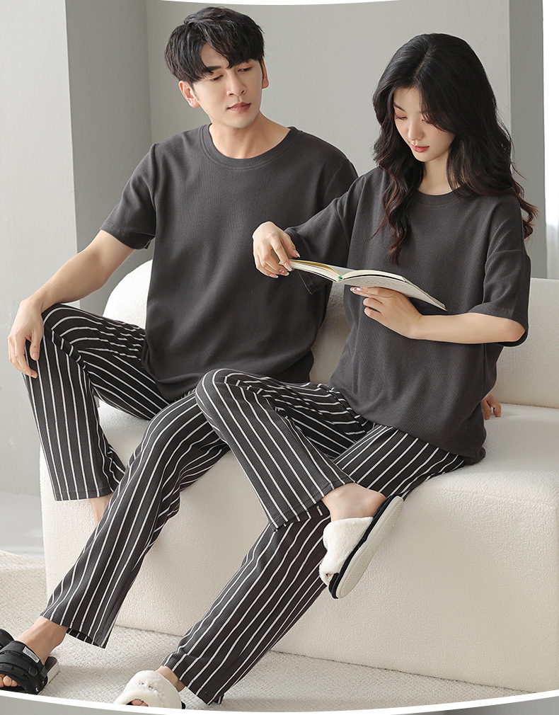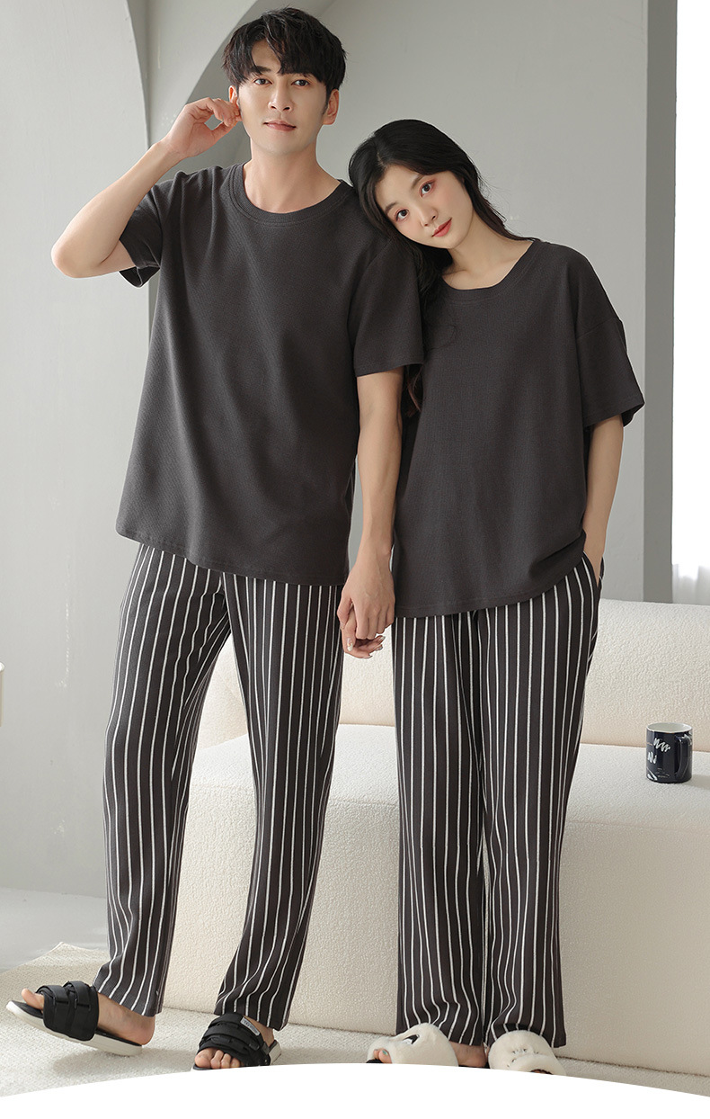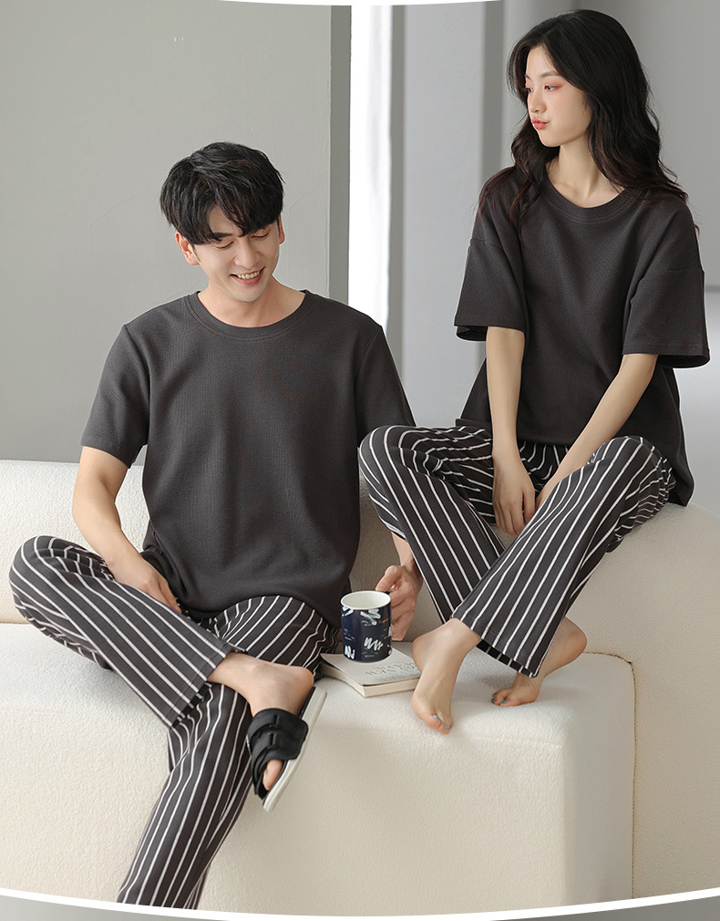 남성과 여성을 위한 커플 잠옷 봄과 여름 와플 순면 반팔 바지 캐주얼 여름 간단한 홈웨어 세트