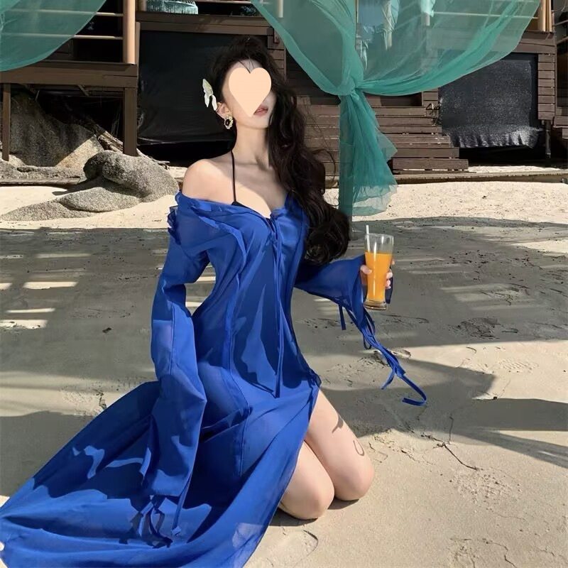 Island Store 블루 홀리데이 리본 러플 비키니와 메쉬 썬블라우스 드레스