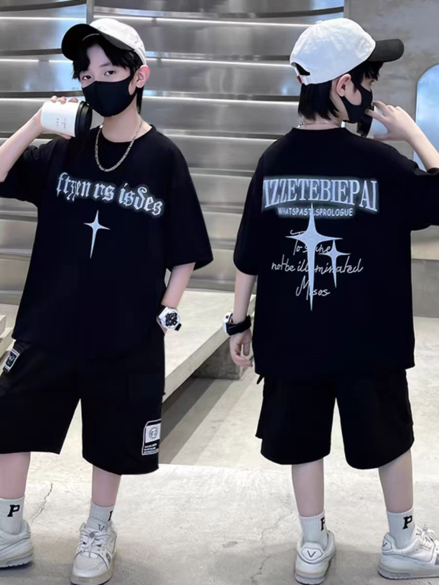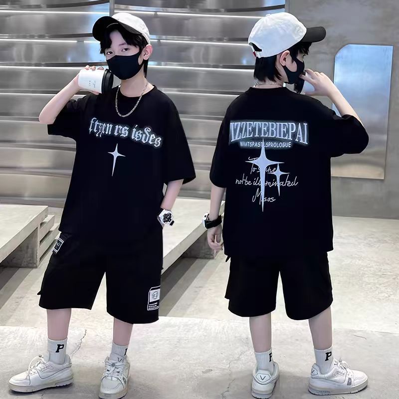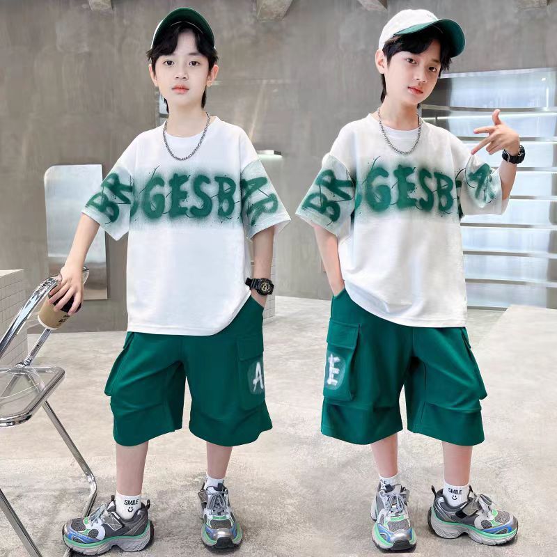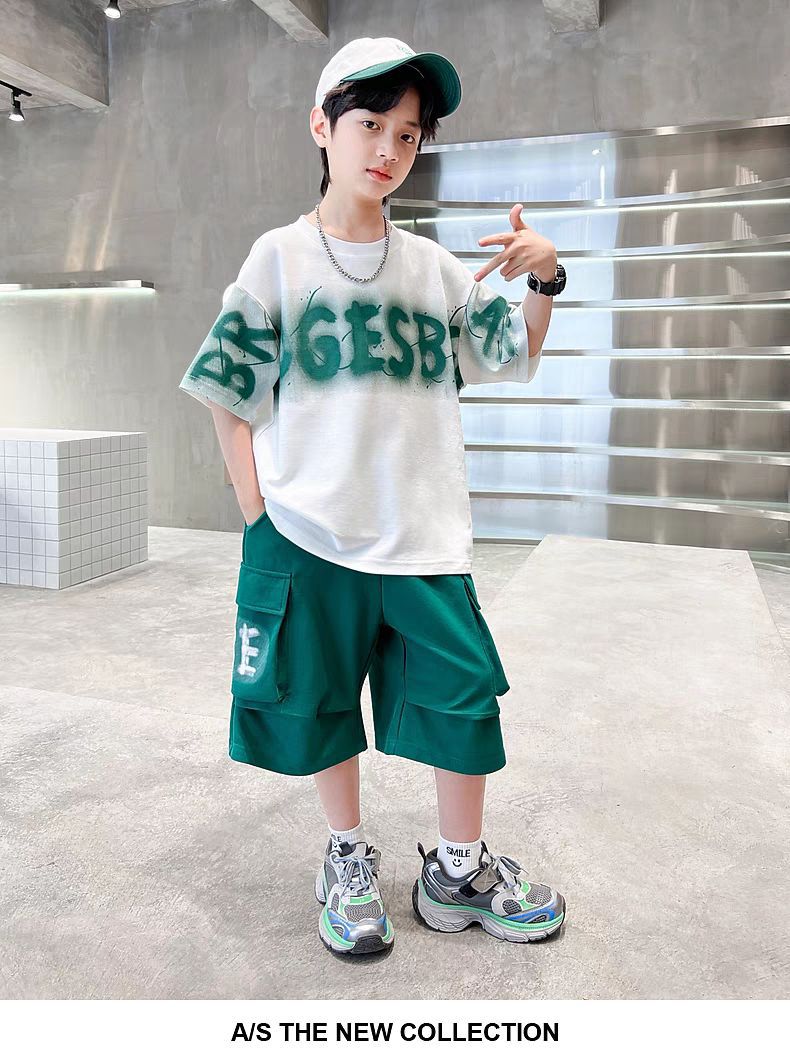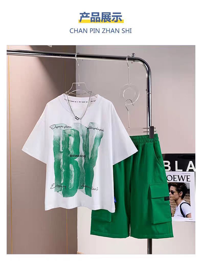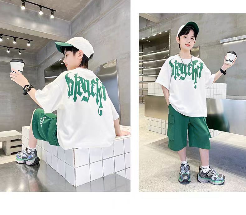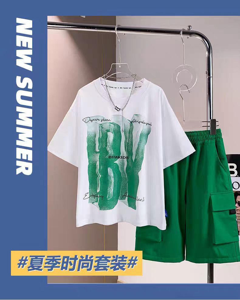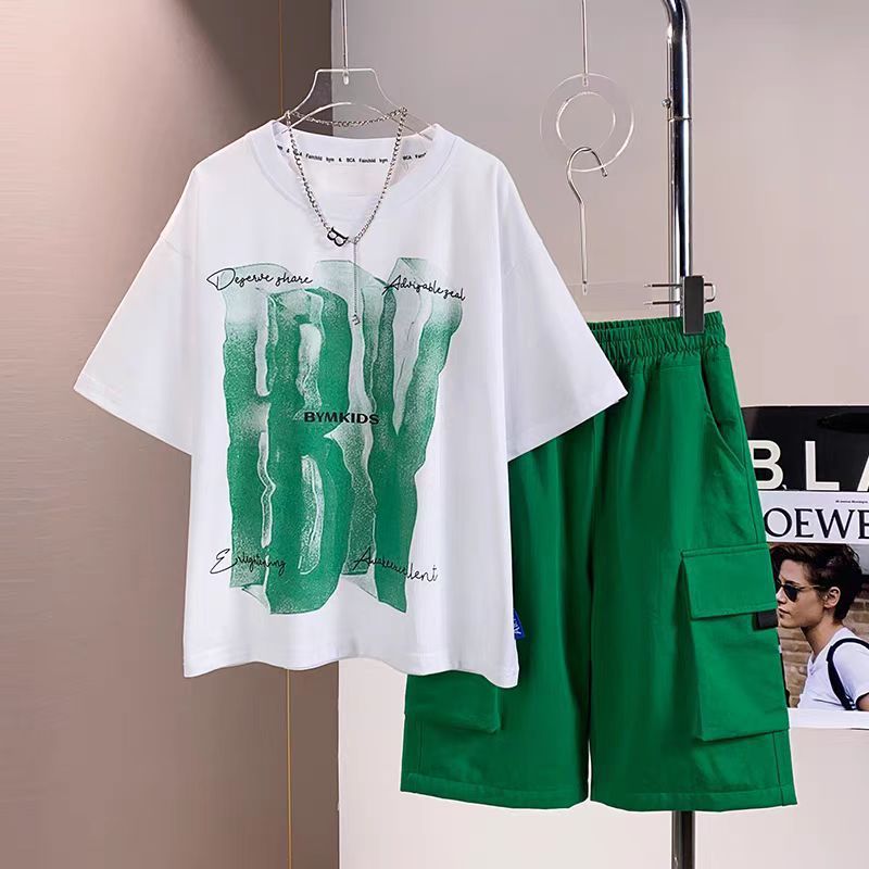 남아 정장, 여름 정장, 큰 남아용 멋진 스트리트 반팔 바지 정장, 운동복 투피스 세트, 트렌디스토어 가기