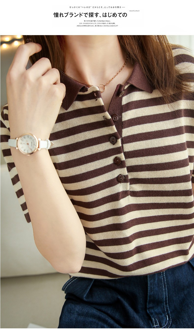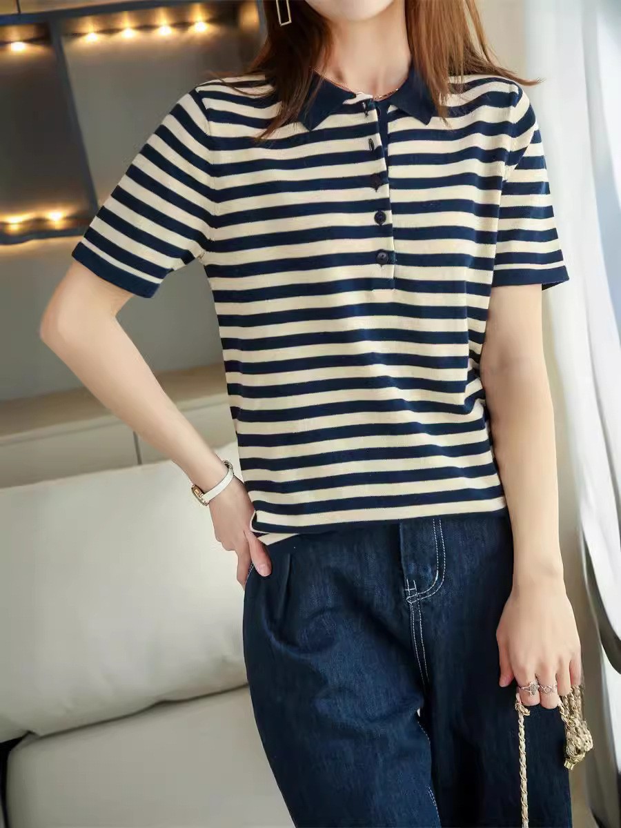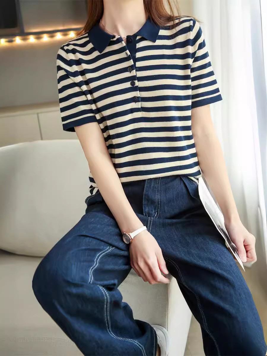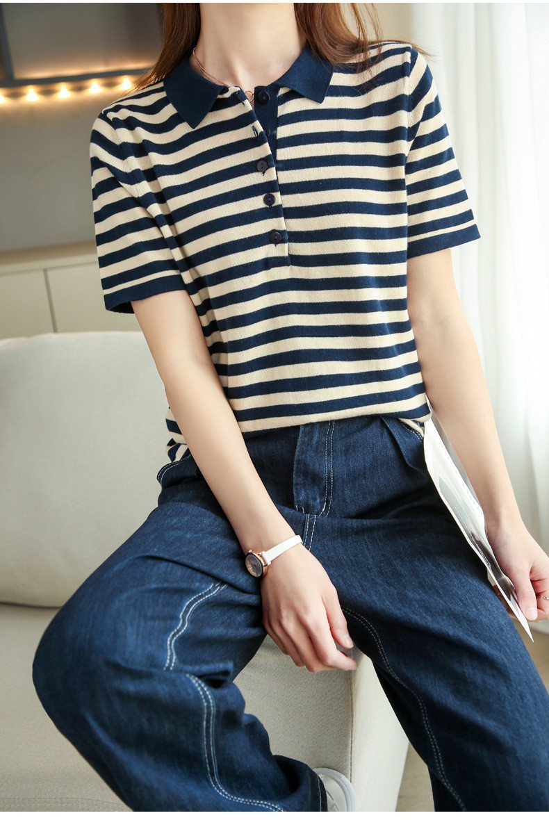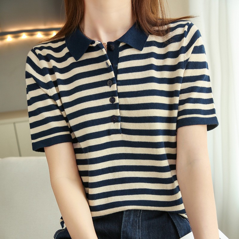 여름 여성용 면 폴로 칼라 스트라이프 반팔 티셔츠 루즈한 얇은 대형 바디 라펠 바닥 스웨터스토어 가기