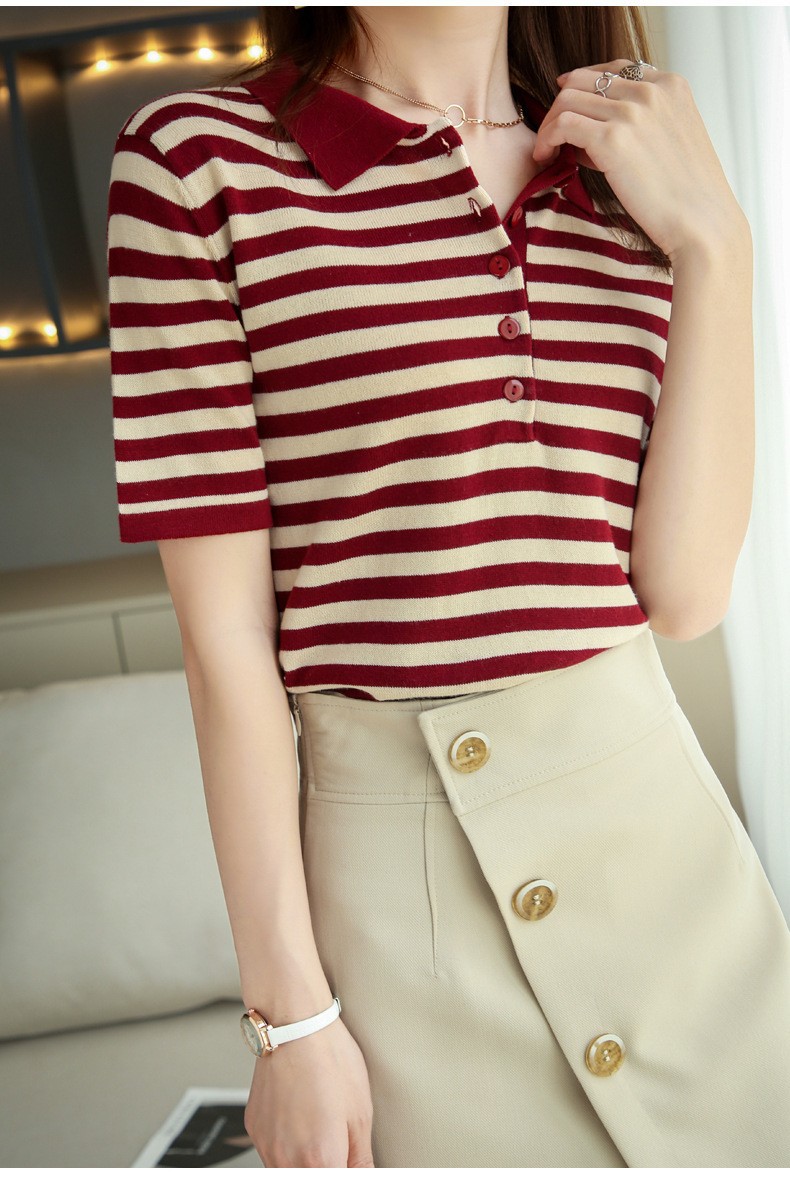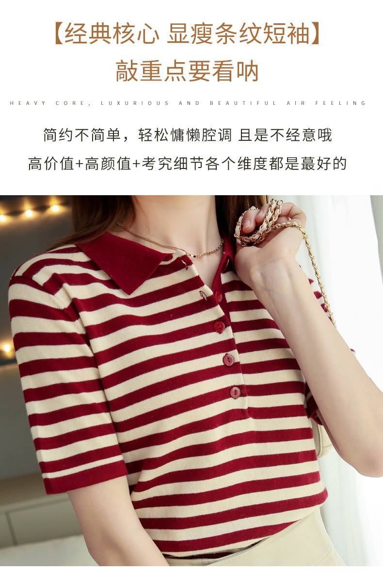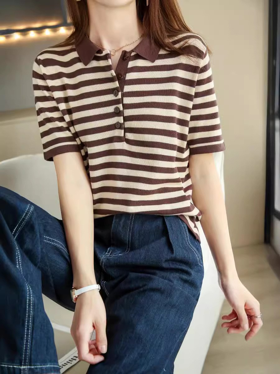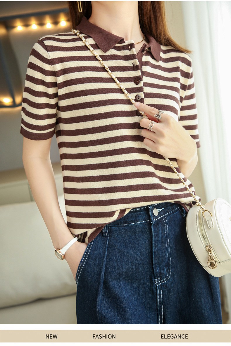 여름 여성용 면 폴로 칼라 스트라이프 반팔 티셔츠 루즈한 얇은 대형 바디 라펠 바닥 스웨터스토어 가기
