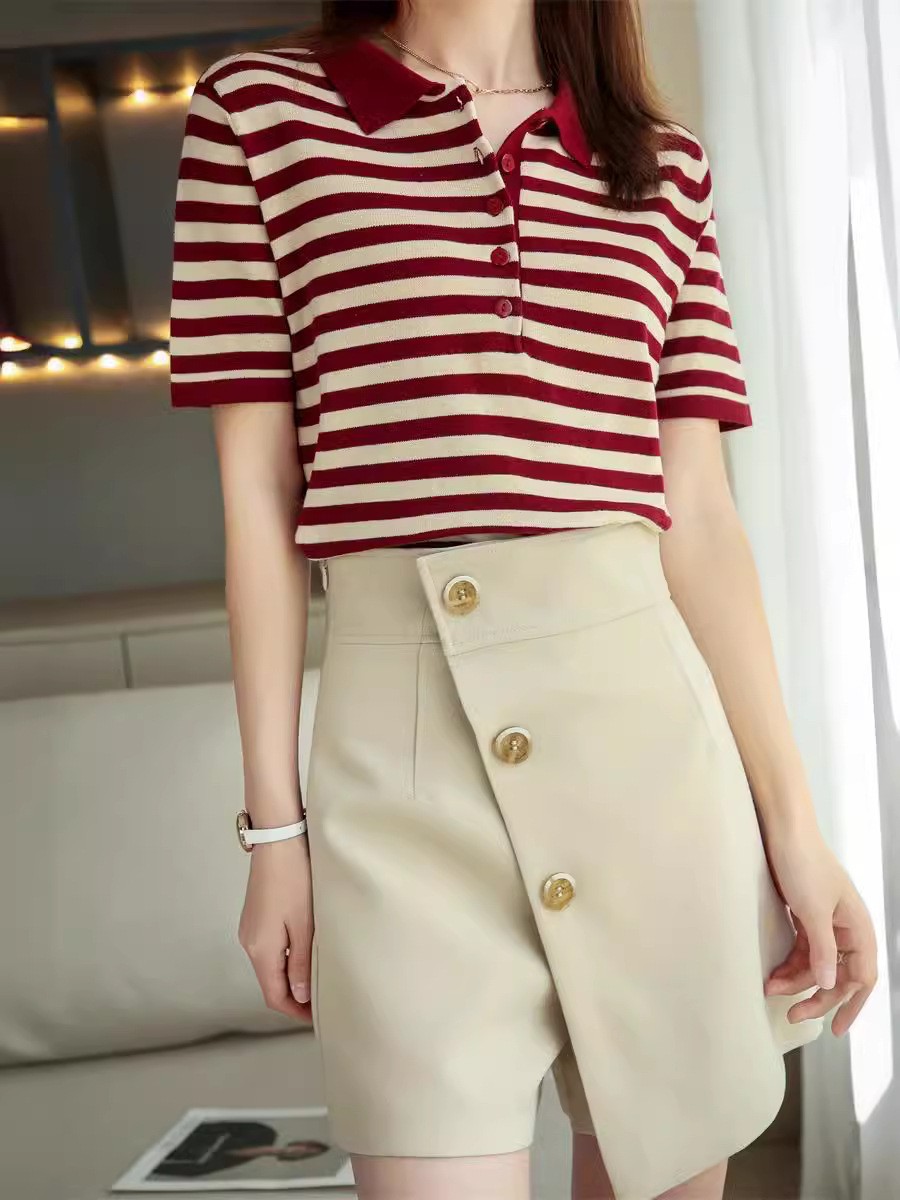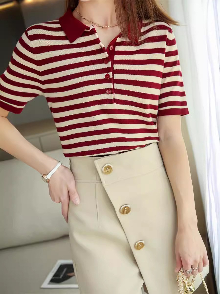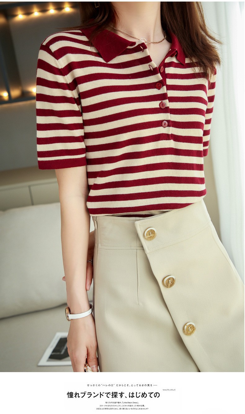 여름 여성용 면 폴로 칼라 스트라이프 반팔 티셔츠 루즈한 얇은 대형 바디 라펠 바닥 스웨터