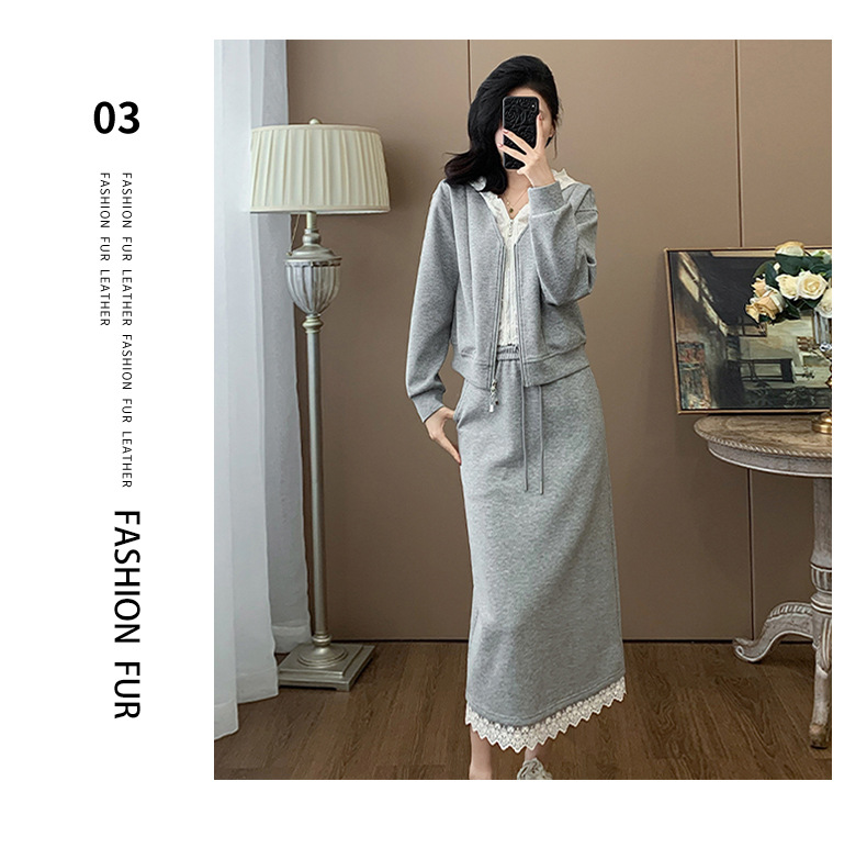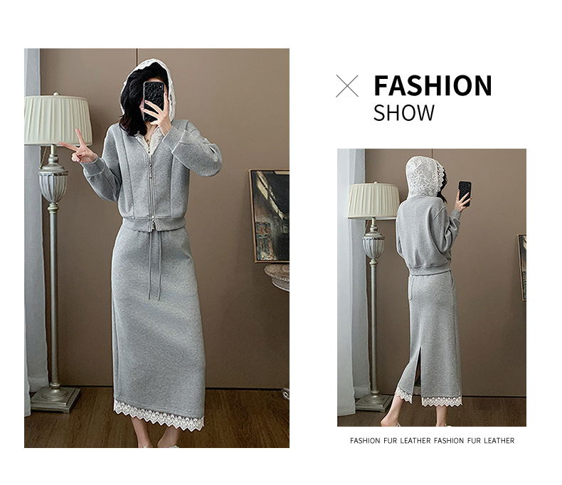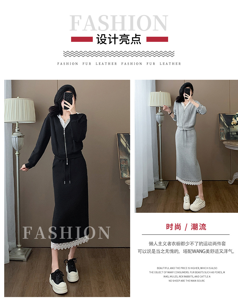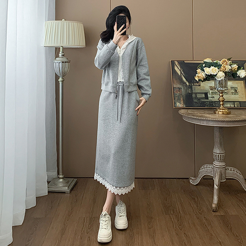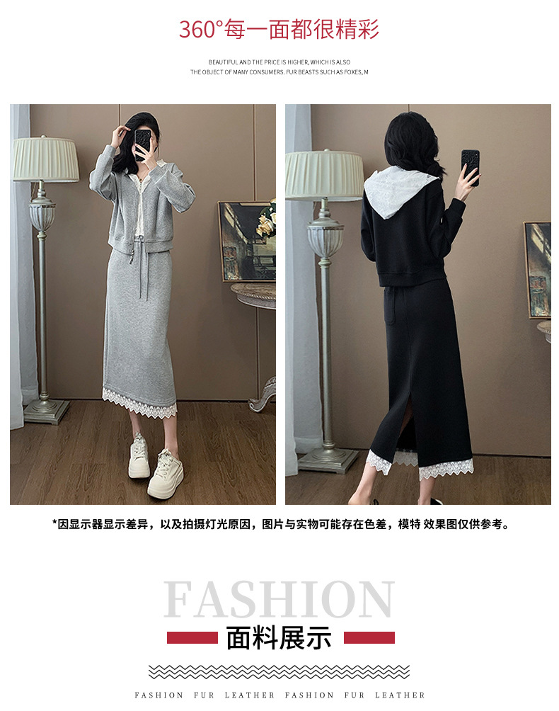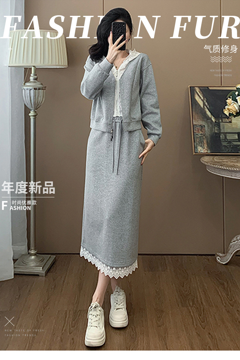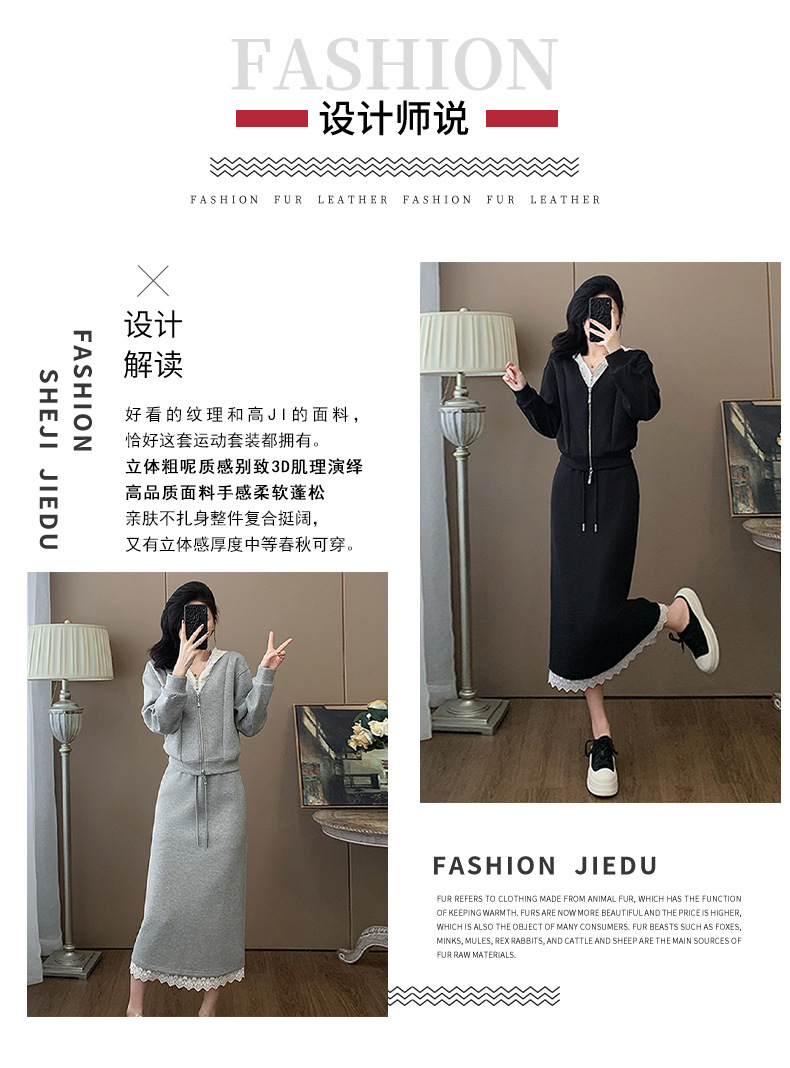 캐주얼 패션 원피스 여성의 봄 새로운 후드 지퍼 짧은 꽃 드로우 스트링 스커트 투피스 유행 세트