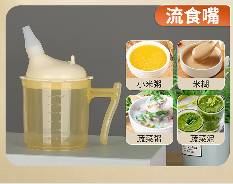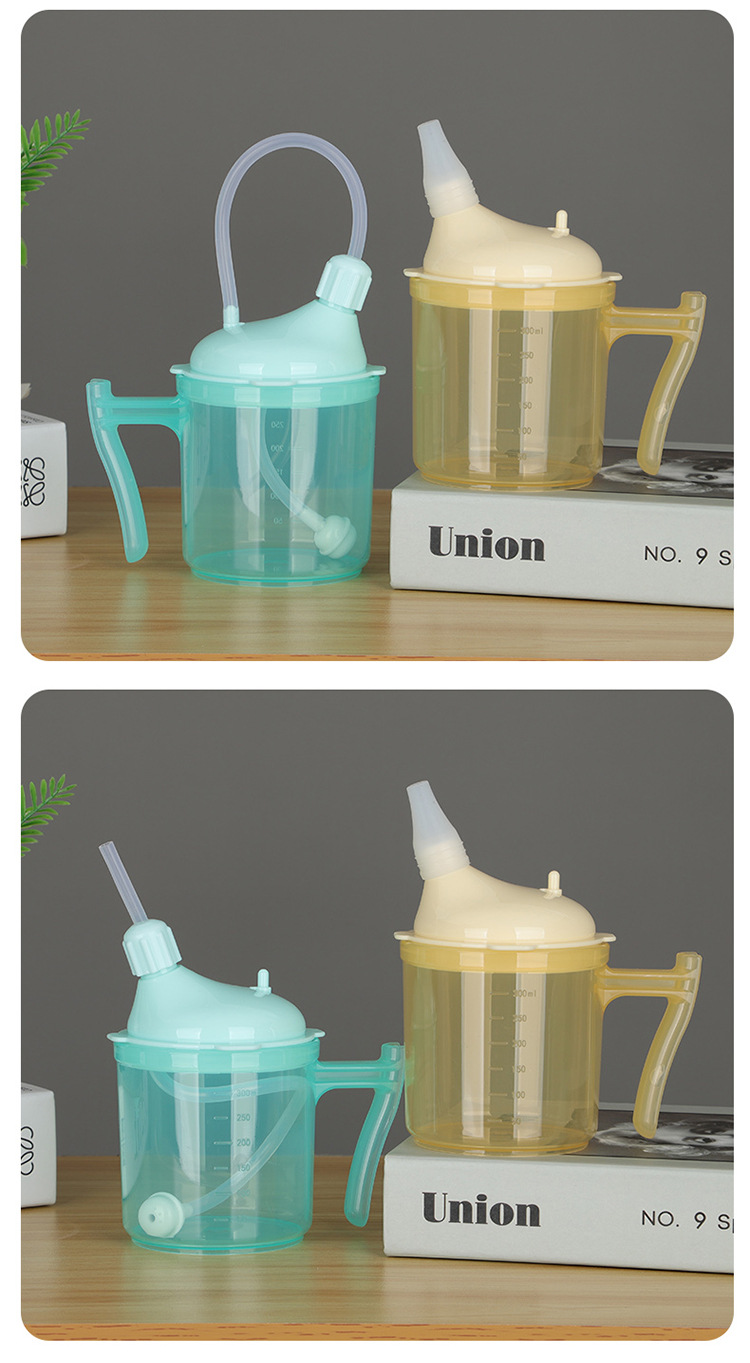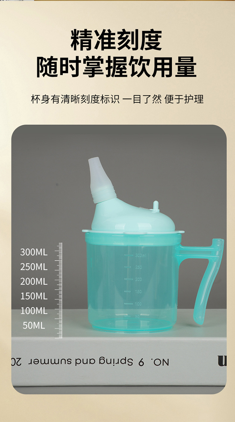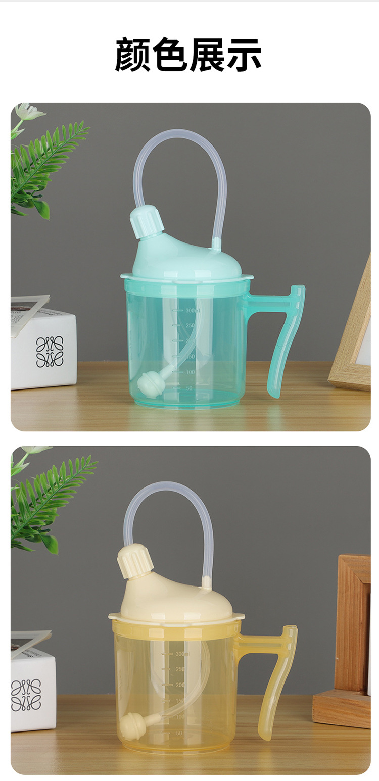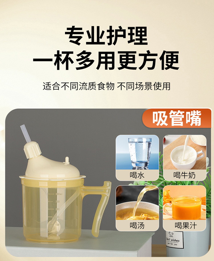 Bedrided 환자는 노인 식수를위한 푸드 케어 컵을 흐릅니다.