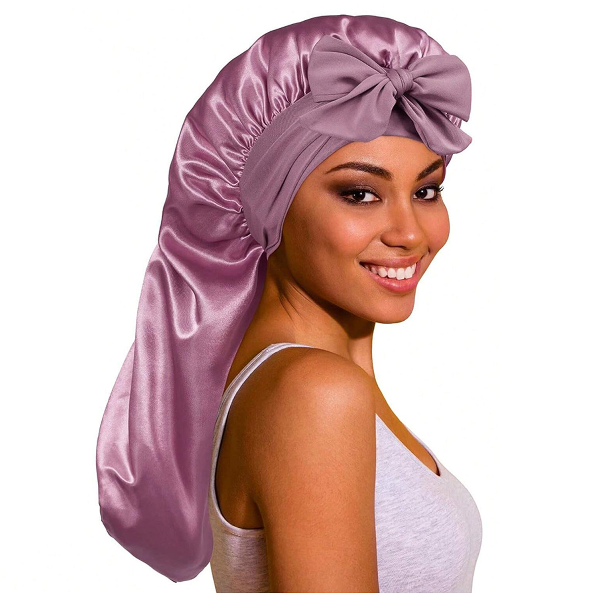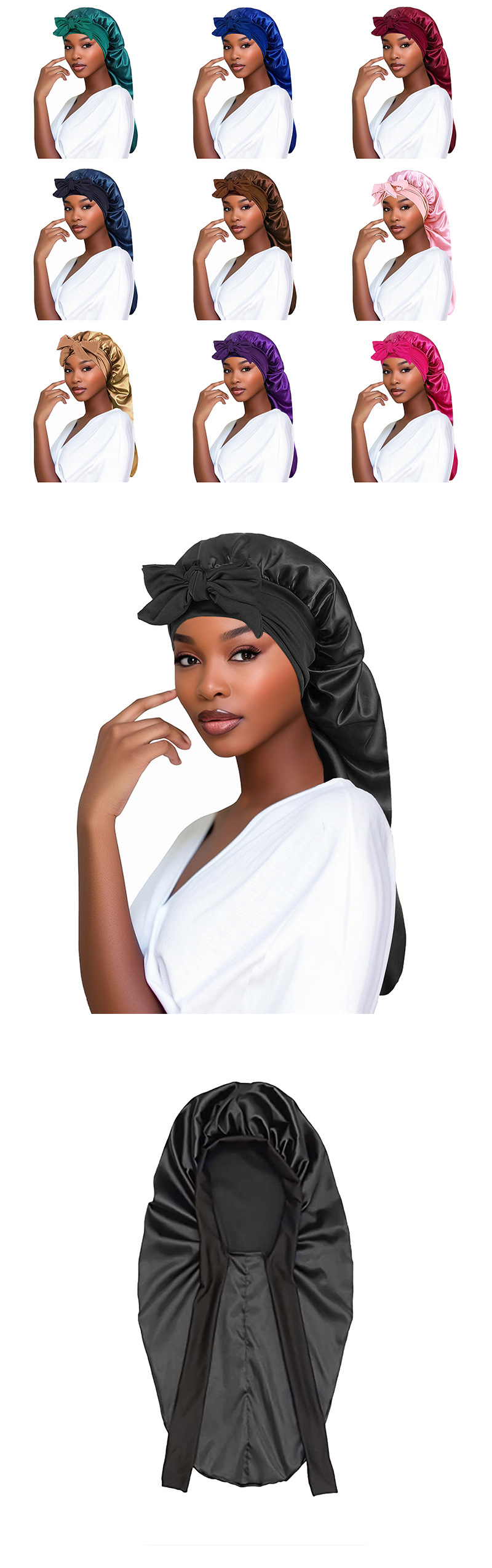 유럽과 미국의 새로운 스타일의 긴 꼬리 수면 모자, 고탄성 여성용 새틴 헤어 모자, 긴 리본 헤어 케어 모자, 큰 머리 둘레