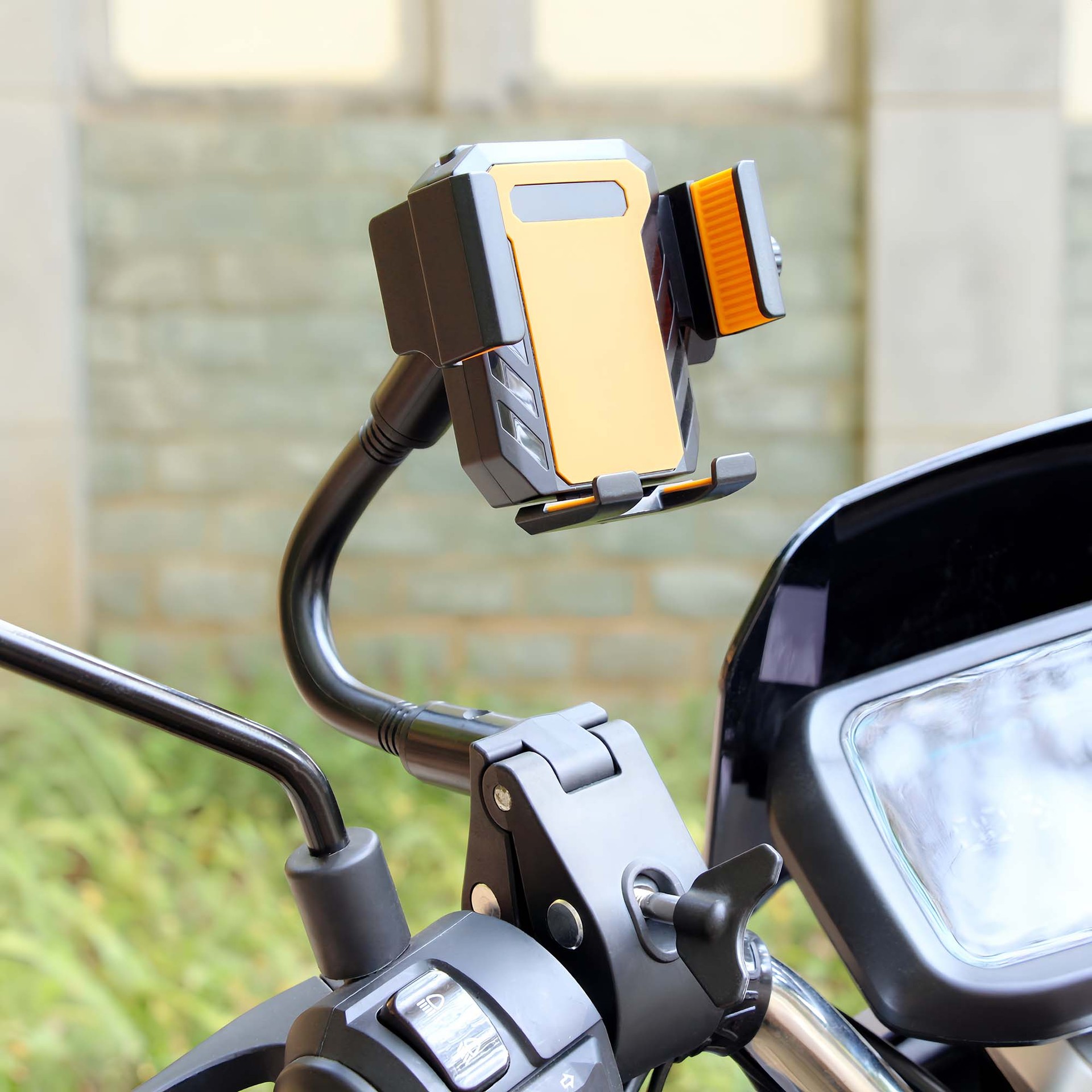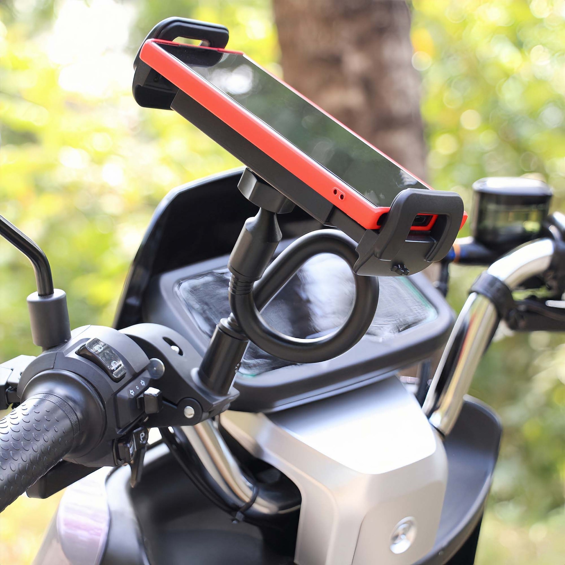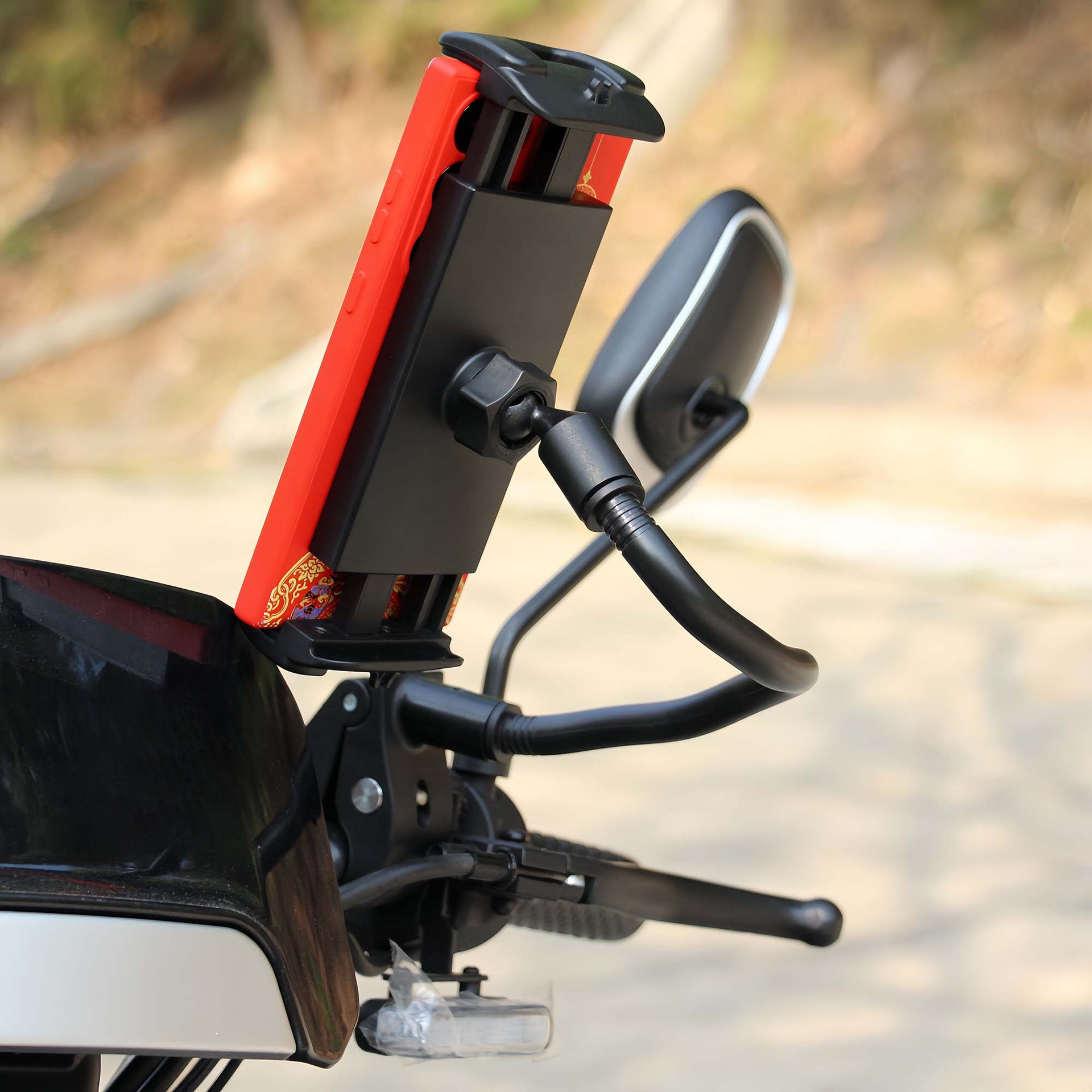 M008 超声无缝接合,线条光滑优美,手机平板通用,适用产品尺寸12.5至27CM距离之间使用,带充电线固定夹口,17球头接口通配任意支架,充电方便,预留充电口位。