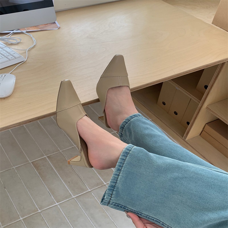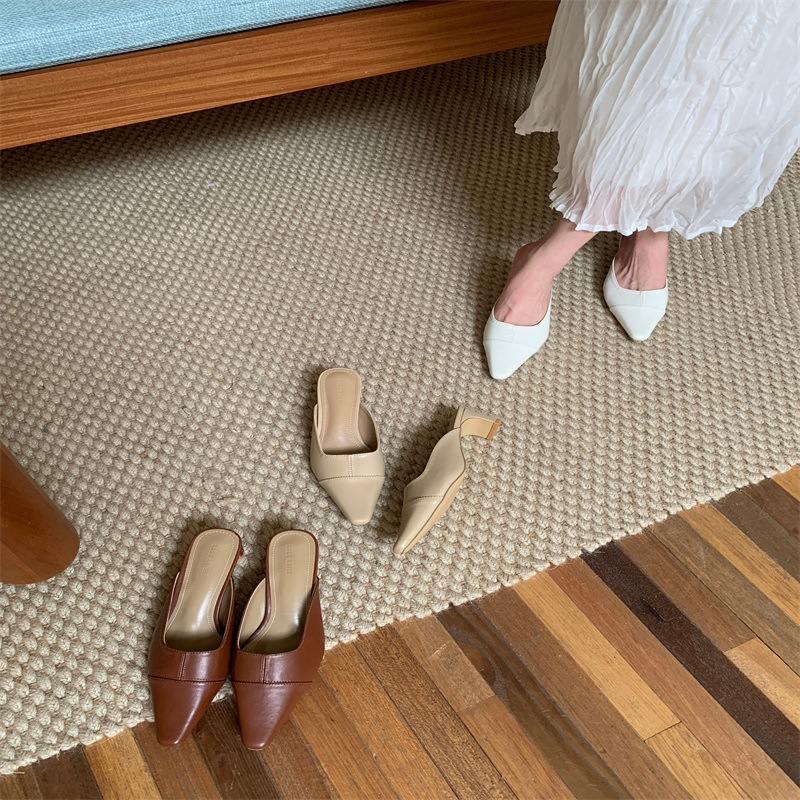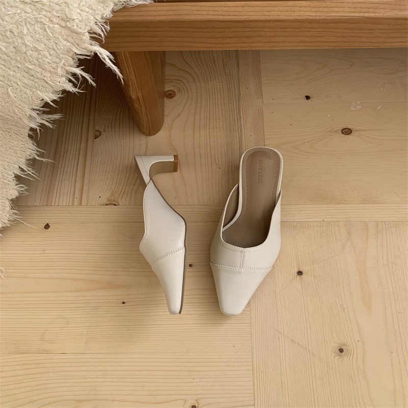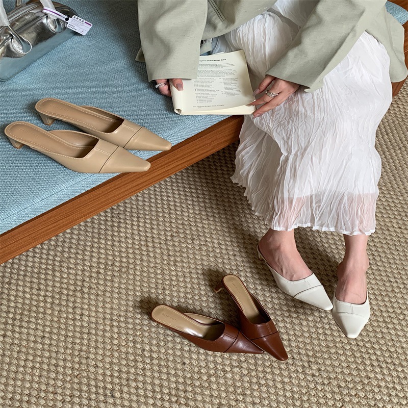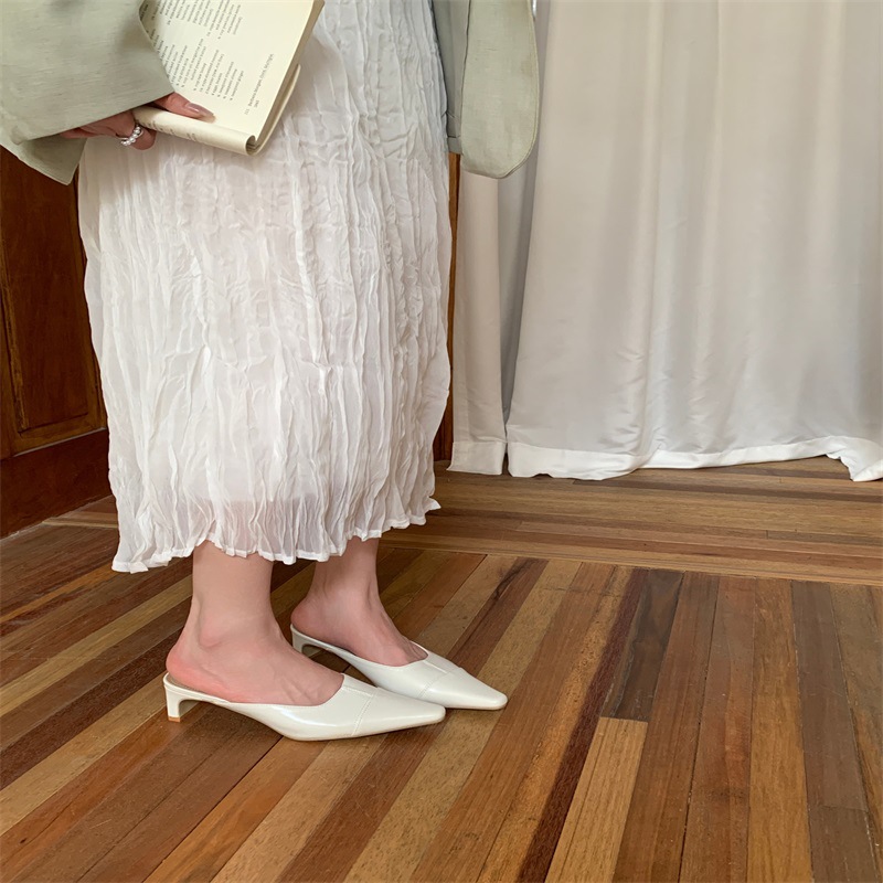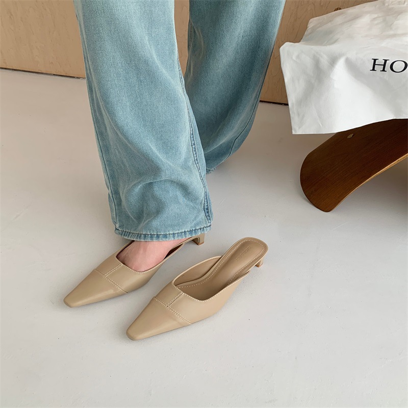 여성용 미드힐 레이지 힐리스 토 하프 슬리퍼, 패셔너블한 포인티드 토 두꺼운 굽 하이힐 뮬 샌들