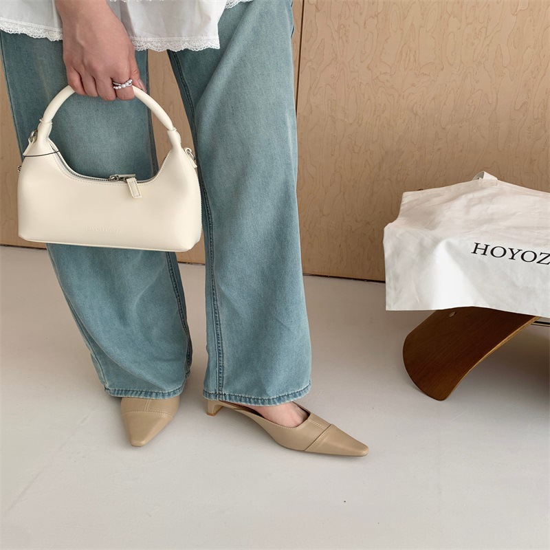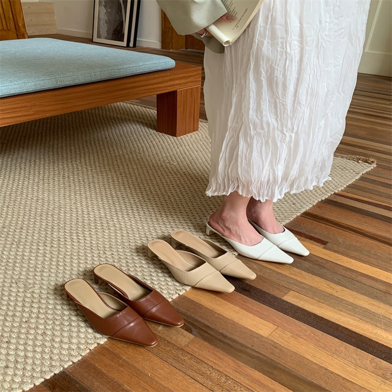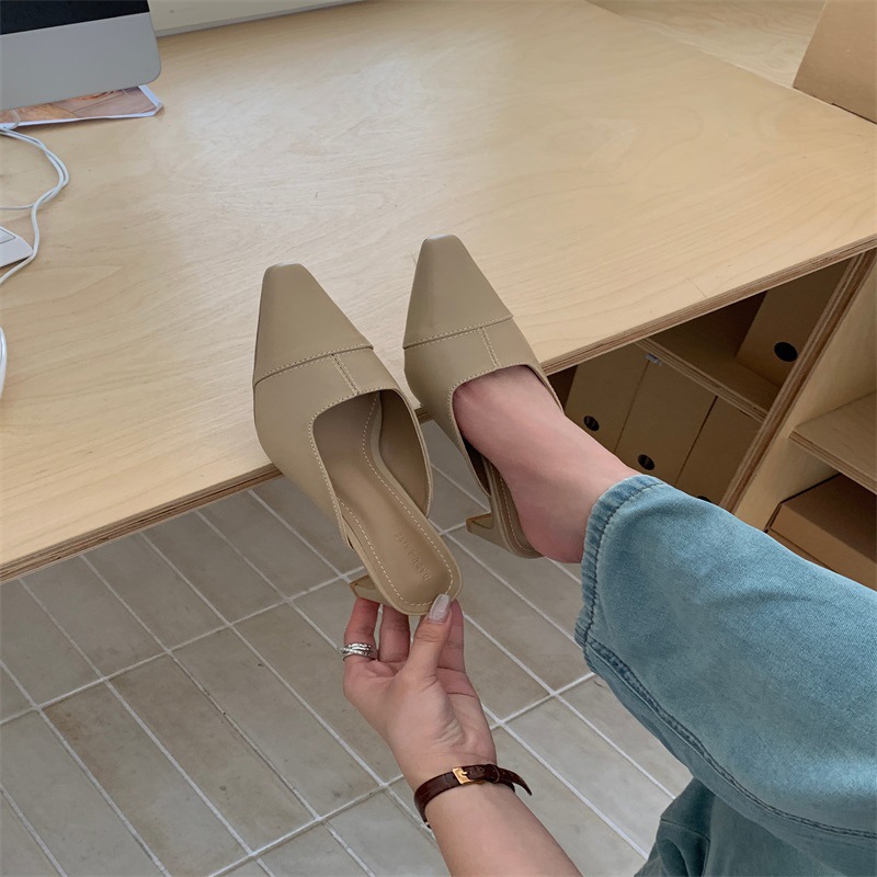 여성용 미드힐 레이지 힐리스 토 하프 슬리퍼, 패셔너블한 포인티드 토 두꺼운 굽 하이힐 뮬 샌들스토어 가기