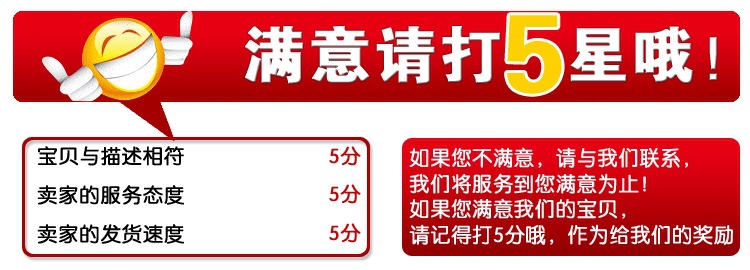 3.关于售后:我店售出商品,买家在收到货的当天,如果发现存在错发、漏发现象的:请于收货当天及时联系我店,协商相关事宜,超过三天我店一概不负责任!采购量大的大客户,在首次合作的情况下:如不确定货品品质是否符合要求的情况下,可以协商寄送样品,看样后,满意再下订单;事先没看样,成交后却因为货品不符合要求而导致的退换货,本店不予接受不予退换。(必须要声明的是:本店所有廉价小商品都不能跟数码产品相比,没有售后服务;售出之后,不包退换!)