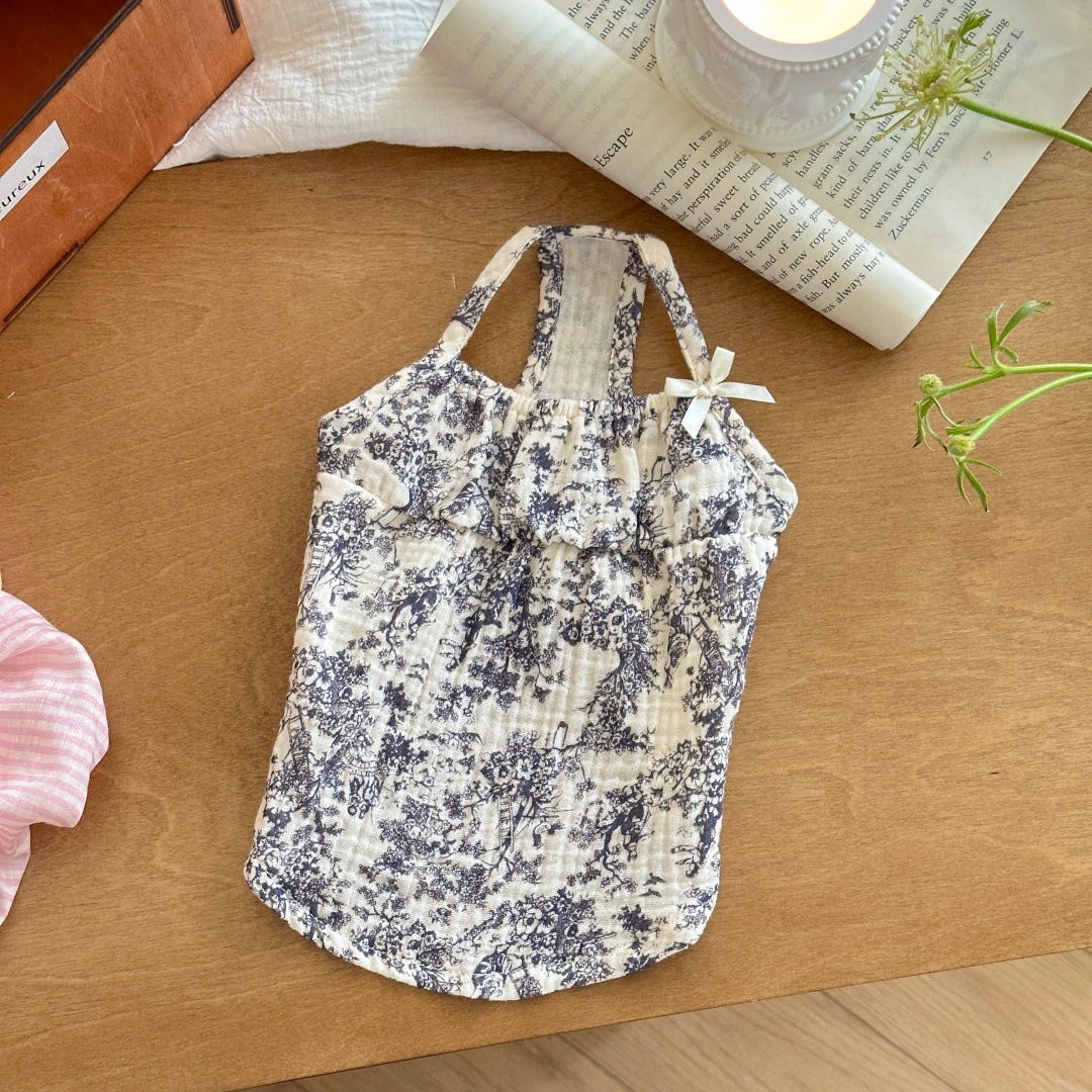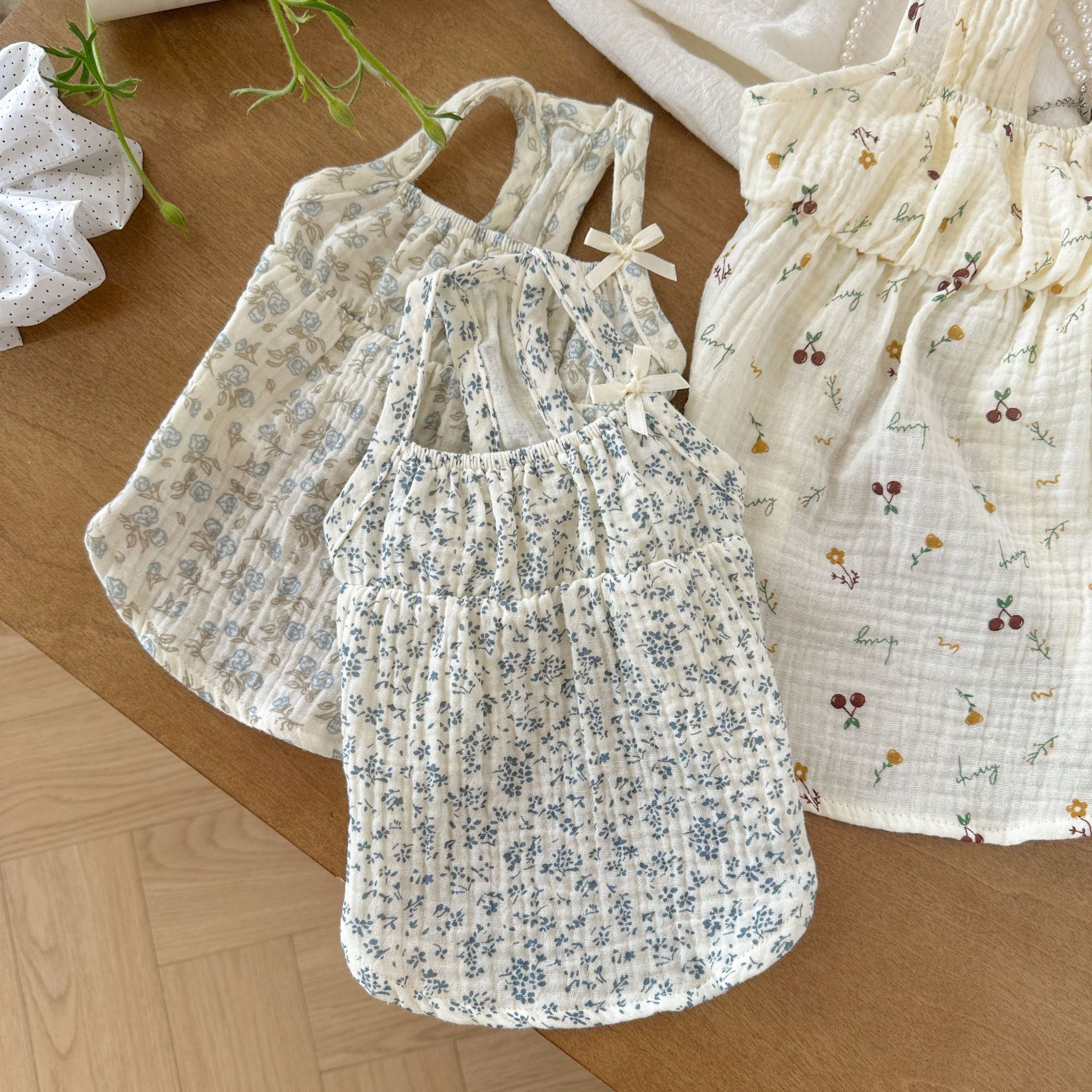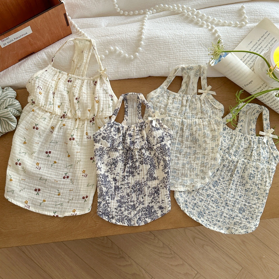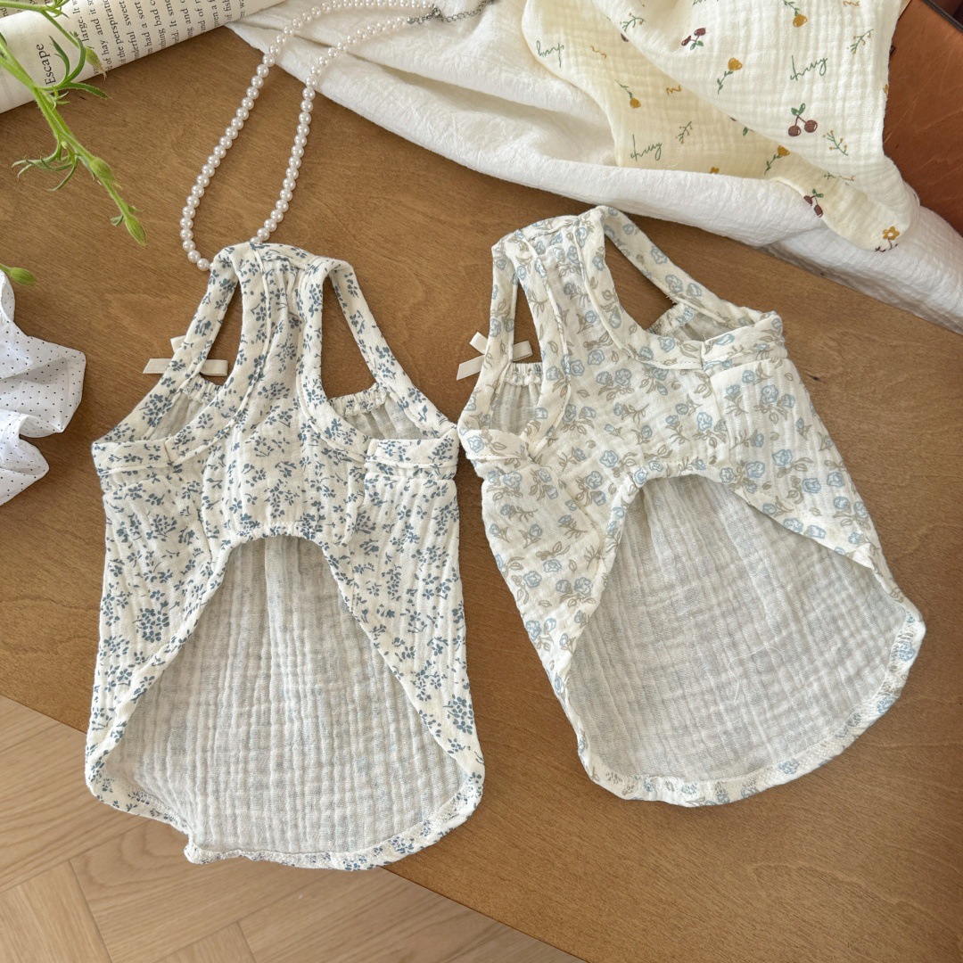 리본 장식 면 거즈 조끼 스커트 애완동물 옷 소형견 고양이 용품 봄 여름 반팔