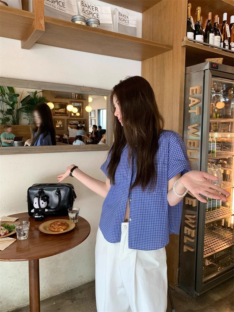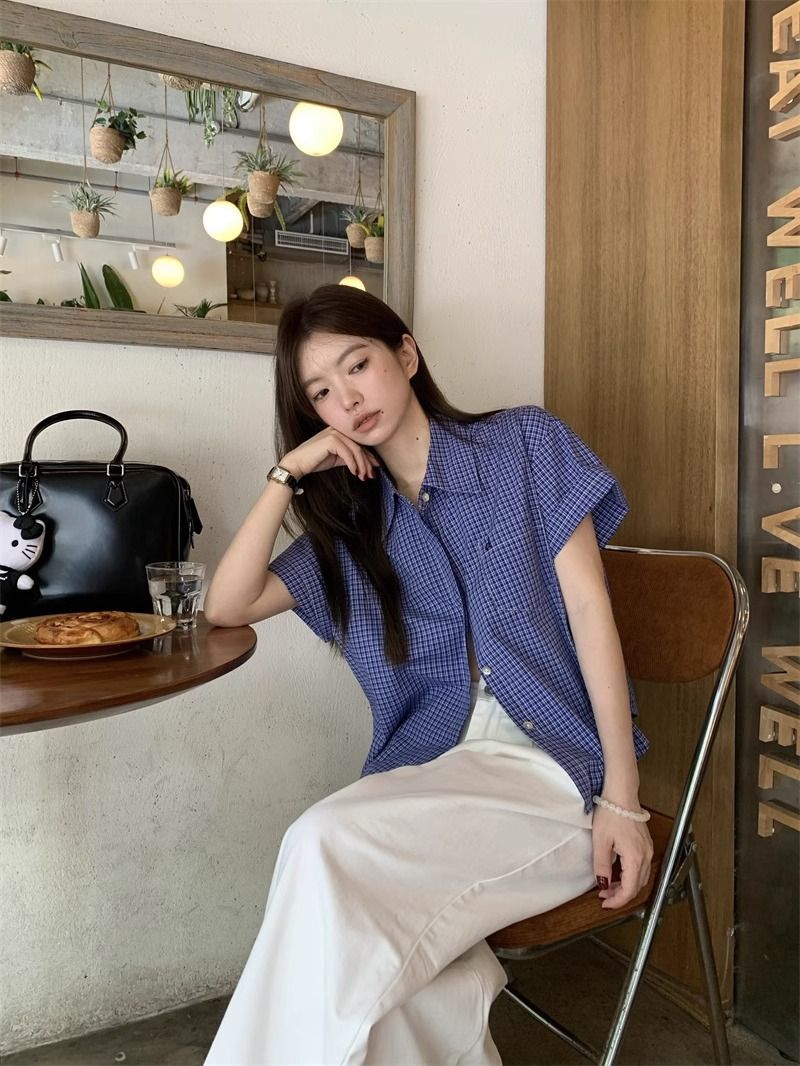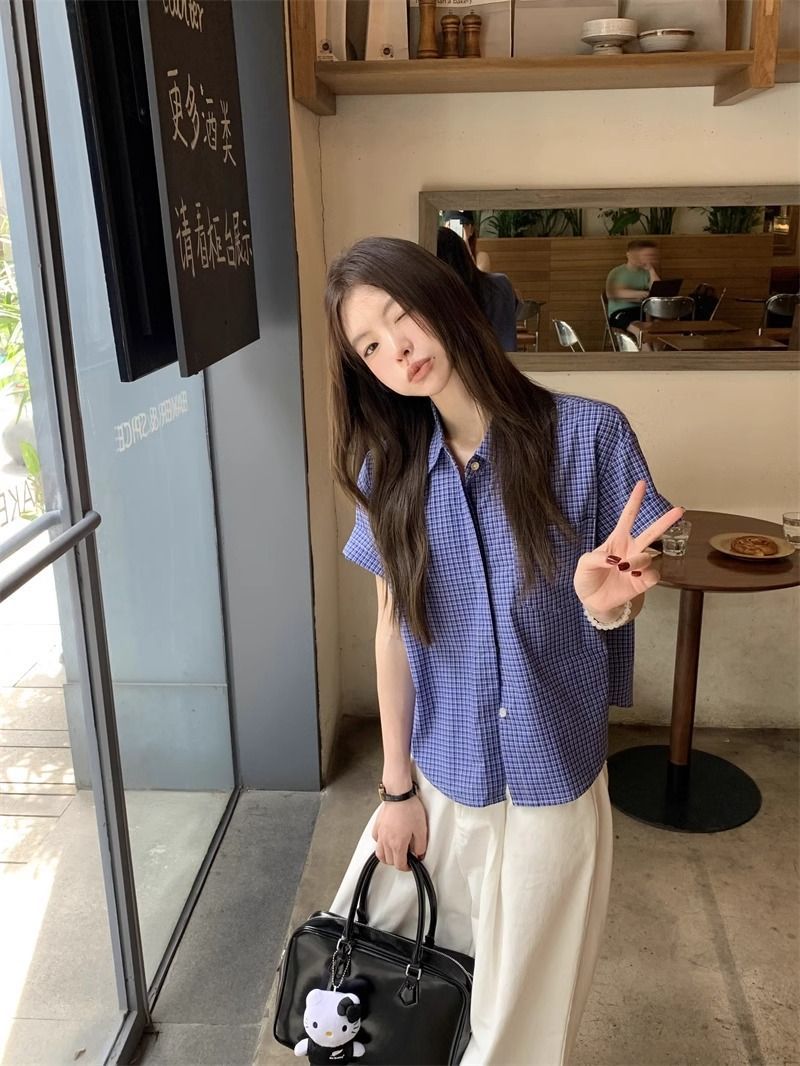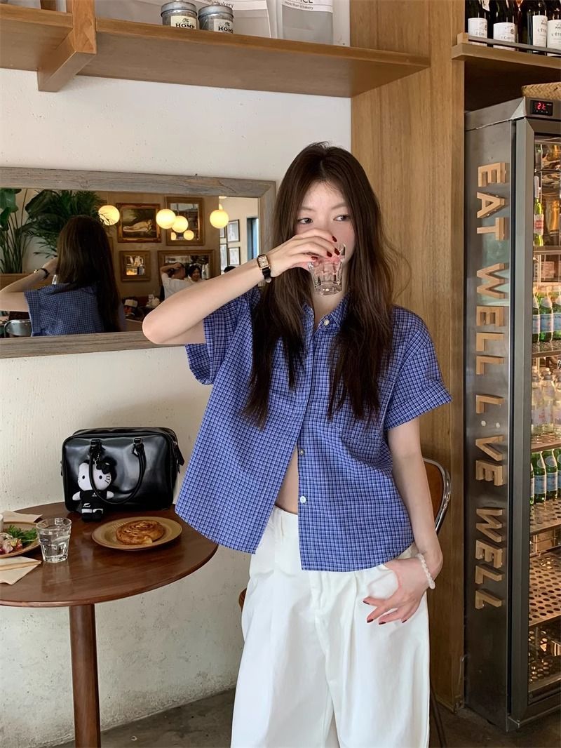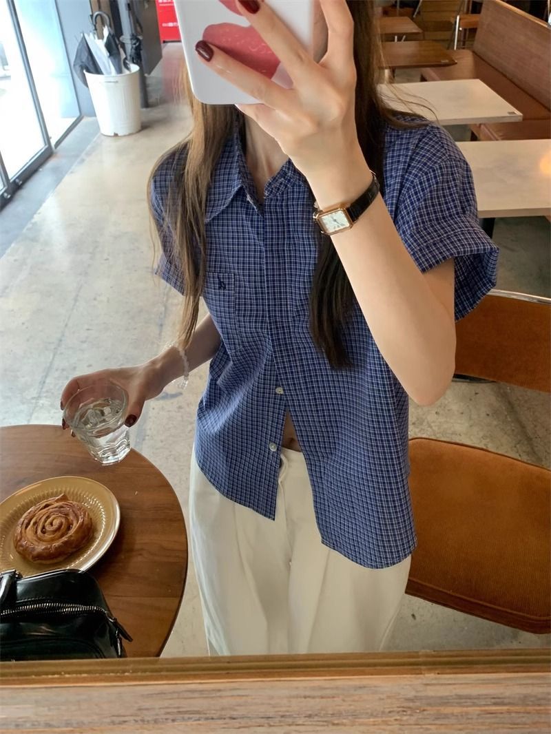 블루 캐주얼 격자 무늬 반팔 셔츠 여성 여름 느슨한 옷깃 틈새 미국 복고풍 대학 스타일 새로운 탑스토어 가기