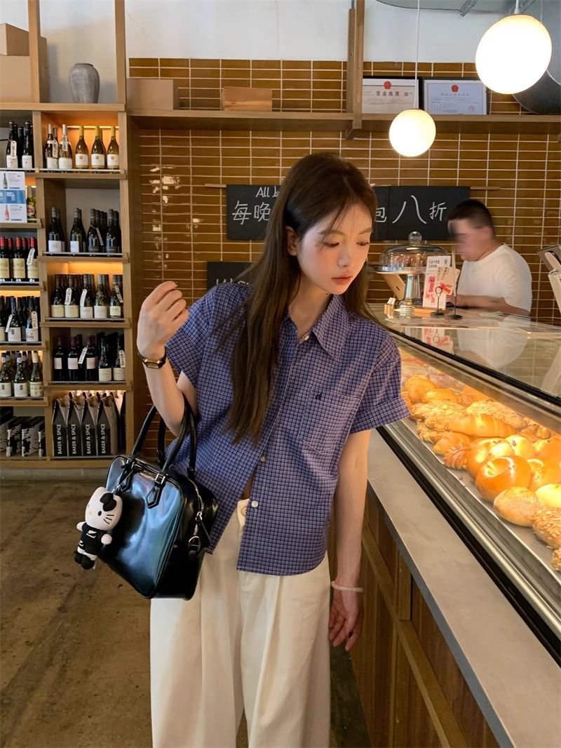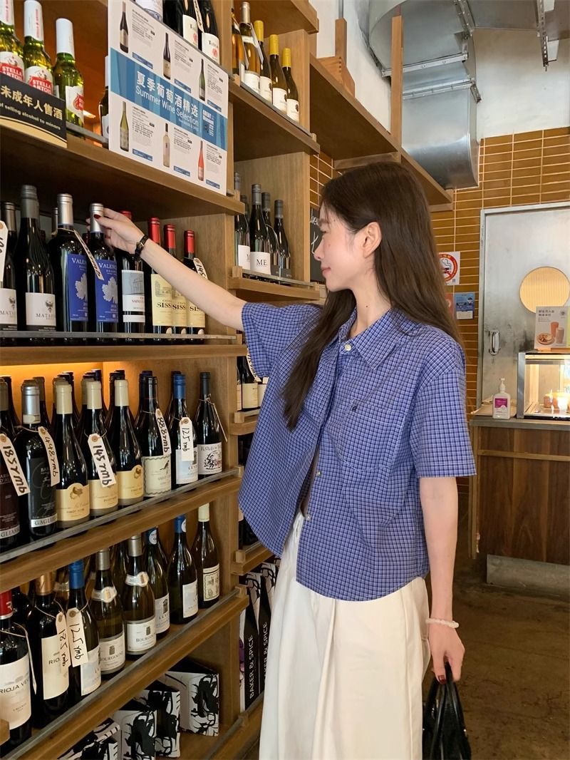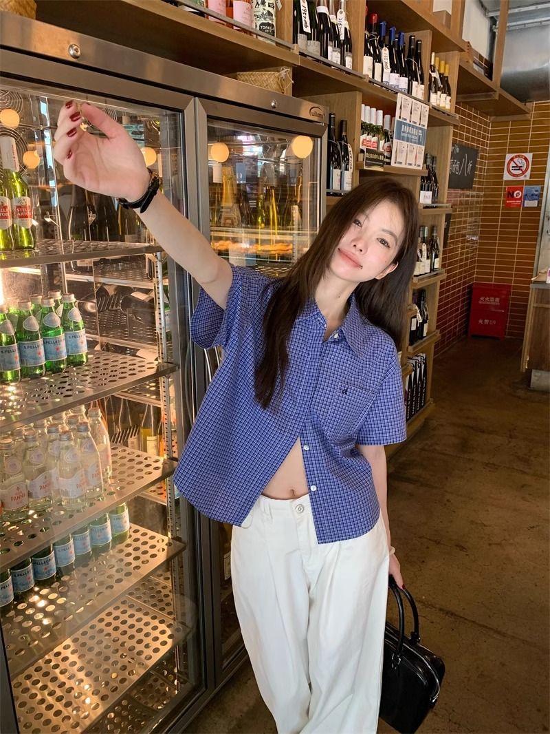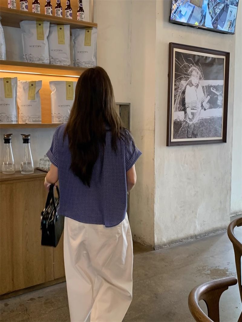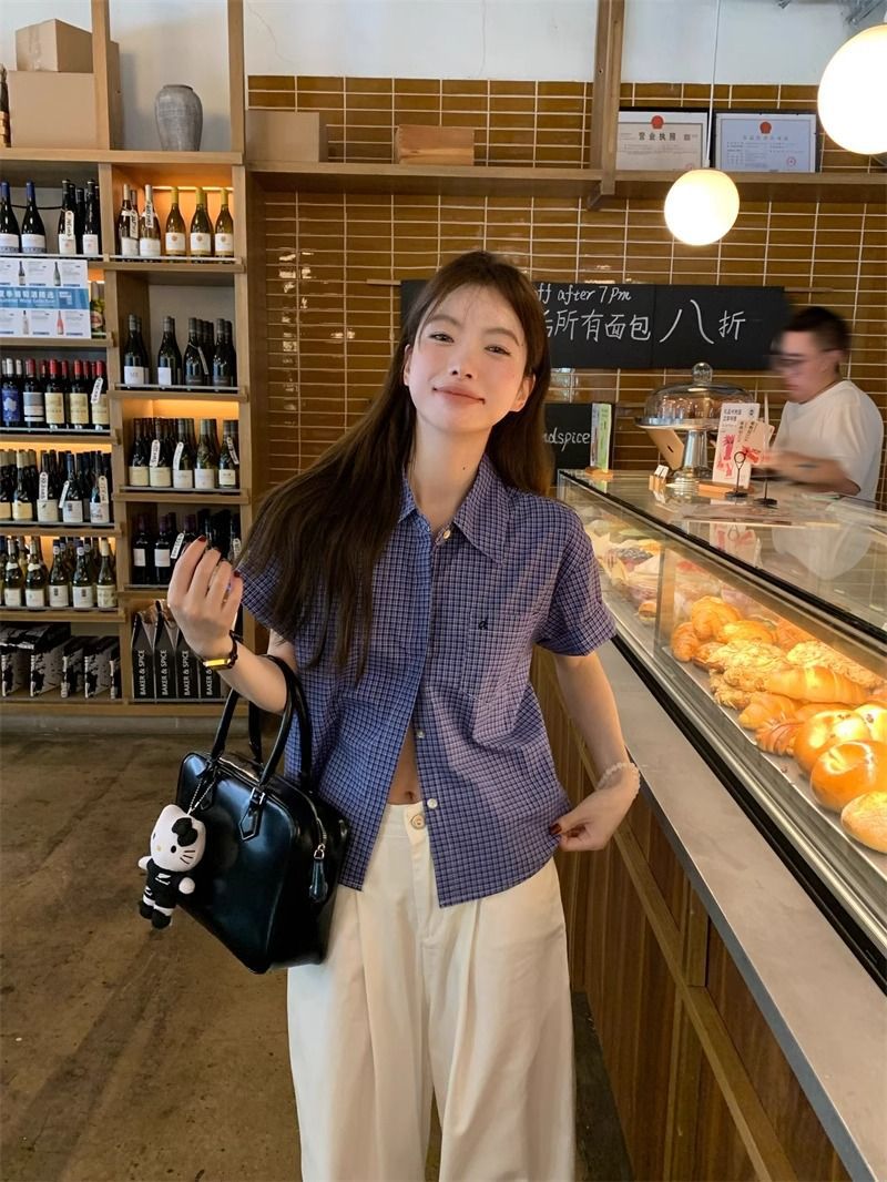 블루 캐주얼 격자 무늬 반팔 셔츠 여성 여름 느슨한 옷깃 틈새 미국 복고풍 대학 스타일 새로운 탑스토어 가기