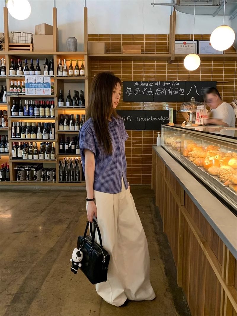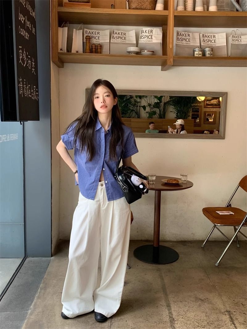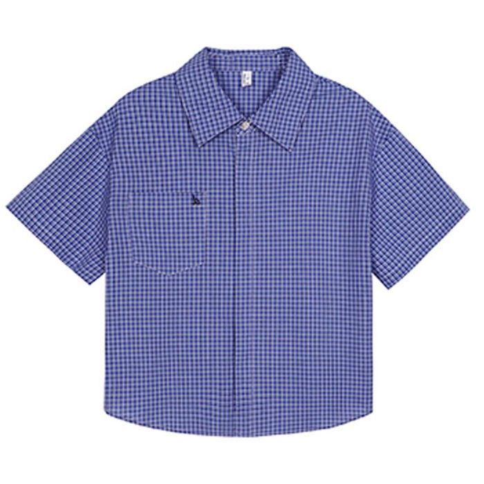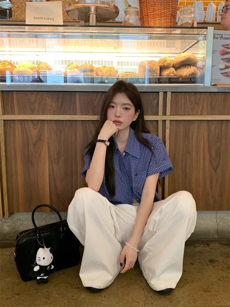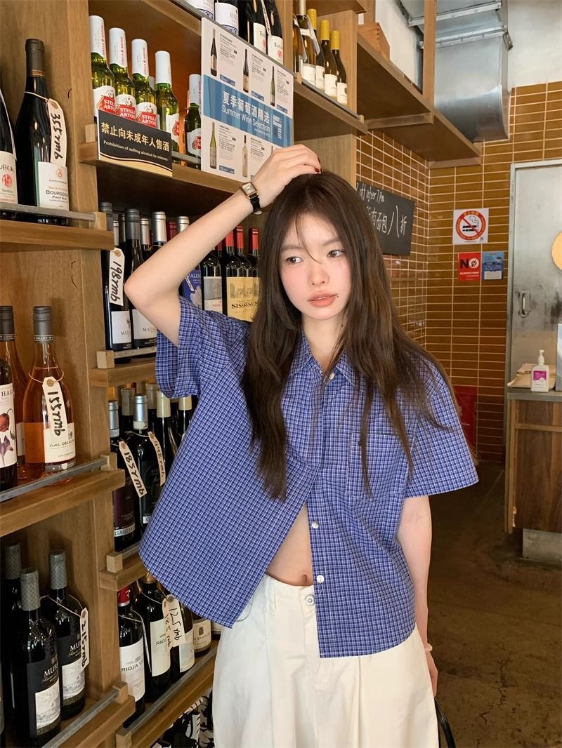 블루 캐주얼 격자 무늬 반팔 셔츠 여성 여름 느슨한 옷깃 틈새 미국 복고풍 대학 스타일 새로운 탑스토어 가기