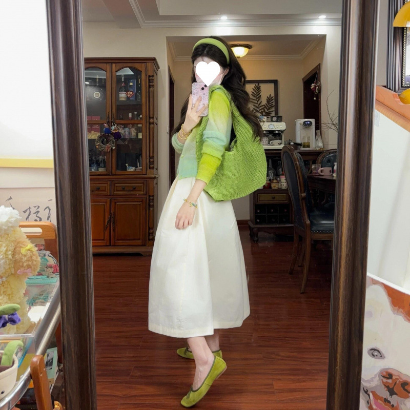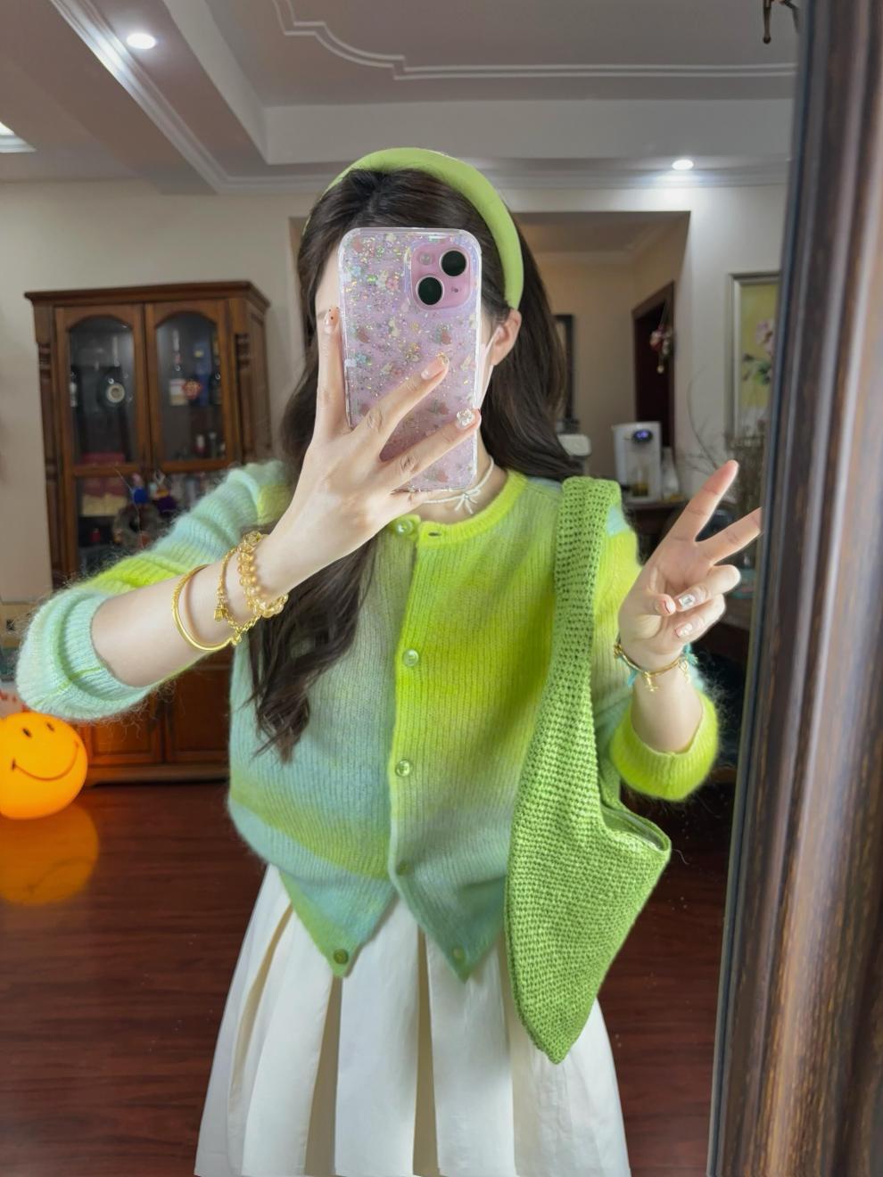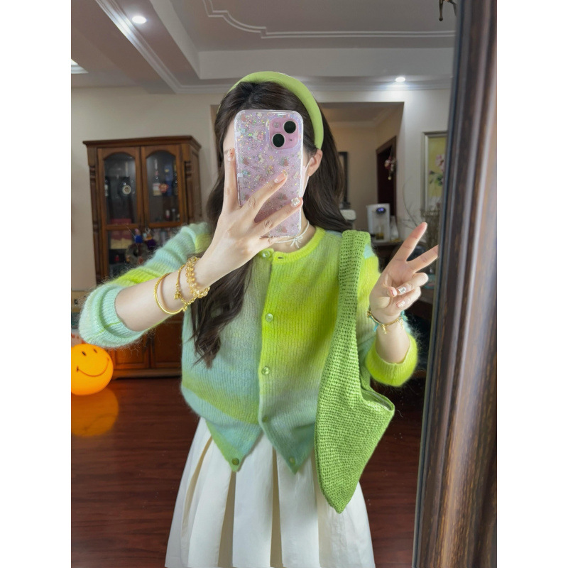 2025 봄, 가을, 겨울, 여름 여성용 한국식 그라데이션 그린 긴팔 니트 가디건, 루즈한 디자인의 짧은 탑스토어 가기