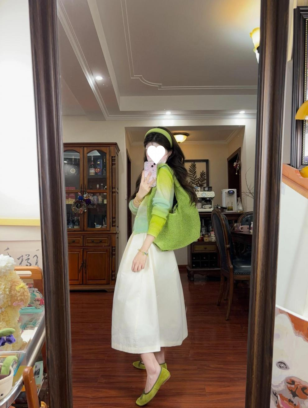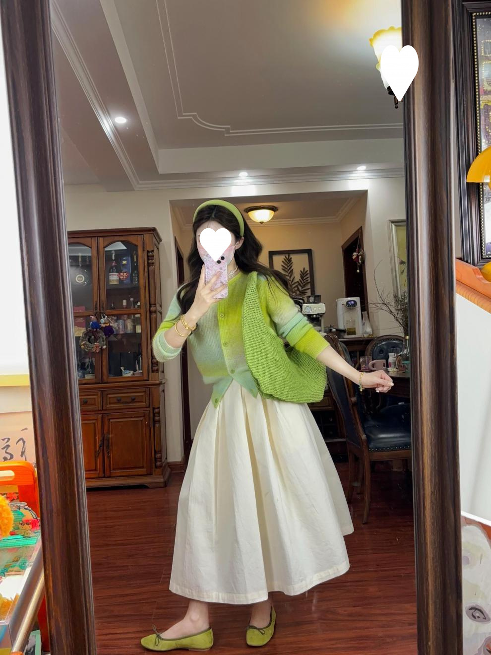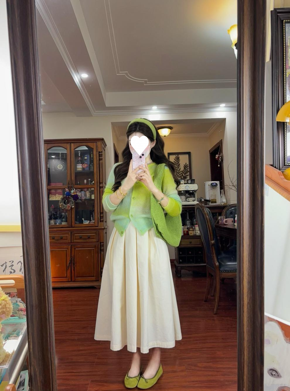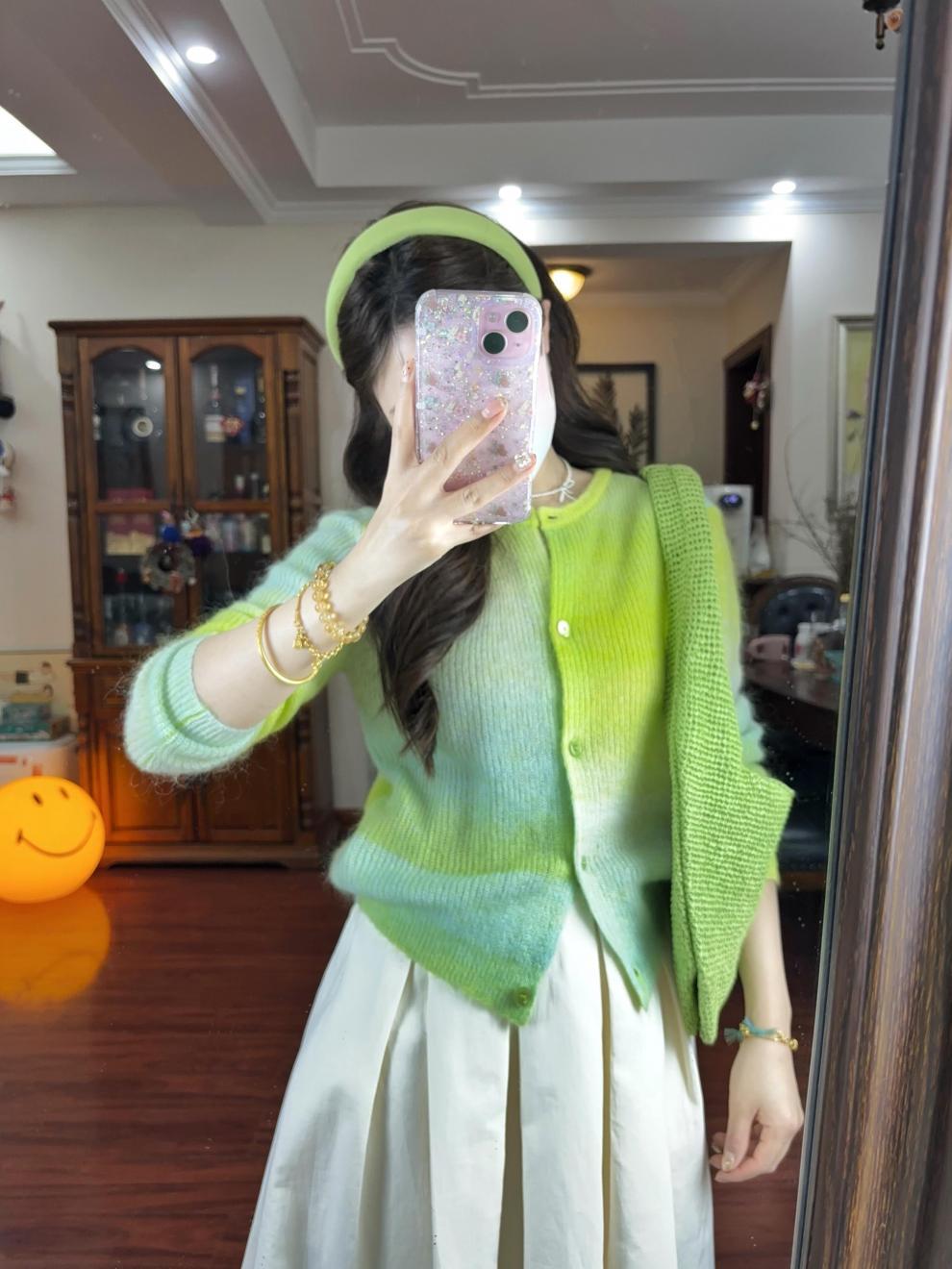 2025 봄, 가을, 겨울, 여름 여성용 한국식 그라데이션 그린 긴팔 니트 가디건, 루즈한 디자인의 짧은 탑