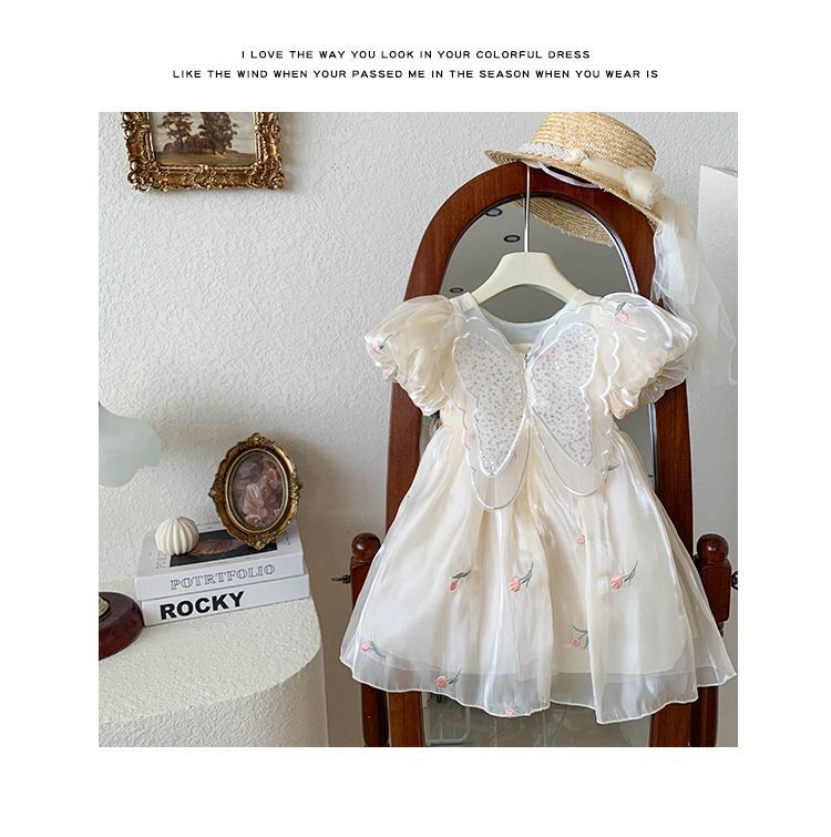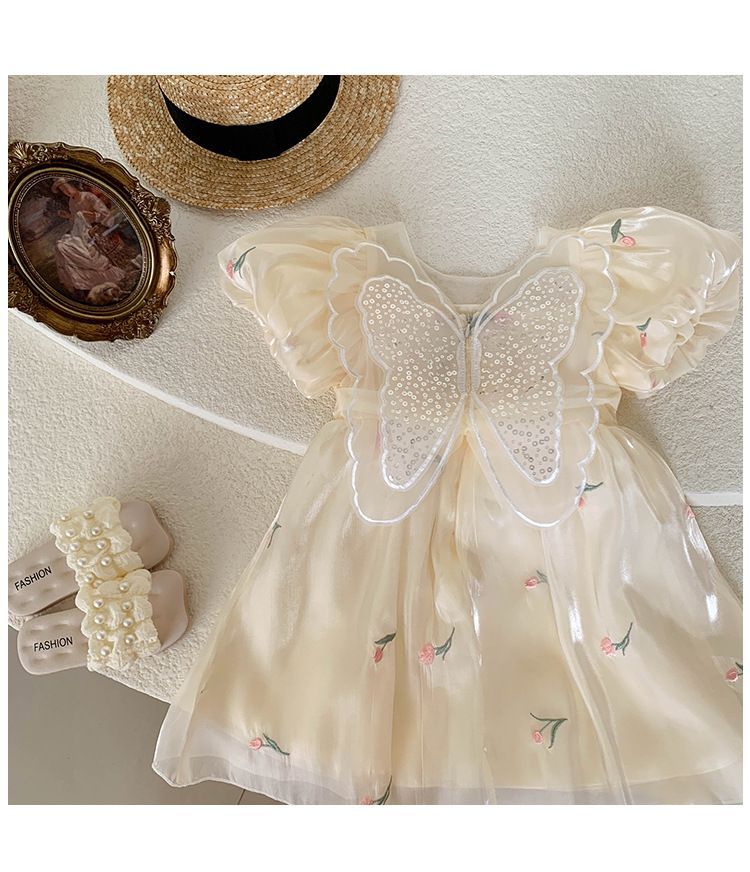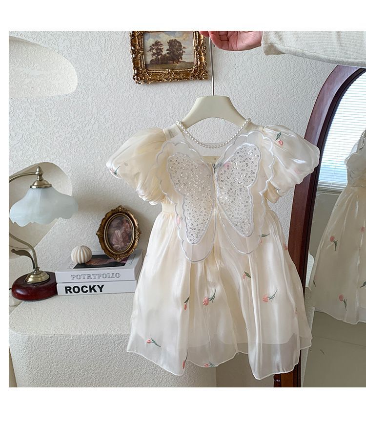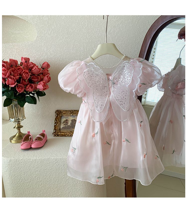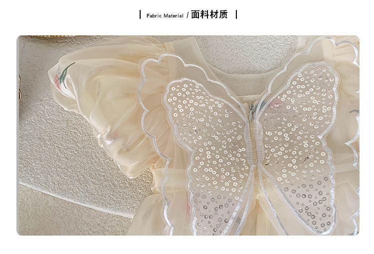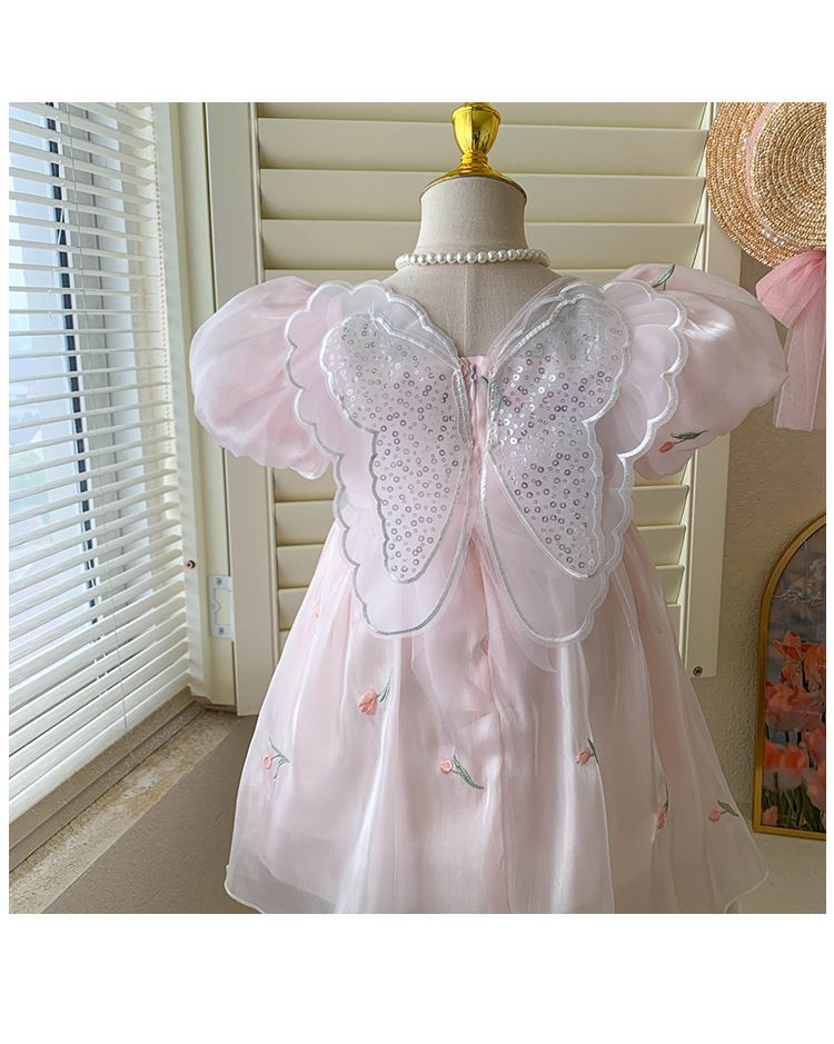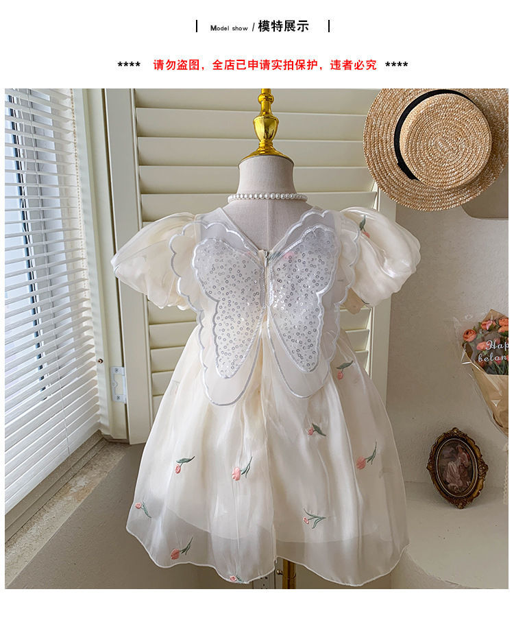 2023 년 여름 새 여아 달콤한 3 차원 스팽글 날개 자수 꽃 퍼프 소매 짧은 소매 공주 원피스스토어 가기