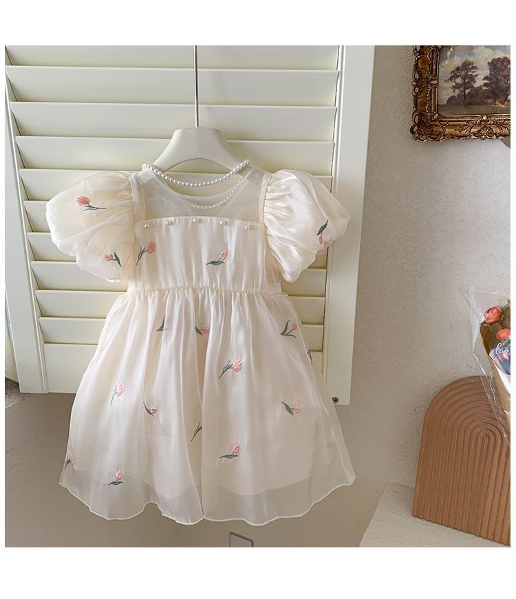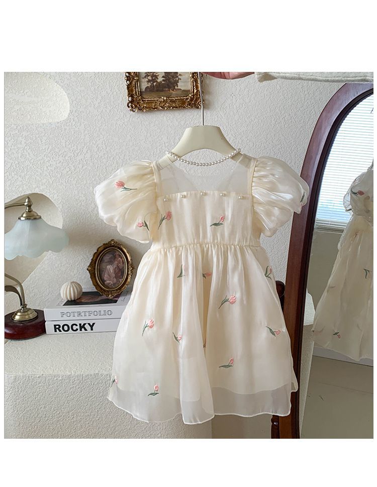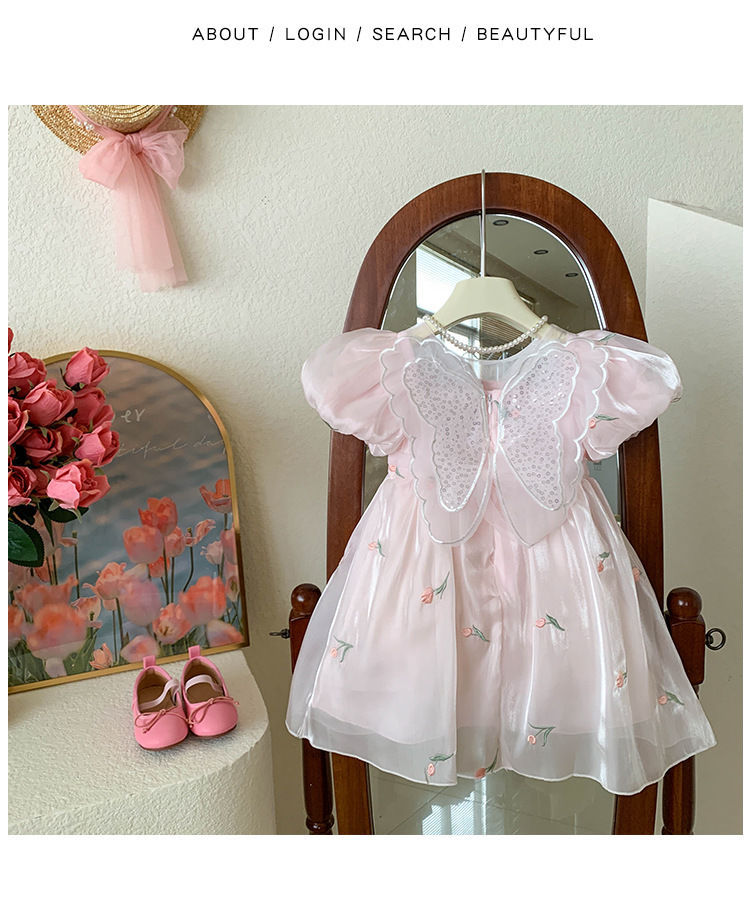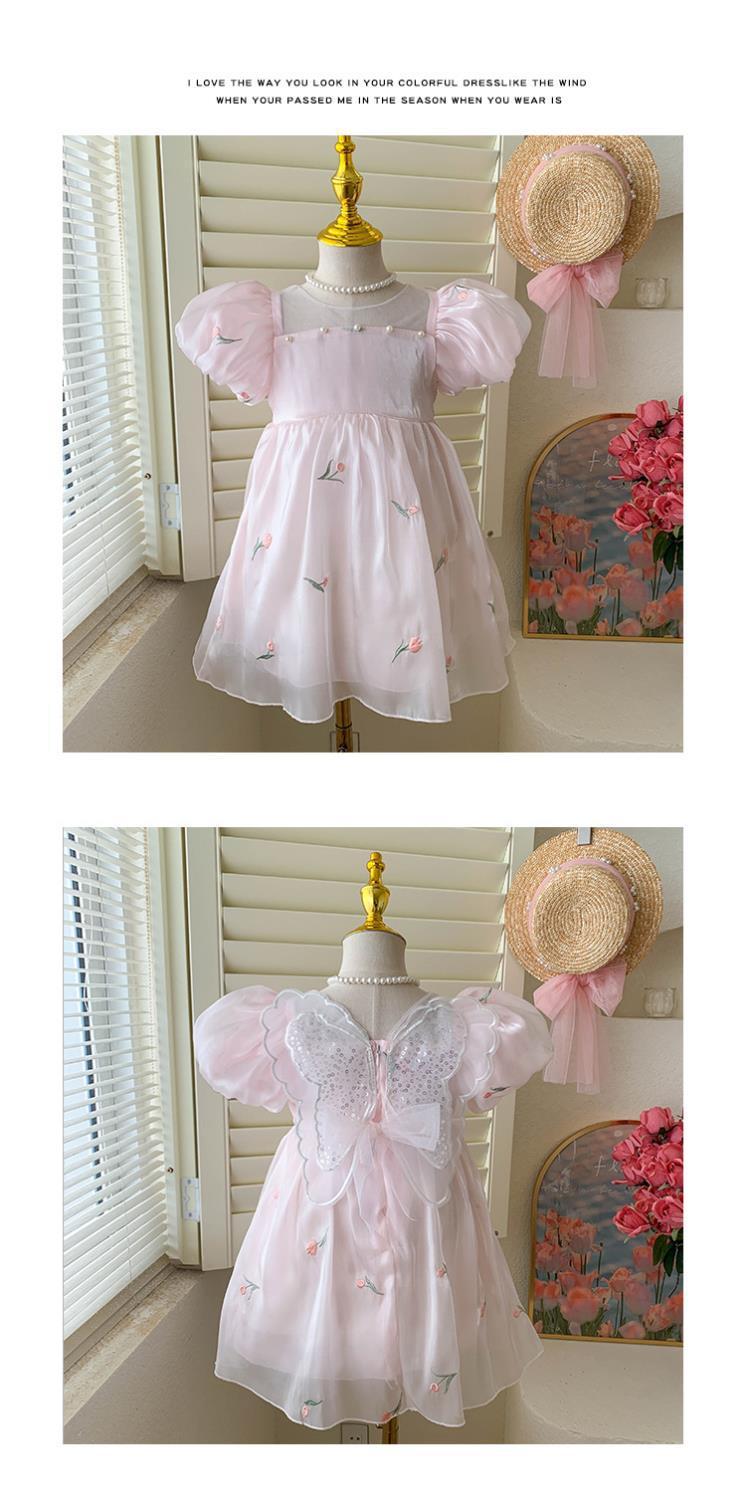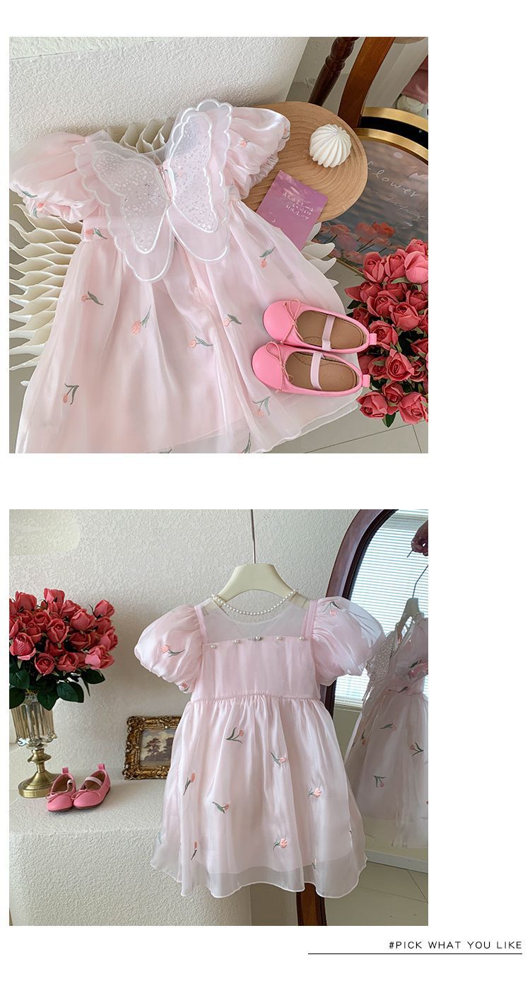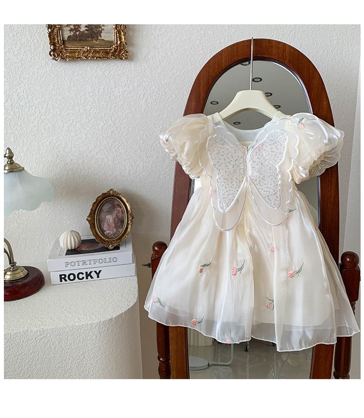2023 년 여름 새 여아 달콤한 3 차원 스팽글 날개 자수 꽃 퍼프 소매 짧은 소매 공주 원피스스토어 가기