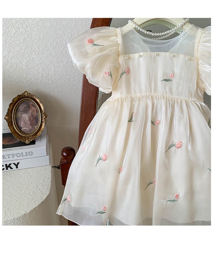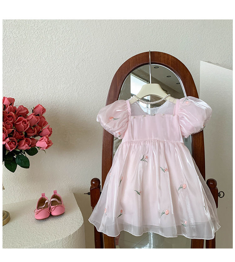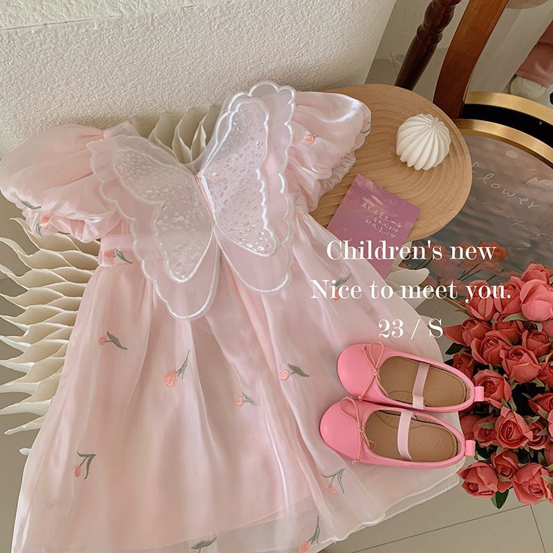 2023 년 여름 새 여아 달콤한 3 차원 스팽글 날개 자수 꽃 퍼프 소매 짧은 소매 공주 원피스