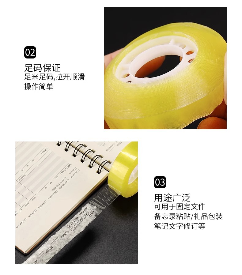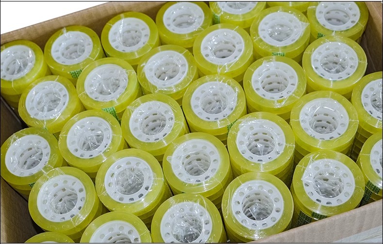 작고 투명한 테이프는 잘 끊어지지 않으며, 학생용 문구, 사무용품, 영어 테이프, 포장 및 밀봉용 테이프, 강력한 접착력의 봉인 테이프입니다.