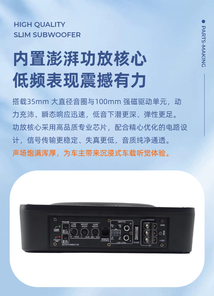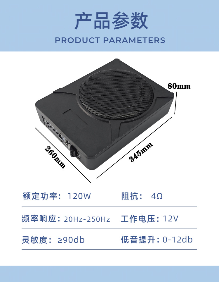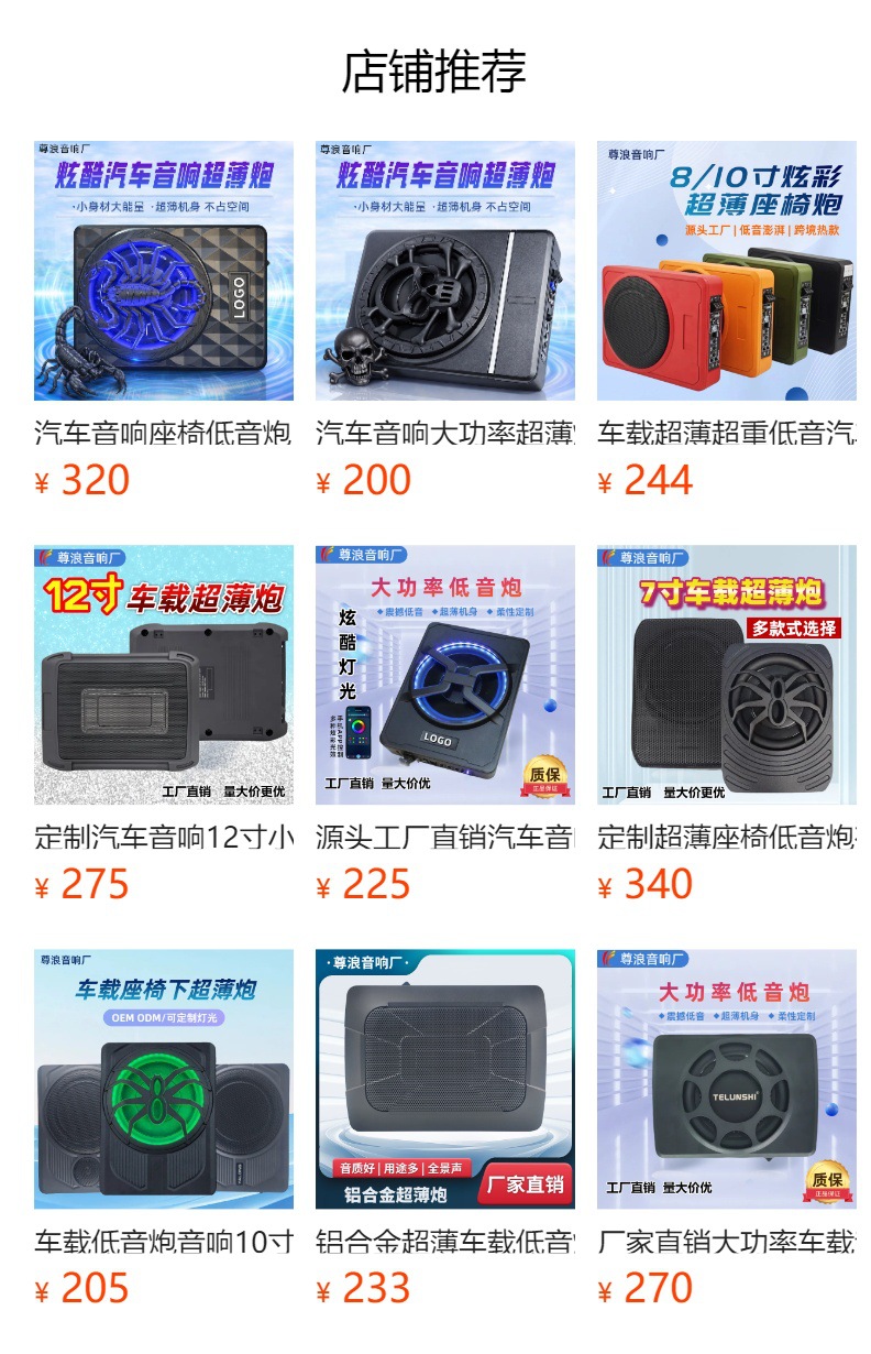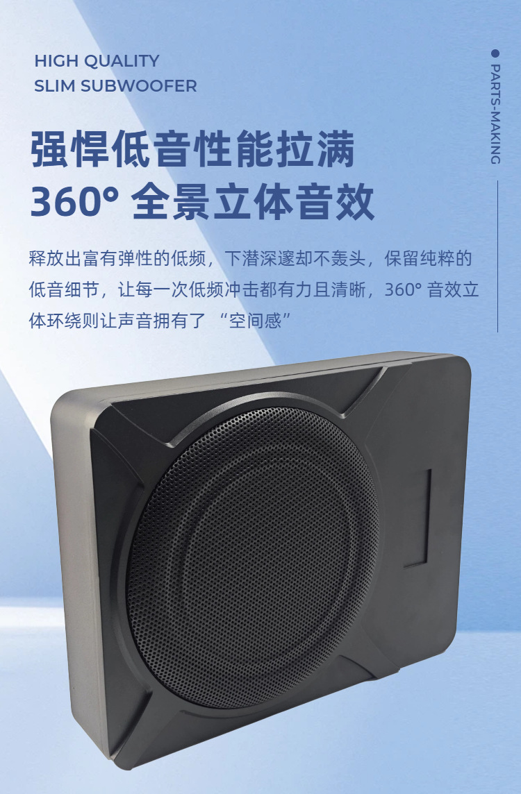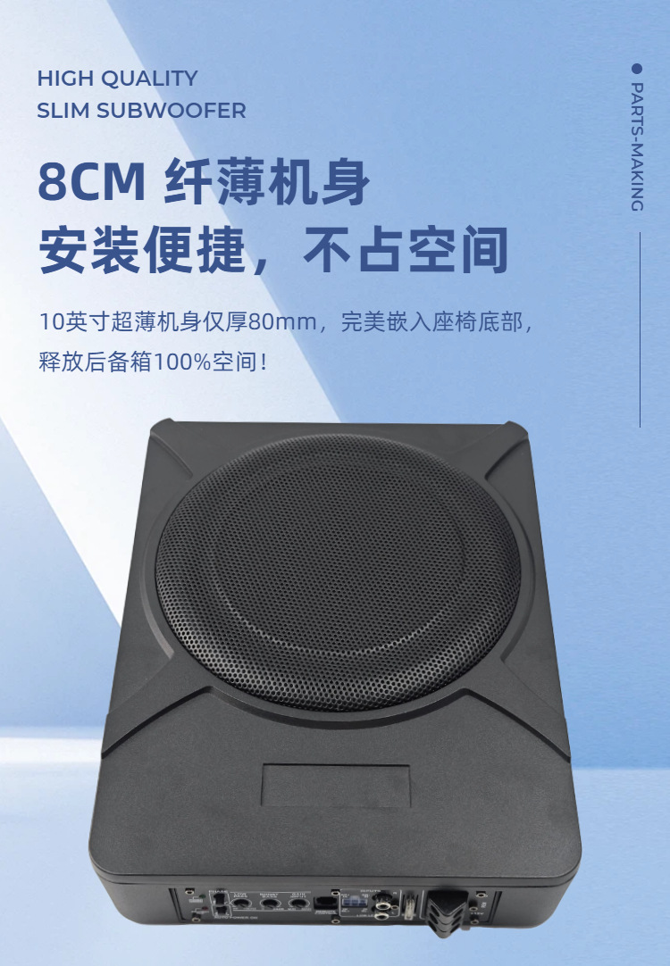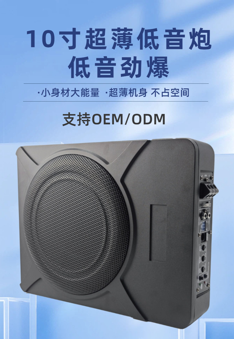 A1:本品为12V车载超薄低音炮,适配轿车、SUV、MPV等全品类12V车型,覆盖汽车改装店、4S店加装、汽配批发商、车载影音品牌商、贸易商等B端客户的供货需求;支持8寸/10寸/定制尺寸及多款型号选择,可根据终端车主空间、低频需求精准匹配,满足不同改装方案与市场定位。