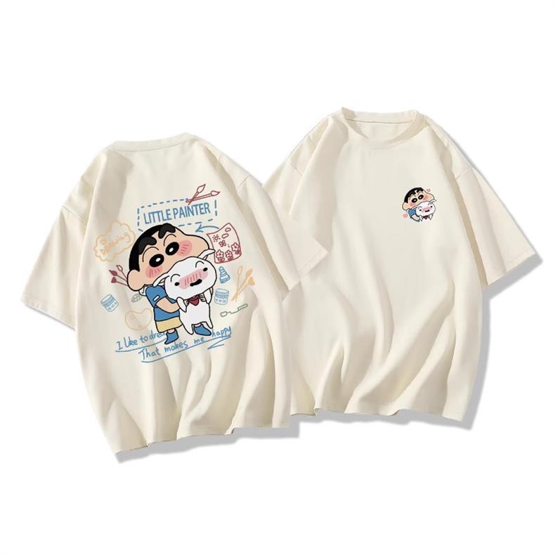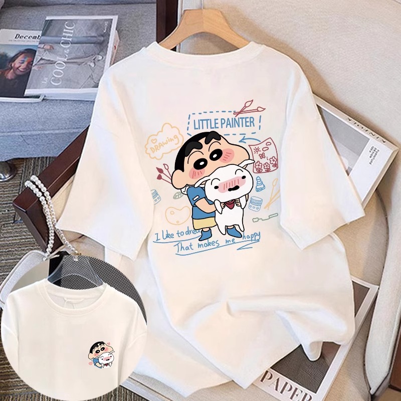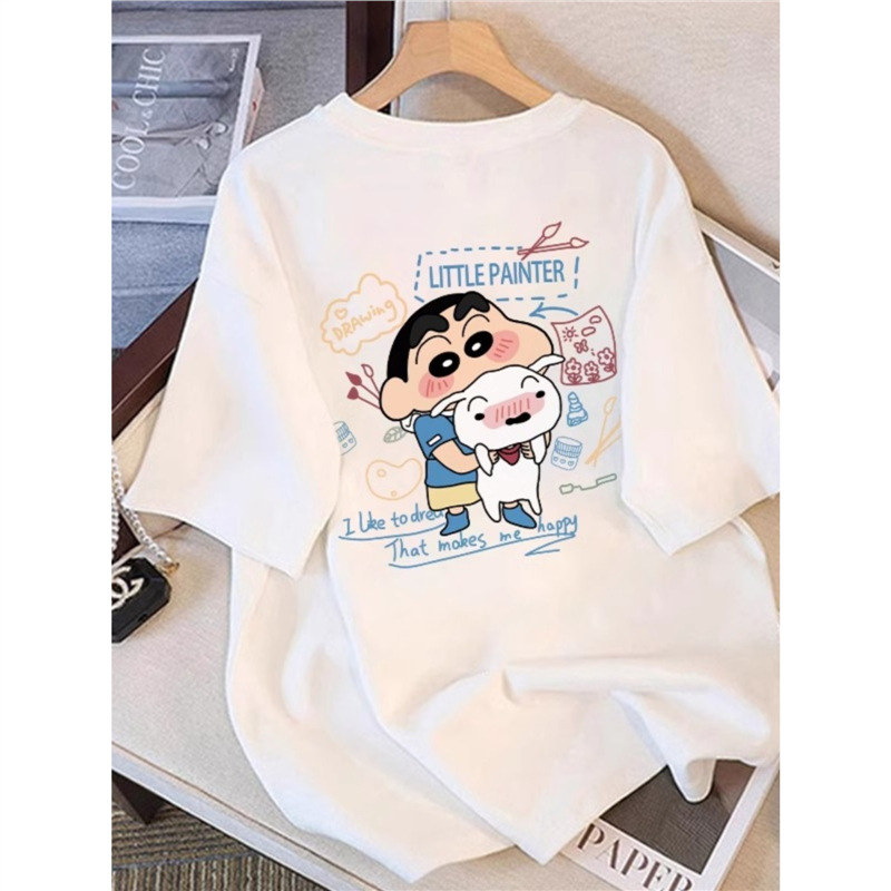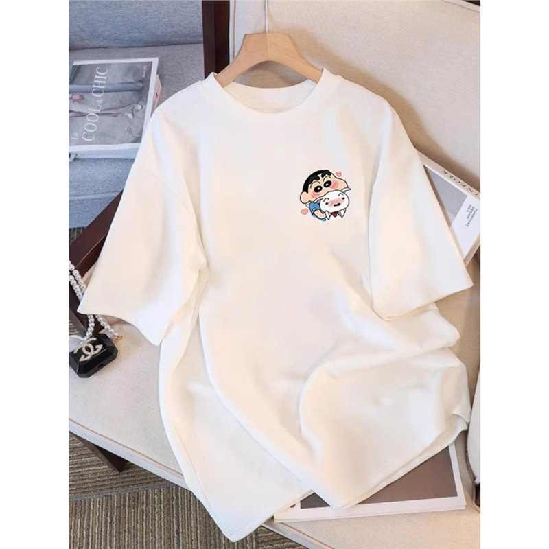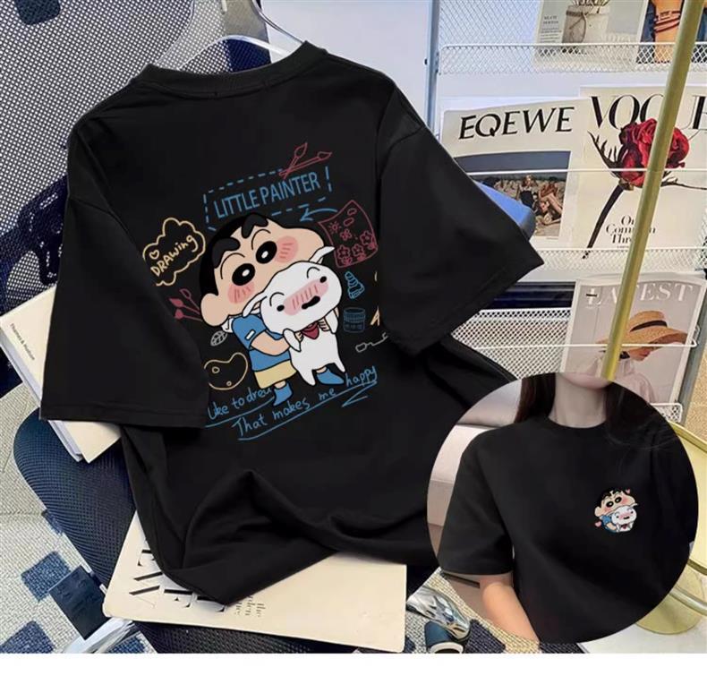 플러스 사이즈 코튼 반팔 티셔츠 여성용 2025 년 여름 새 크레용 작은 새 만화 디자인 감각 느슨한 반소매 탑스토어 가기