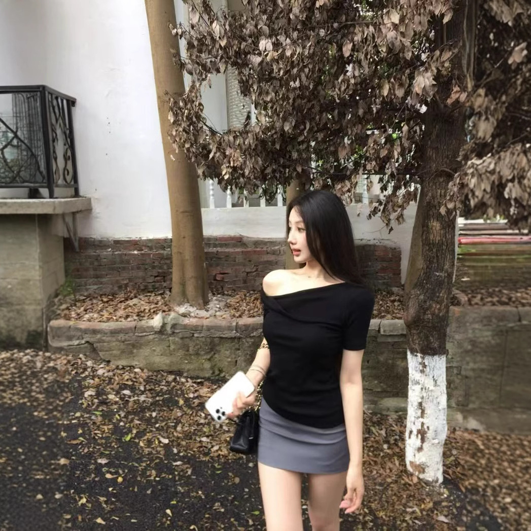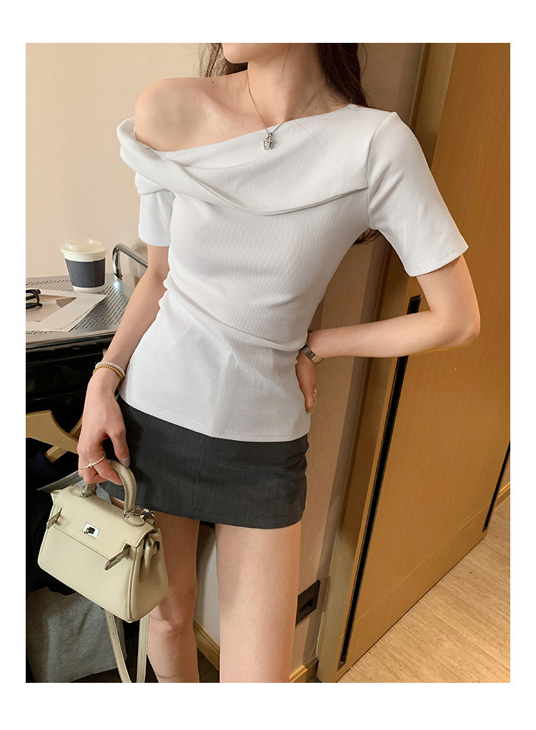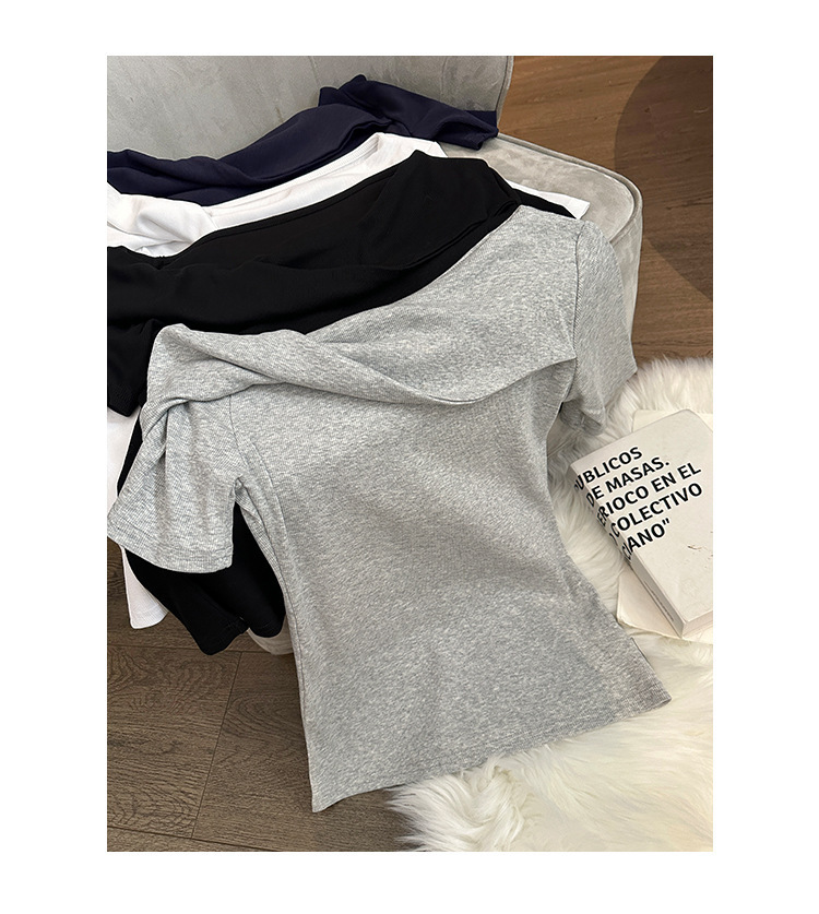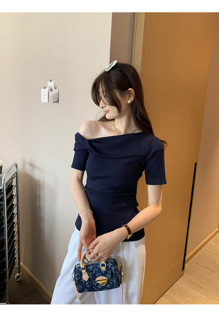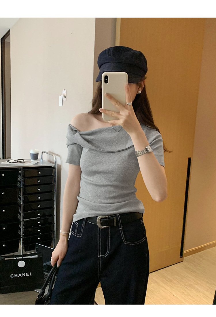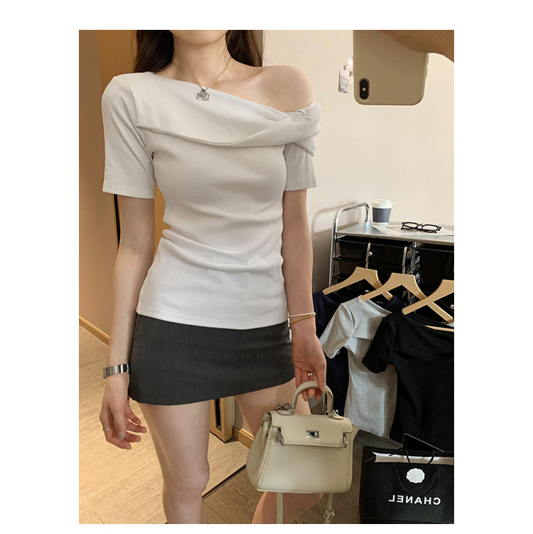 한국 스타일 핫 걸 꼬인 주름 디자인 반팔 티셔츠 여성 2025 년 여름 새로운 슬림핏 퓨어 숄더 탑스토어 가기