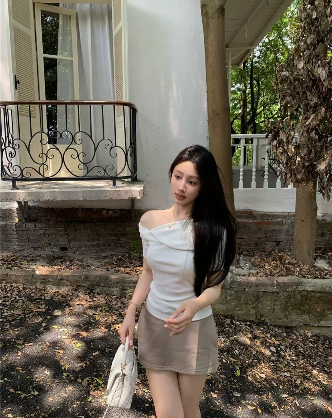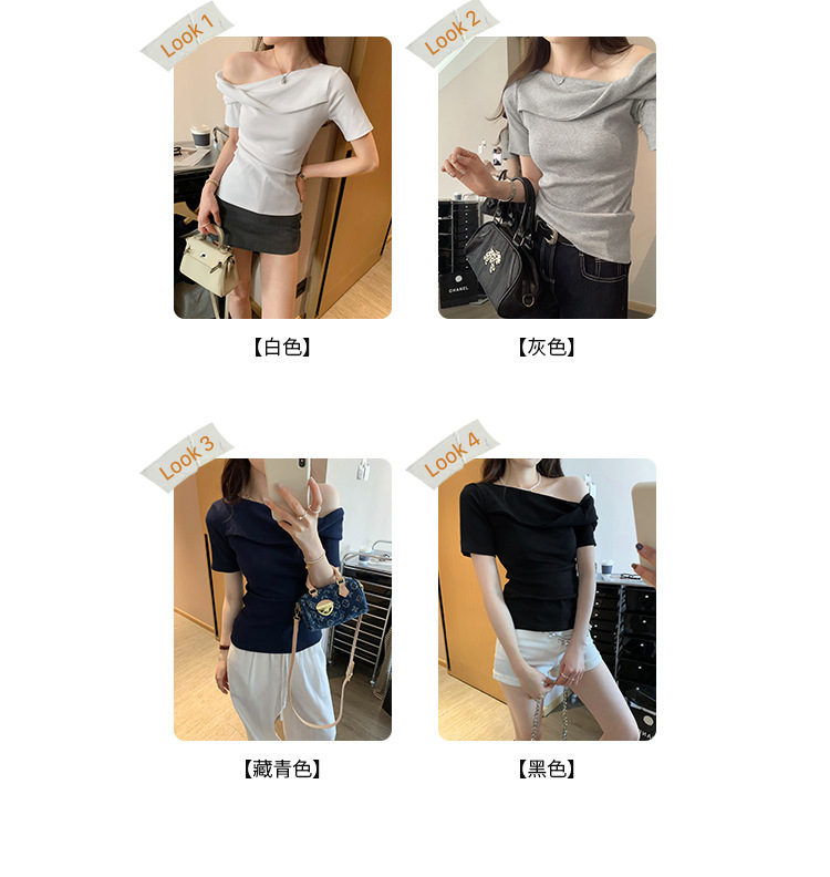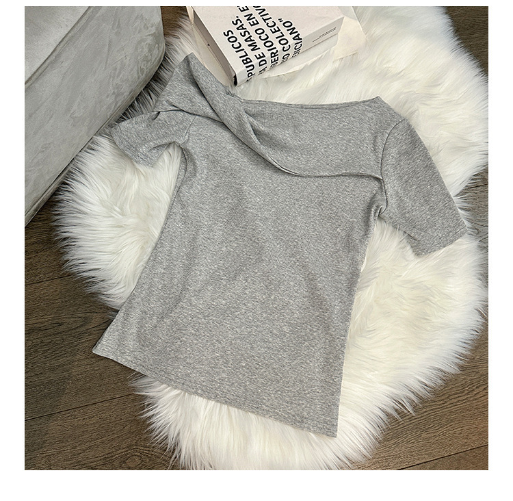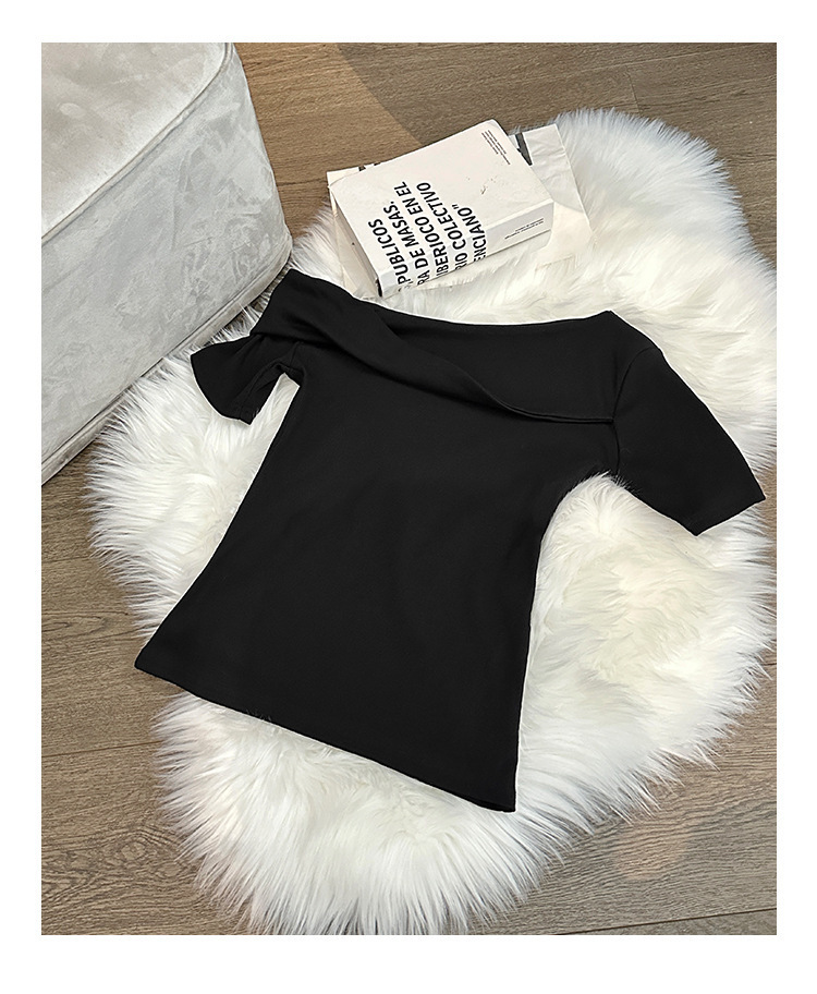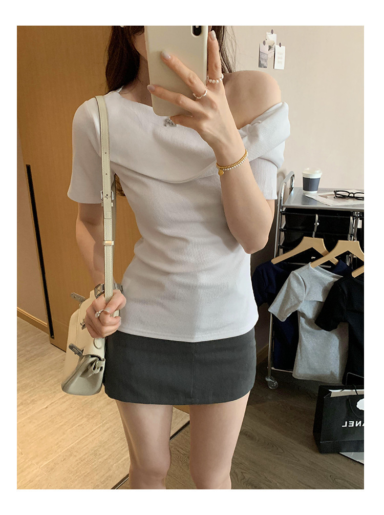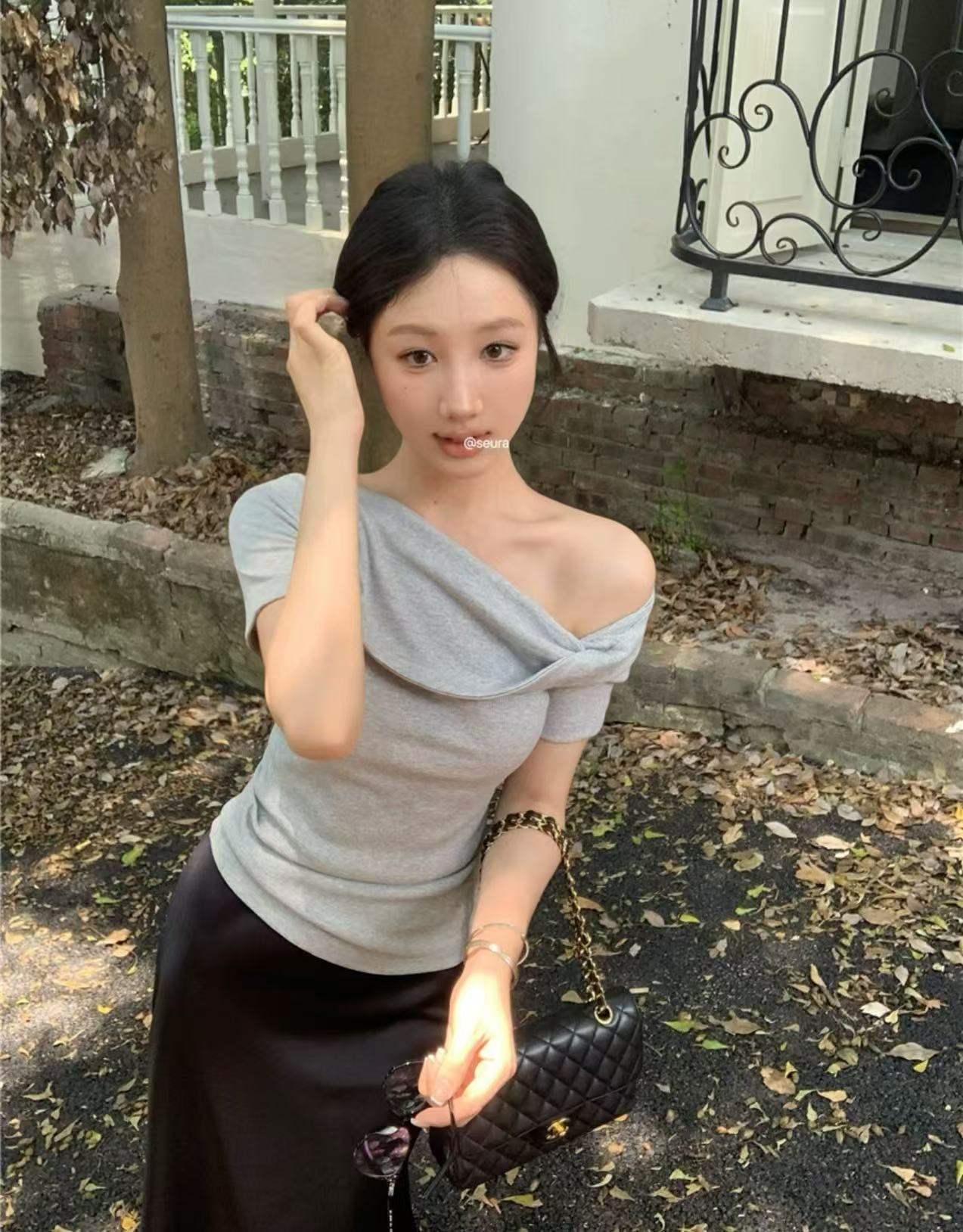 한국 스타일 핫 걸 꼬인 주름 디자인 반팔 티셔츠 여성 2025 년 여름 새로운 슬림핏 퓨어 숄더 탑스토어 가기