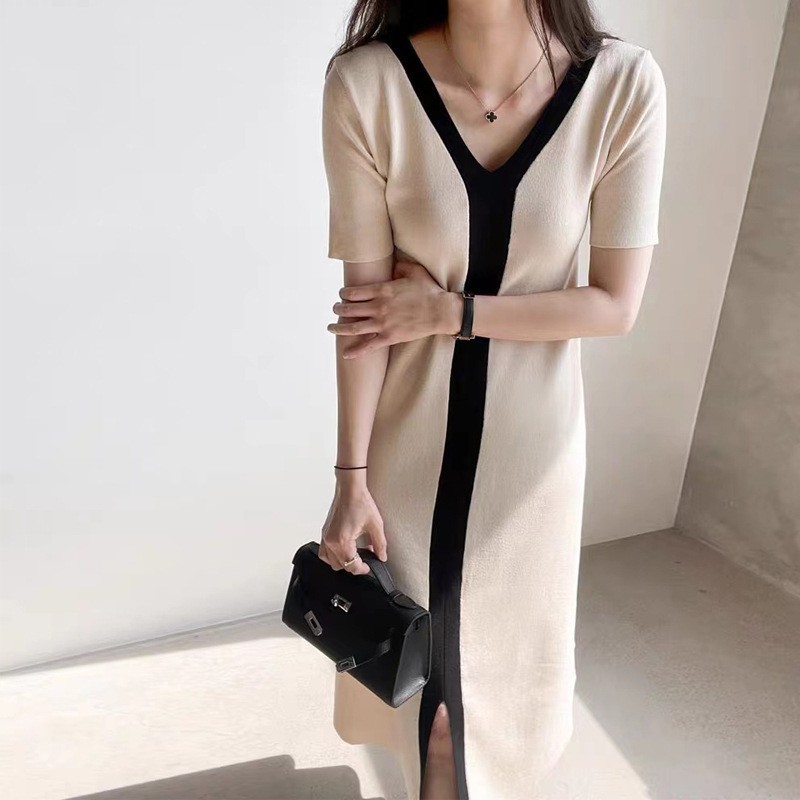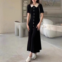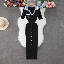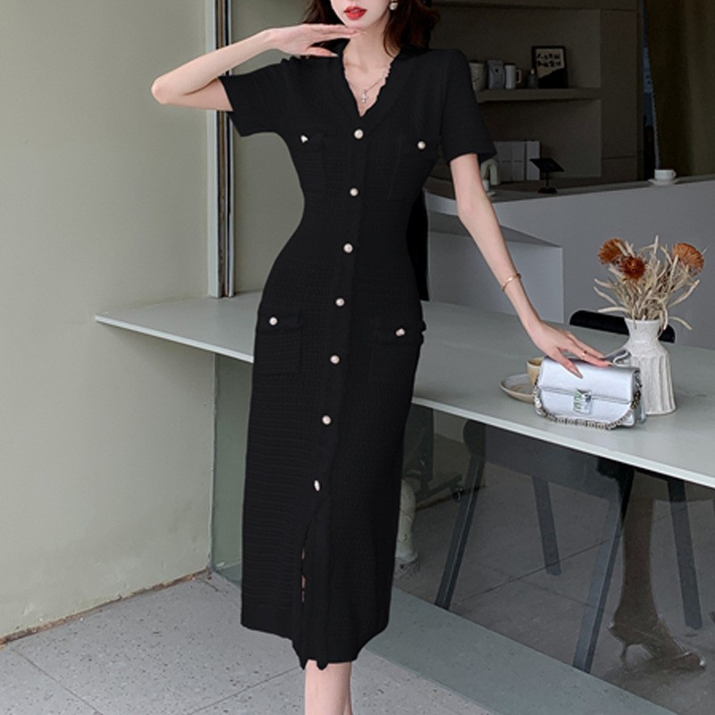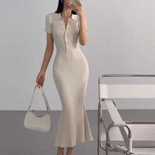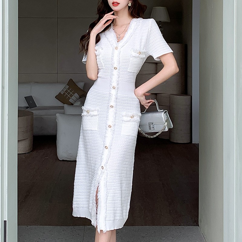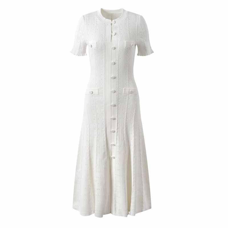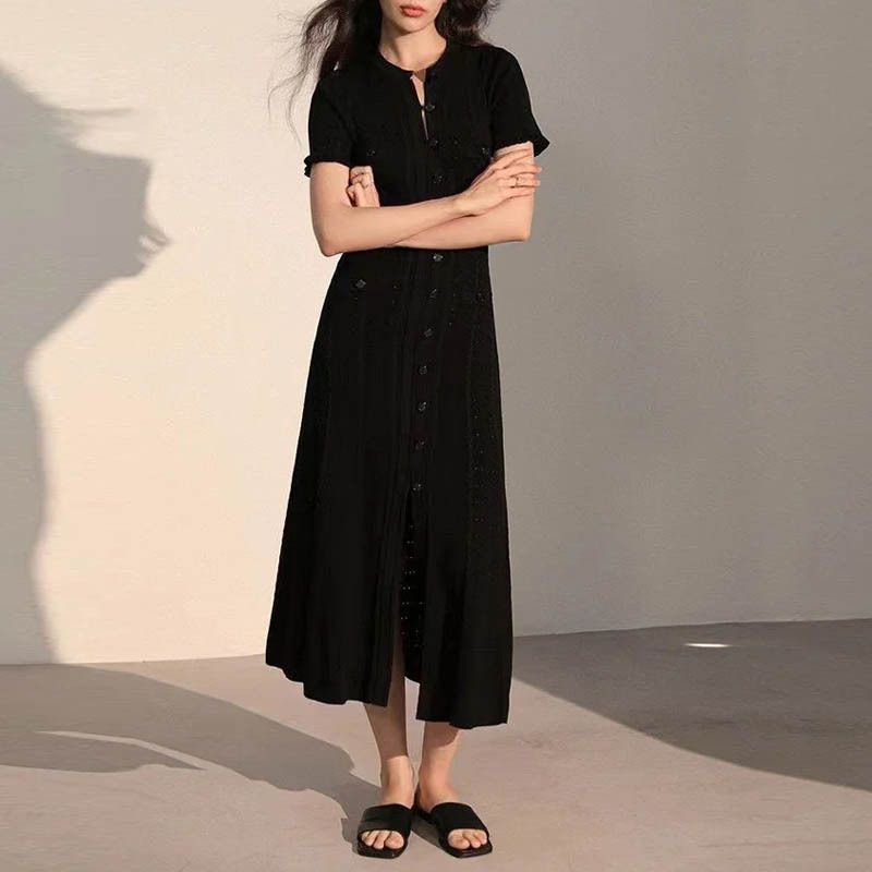 국경 간 우아한 둥근 목 반팔 니트 원피스 유행 버튼 할로우 아웃 긴 원피스 슬림 핏 타이트 허리 슬리밍 원피스스토어 가기