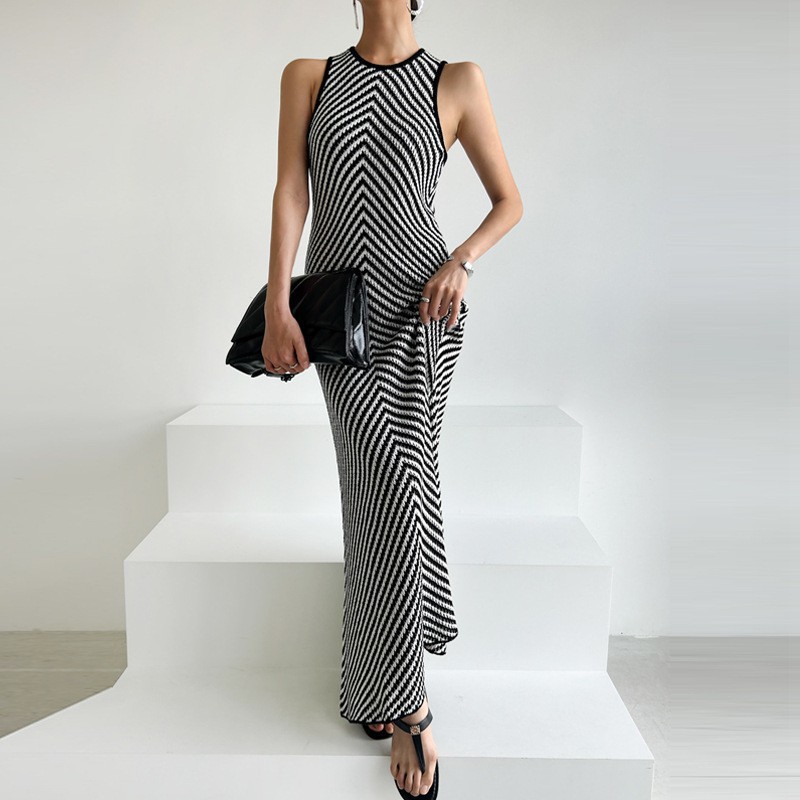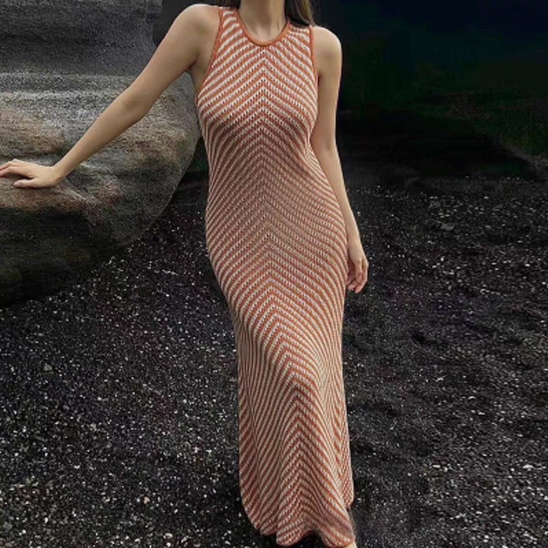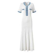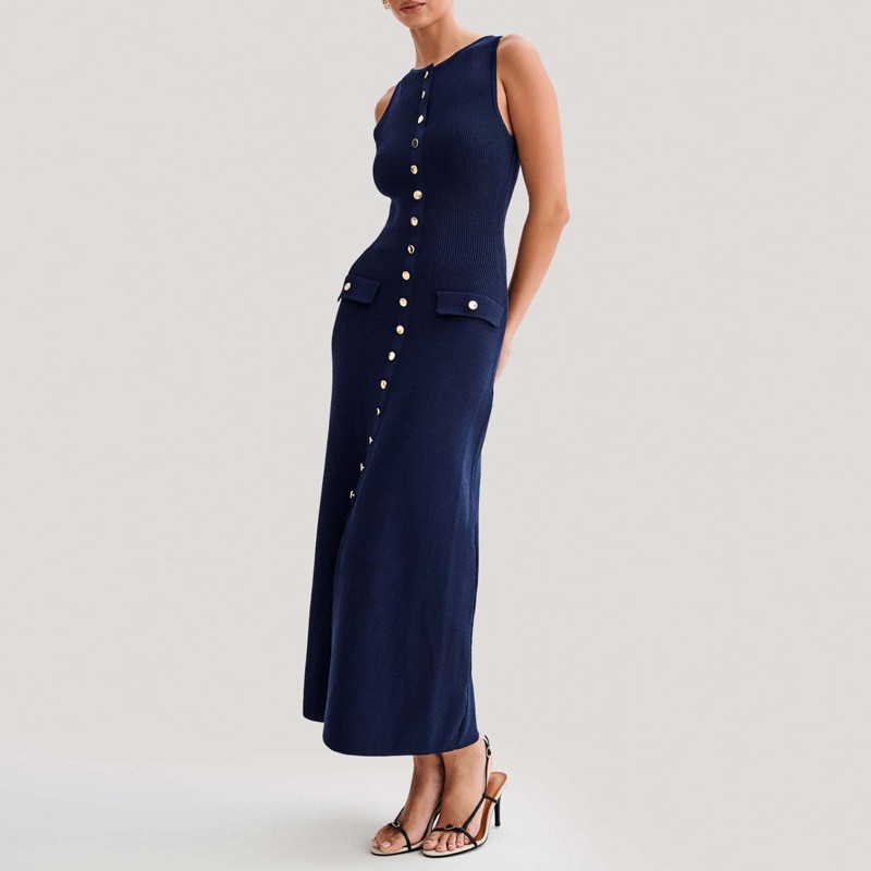 국경 간 우아한 둥근 목 반팔 니트 원피스 유행 버튼 할로우 아웃 긴 원피스 슬림 핏 타이트 허리 슬리밍 원피스