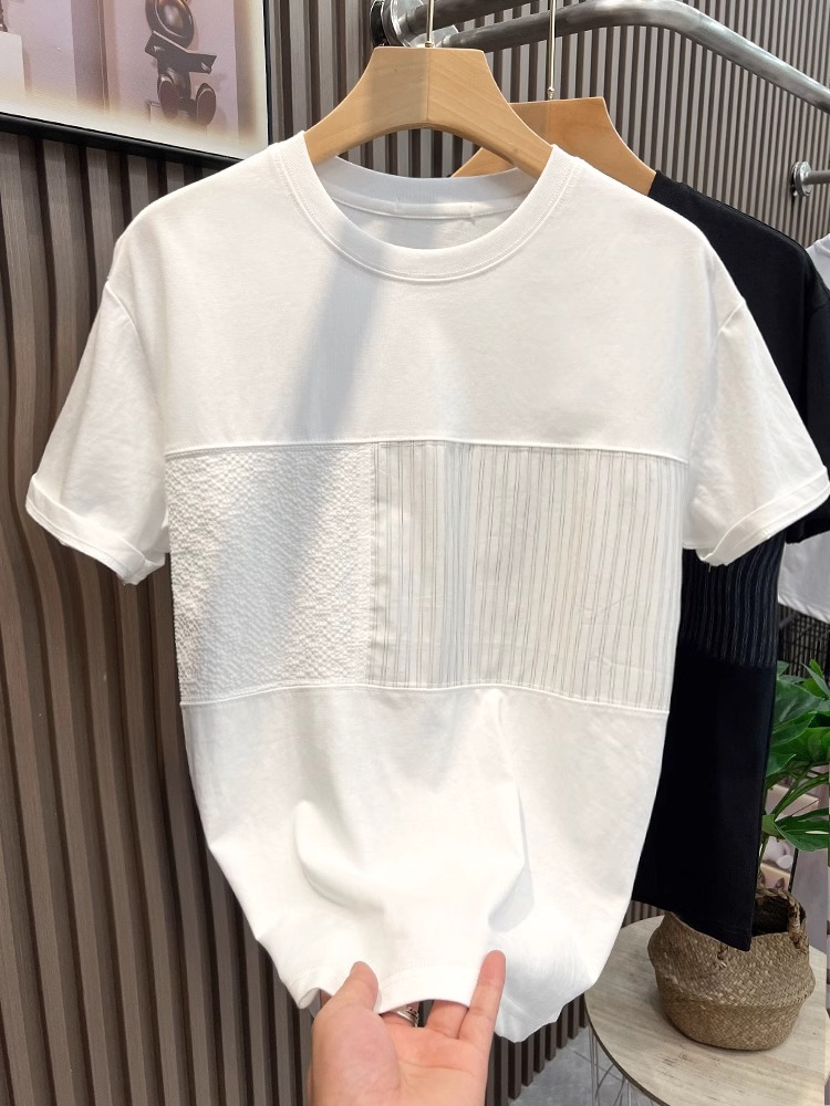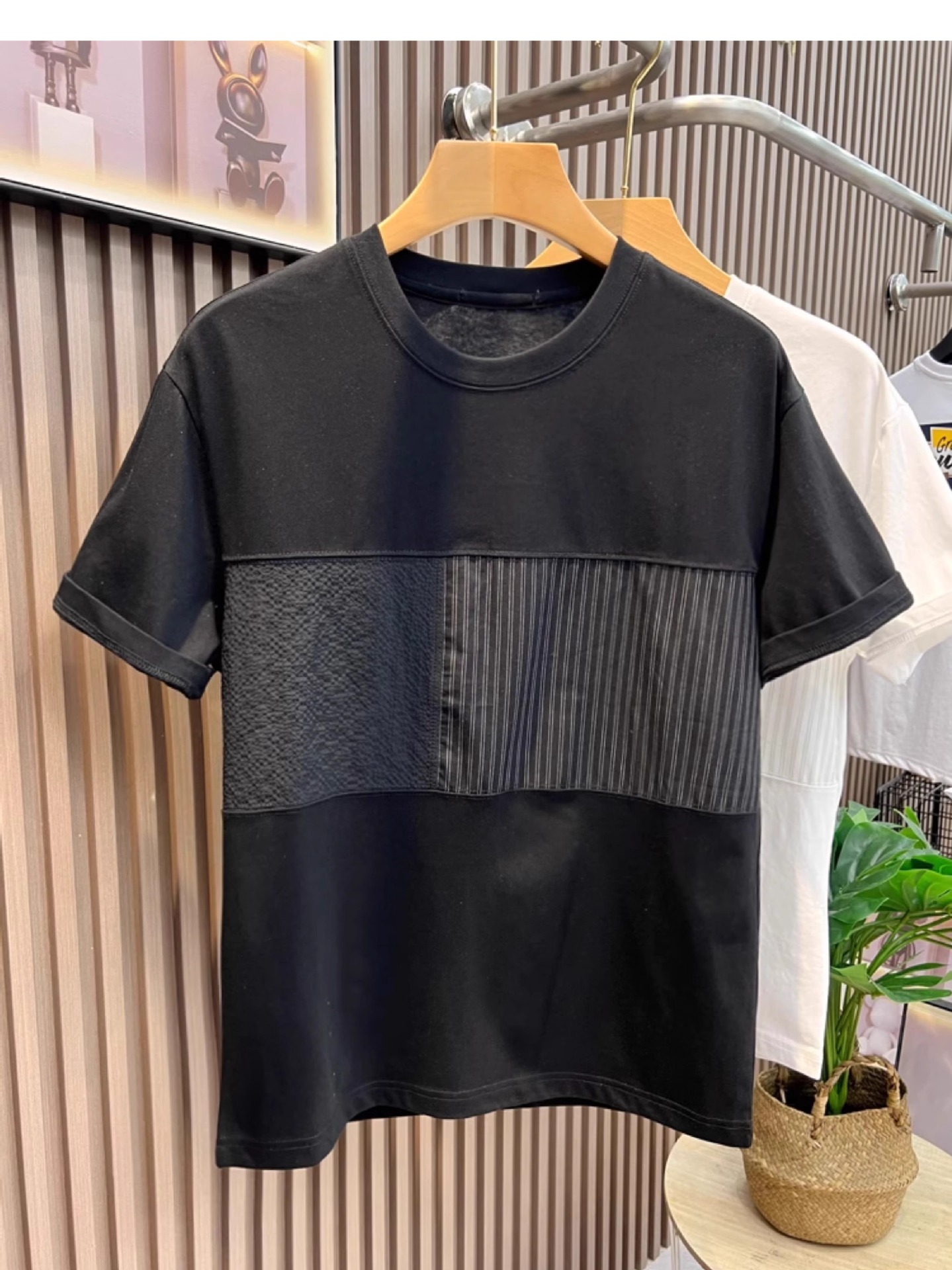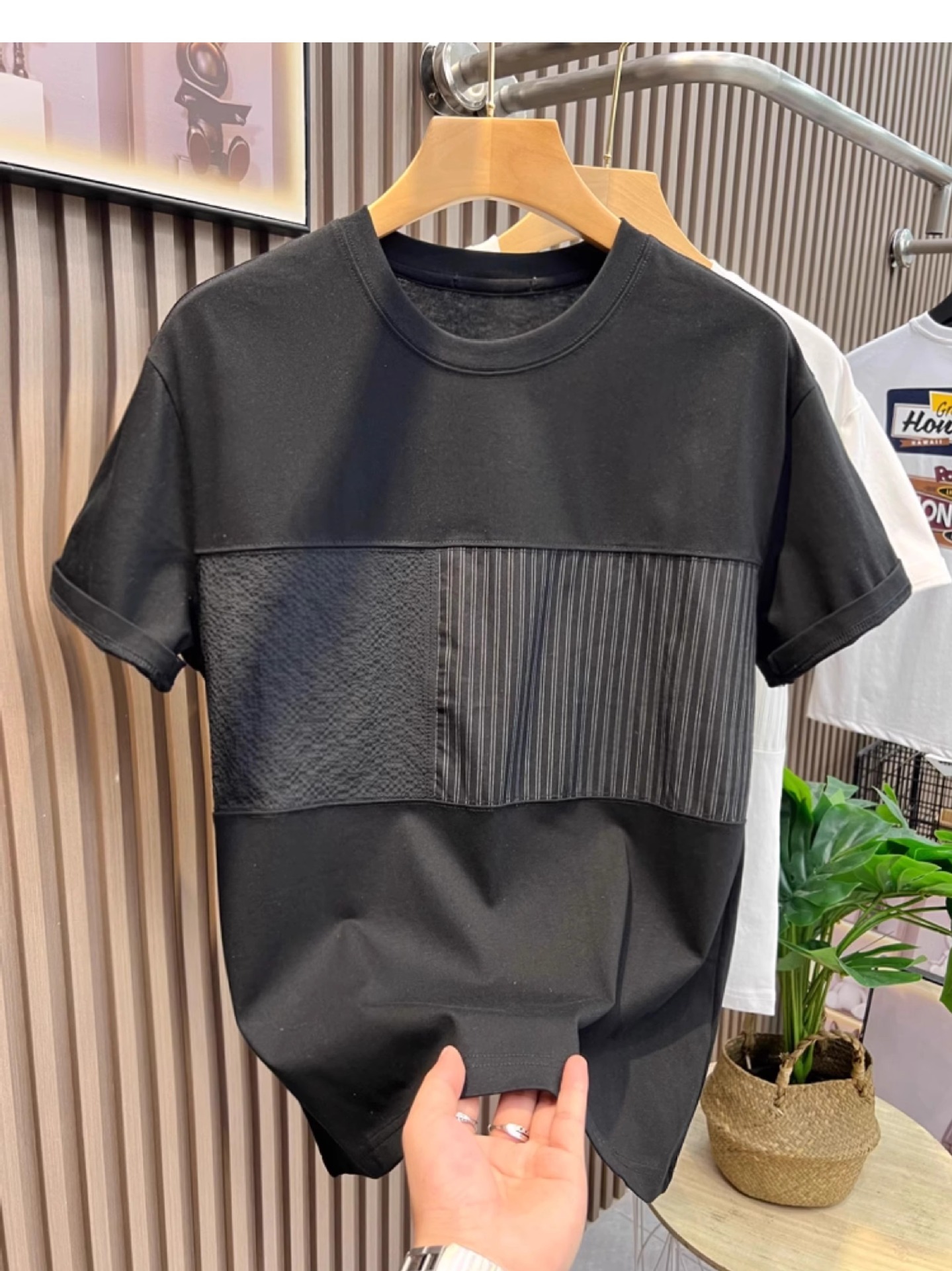 2025 새로운 여름 반팔 티셔츠 남자 라운드 넥 틈새 복고풍 국가 트렌드 잘 생긴 스플 라이스 솔리드 컬러 하이 엔드 반팔 셔츠