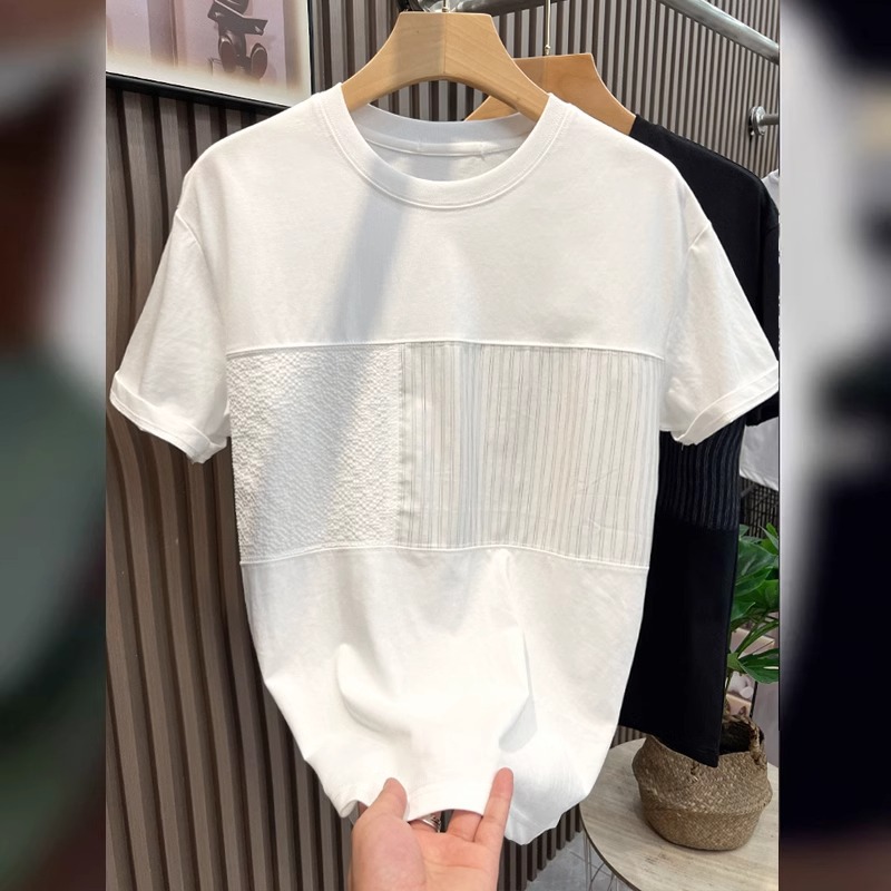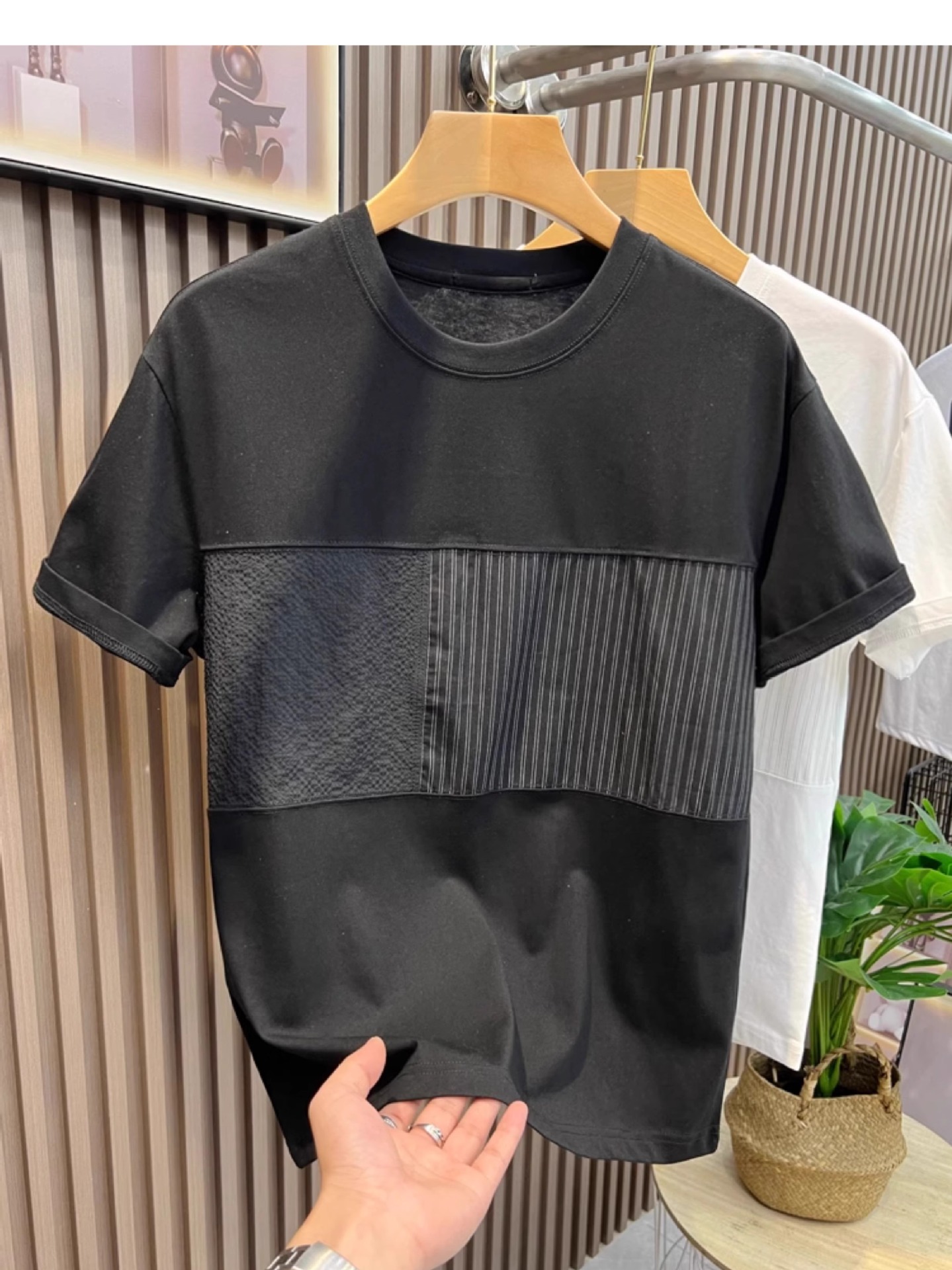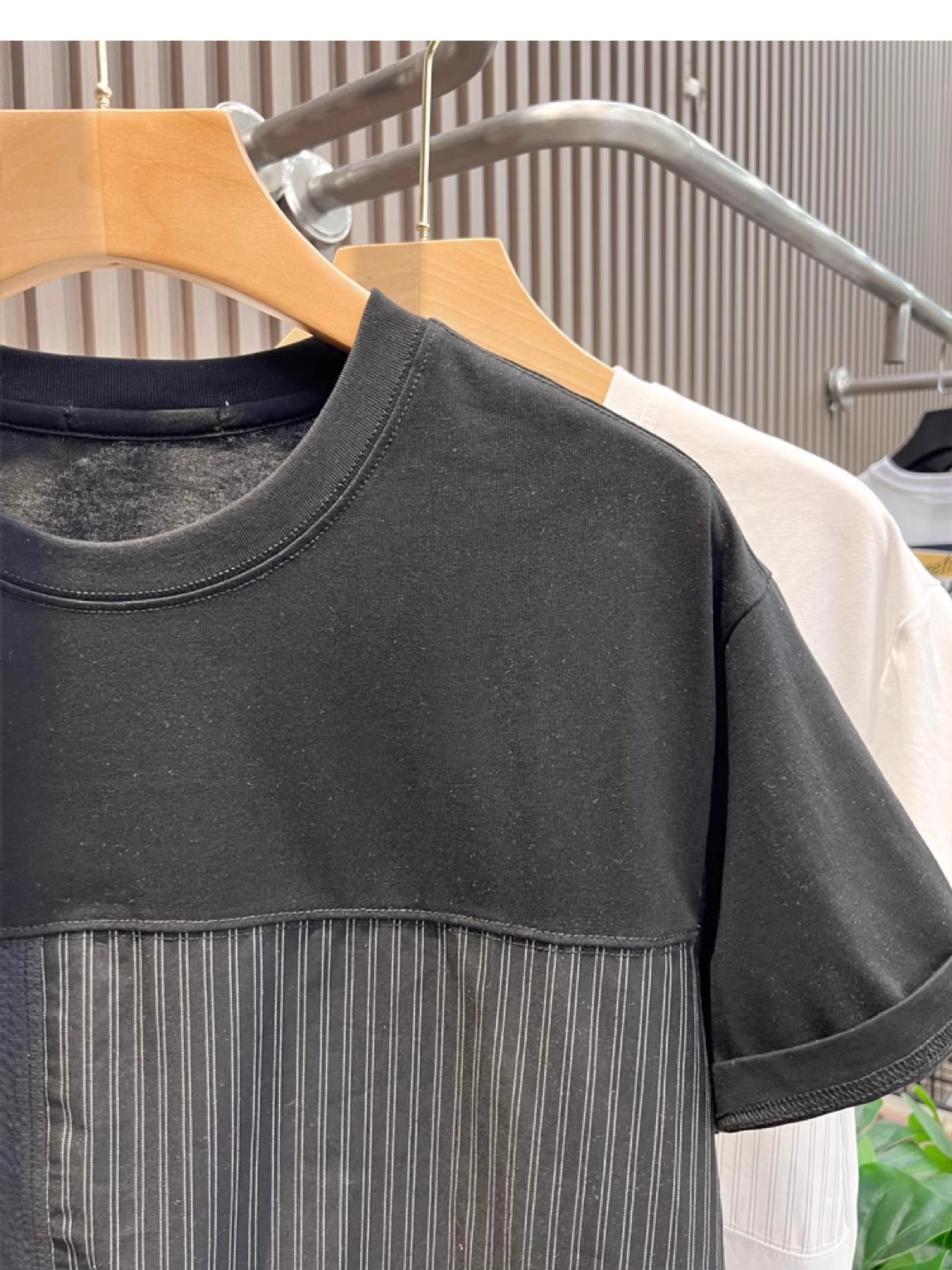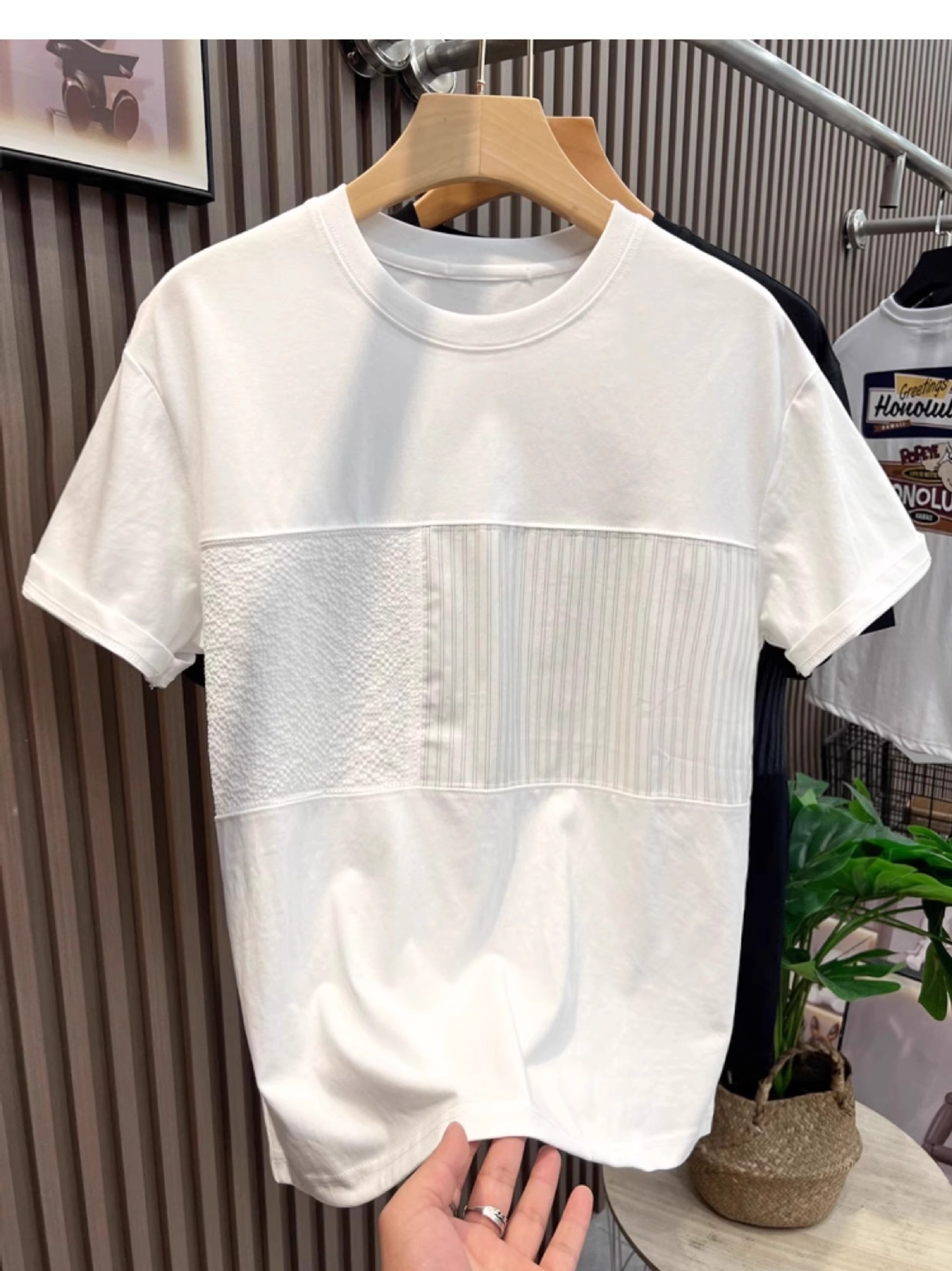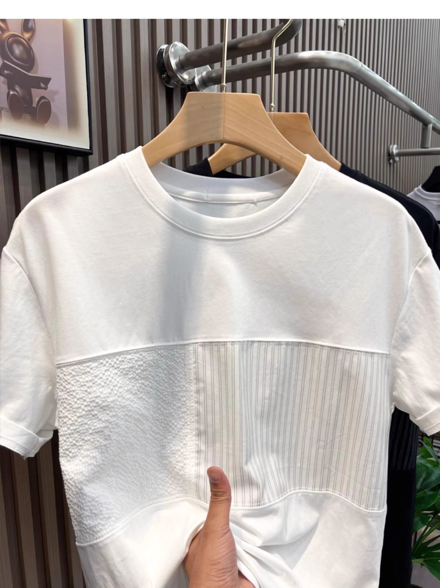 2025 새로운 여름 반팔 티셔츠 남자 라운드 넥 틈새 복고풍 국가 트렌드 잘 생긴 스플 라이스 솔리드 컬러 하이 엔드 반팔 셔츠스토어 가기