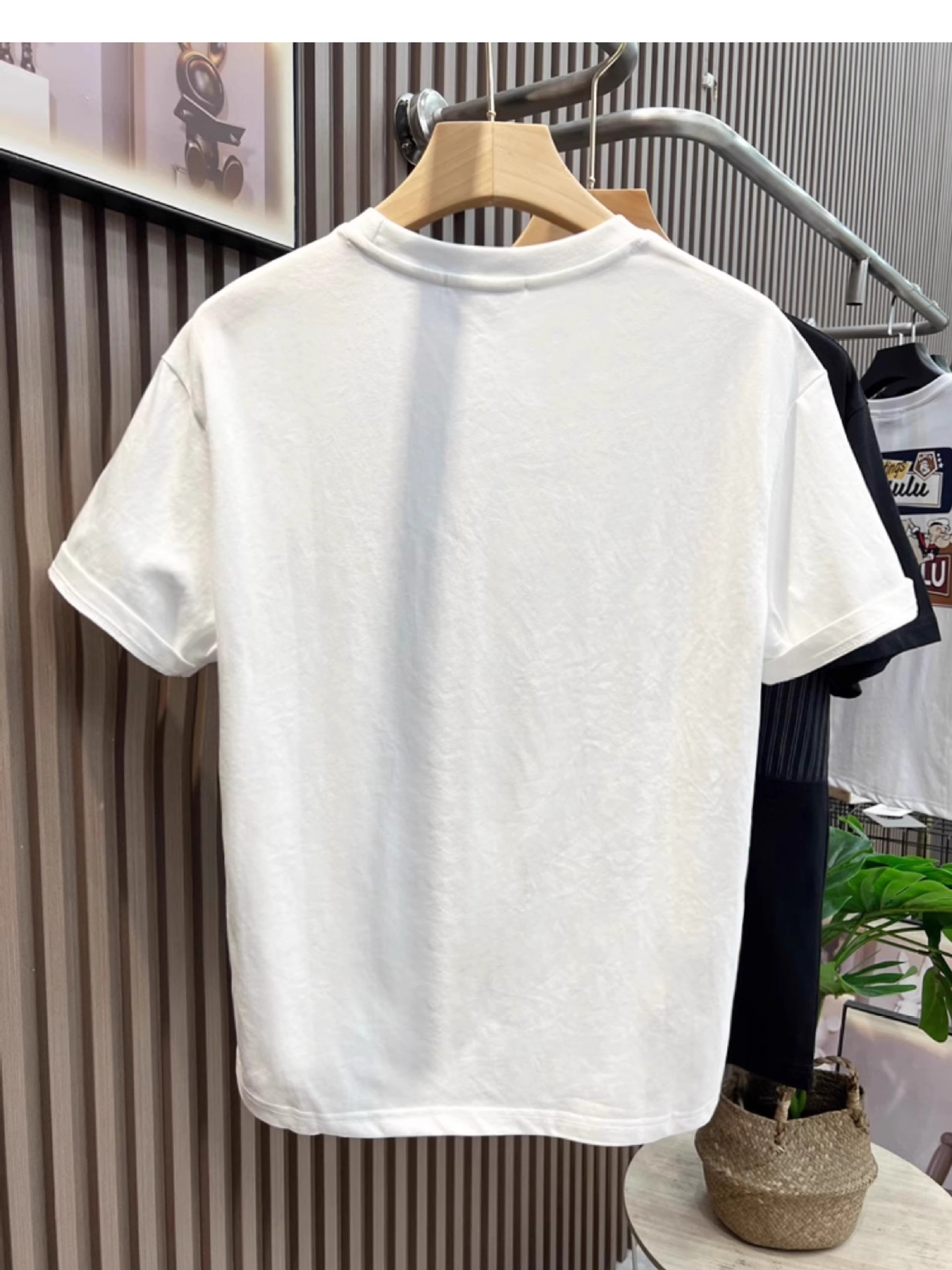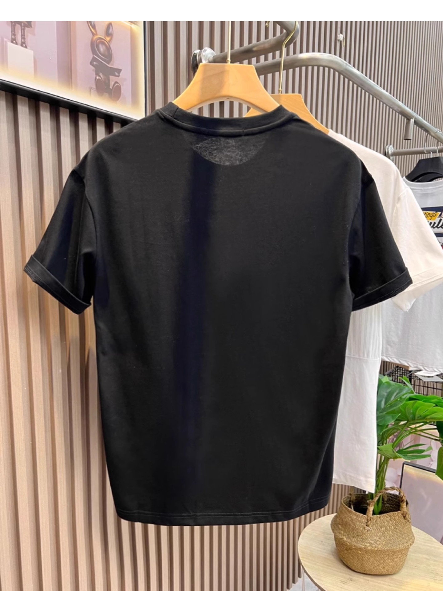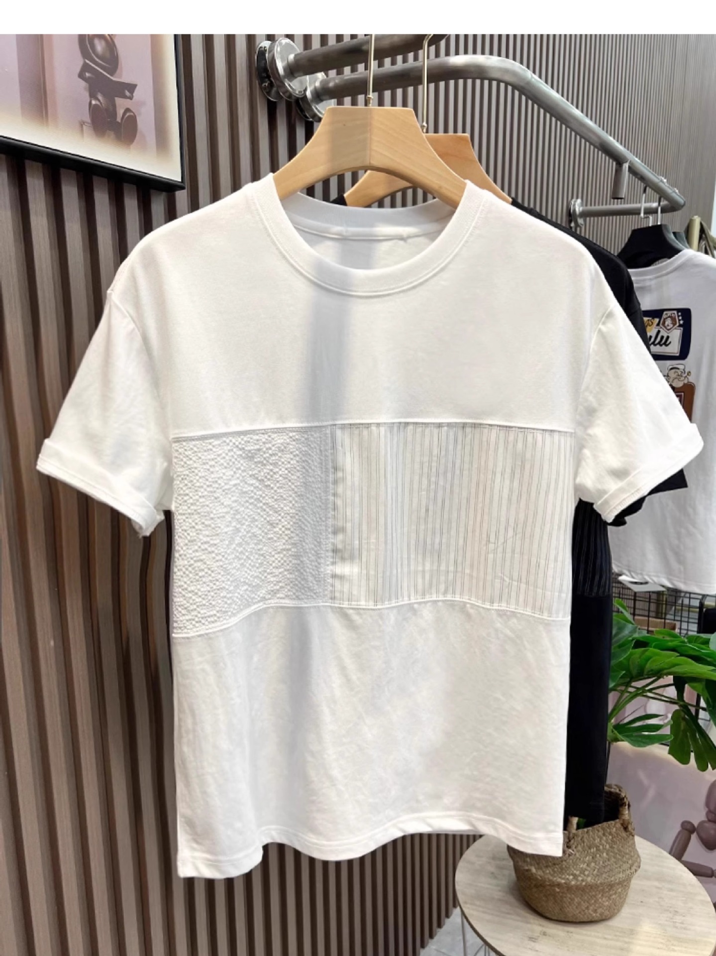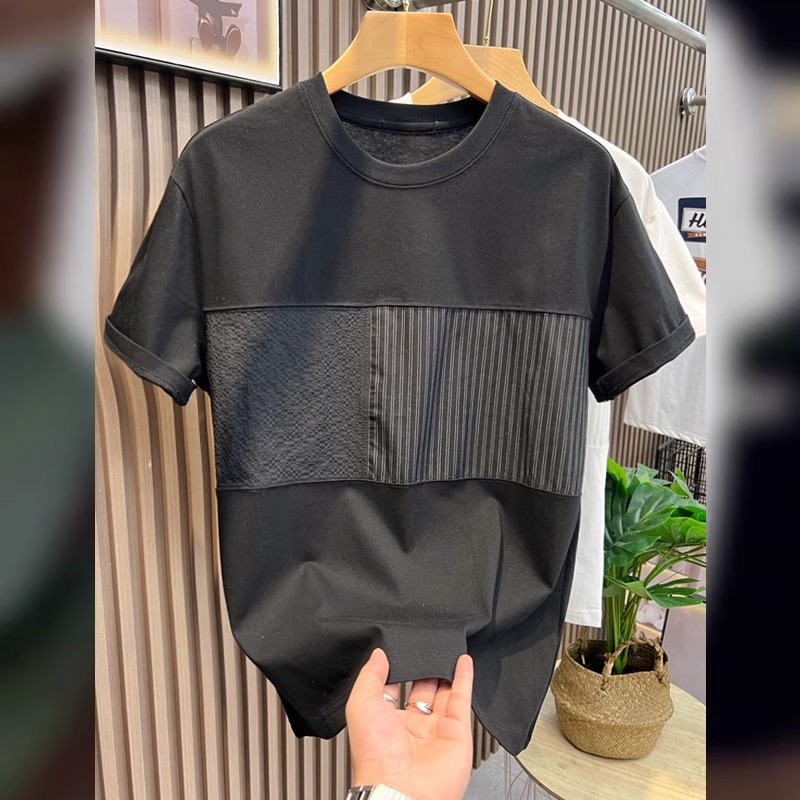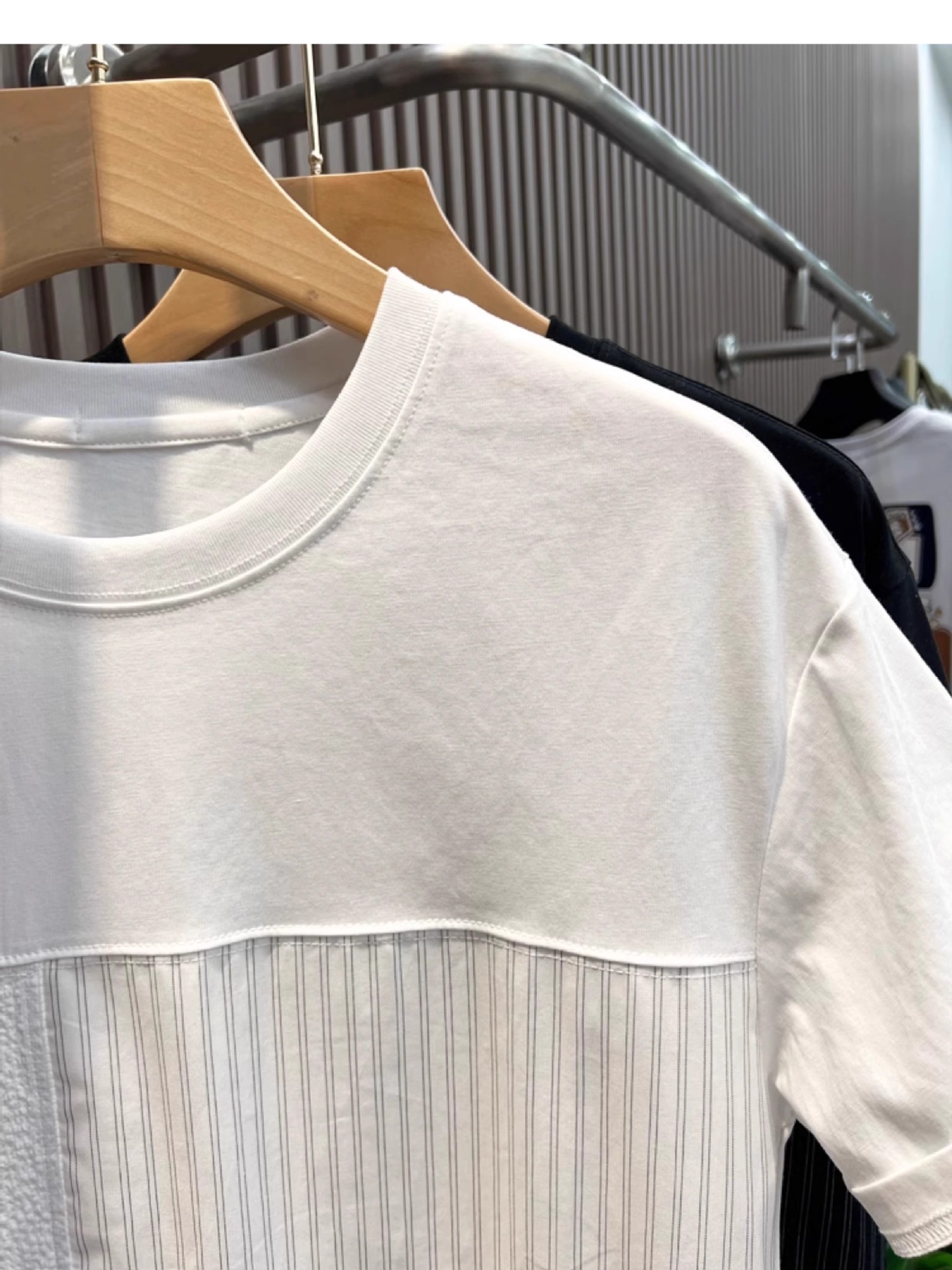2025 새로운 여름 반팔 티셔츠 남자 라운드 넥 틈새 복고풍 국가 트렌드 잘 생긴 스플 라이스 솔리드 컬러 하이 엔드 반팔 셔츠스토어 가기